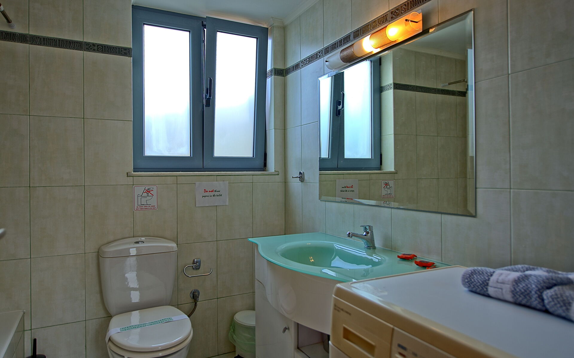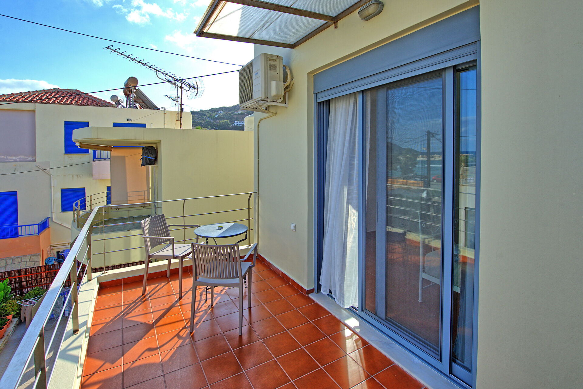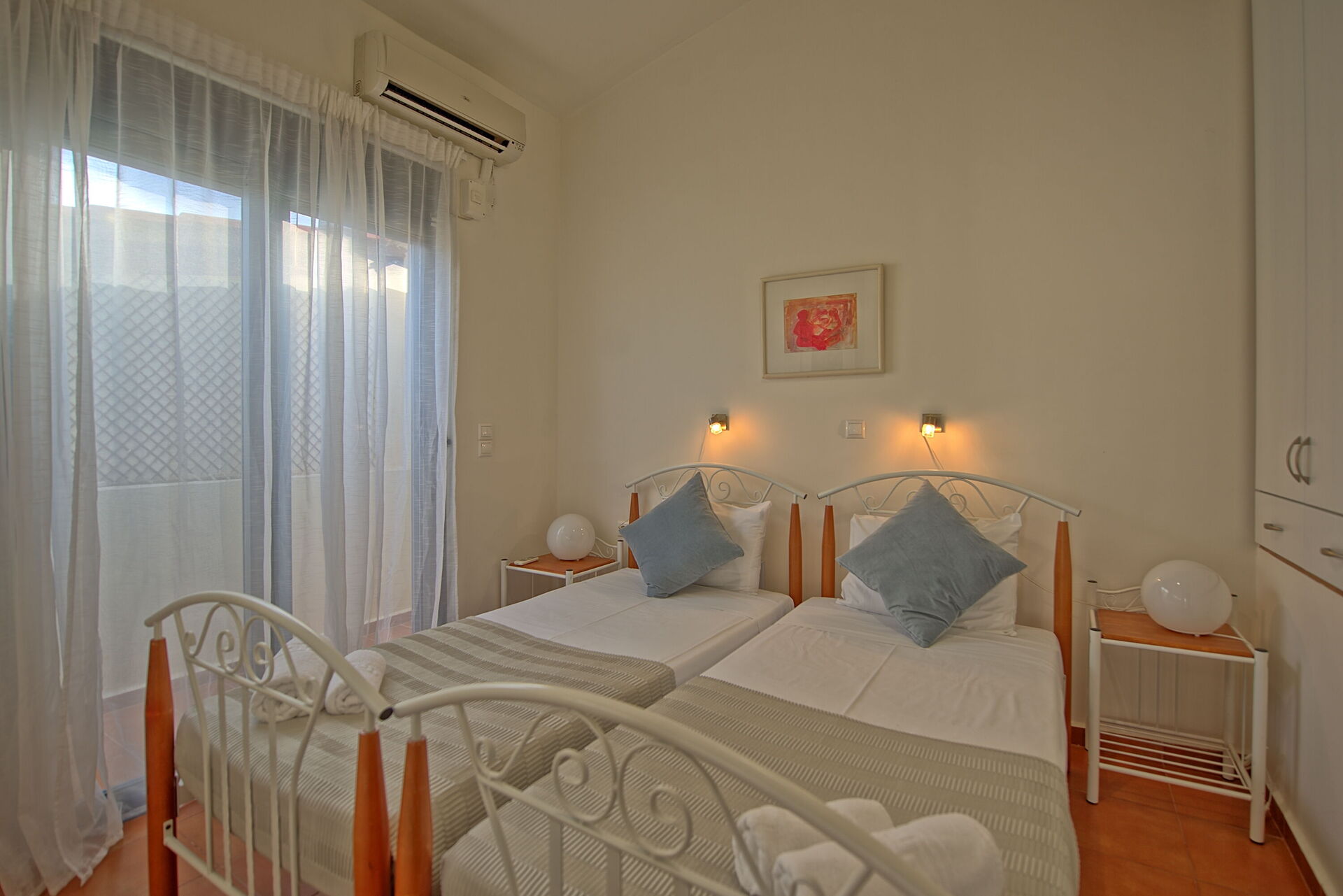 Primo piano: camera matrimoniale (aria condizionata) con terrazza privata, bagno con vasca e lavatrice, camera (aria condizionata) con 2 letti singoli e balcone privato, accesso a piccola terrazza attrezzata con 2 lettini prendisole.