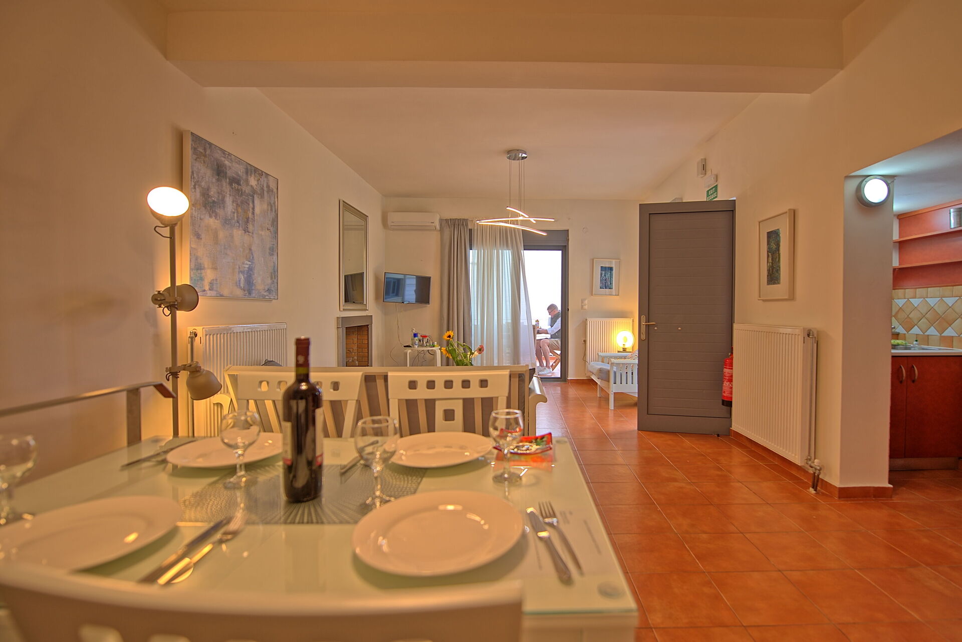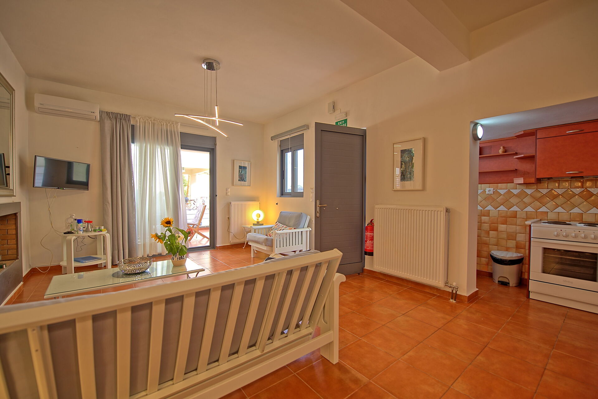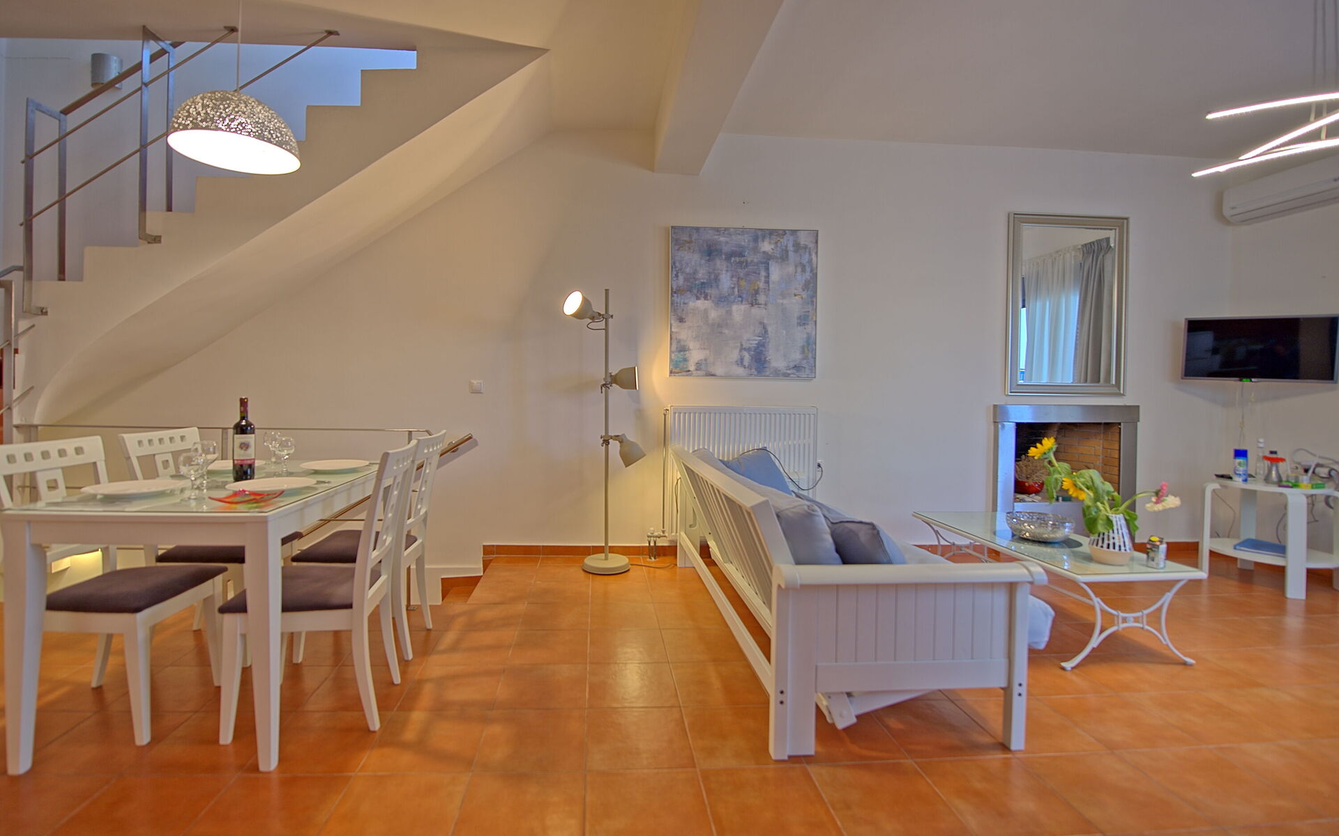 Piano terreno rialzato (si sale 6 gradini): soggiorno (aria condizionata) con camino e TV satellitare e accesso a terrazza privata ed attrezzata con tavolo, sedie e barbecue per mangiare all'aria aperta, zona pranzo e angolo cottura (forno, freezer, microonde, lavastoviglie), bagno con doccia.