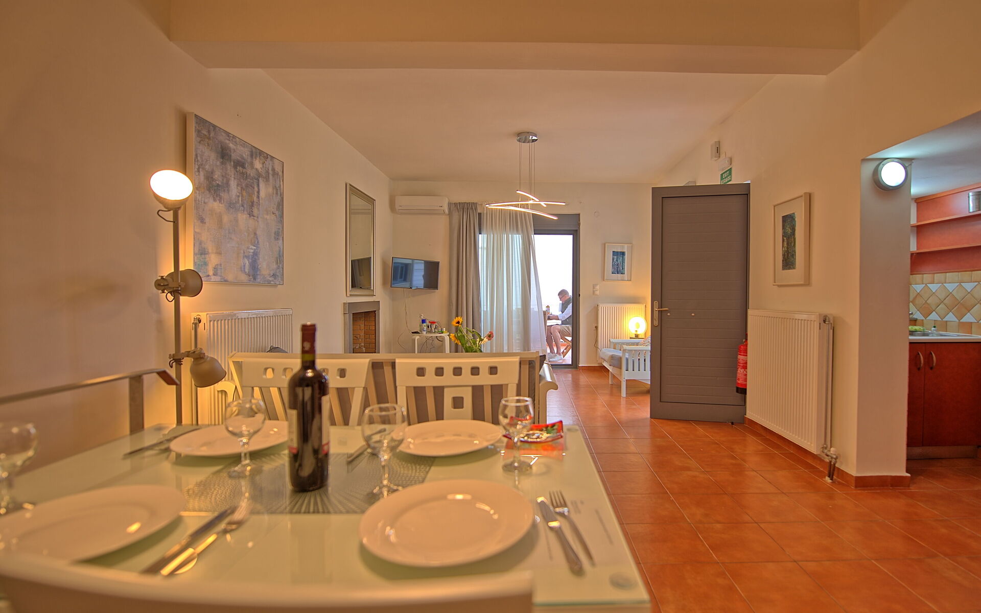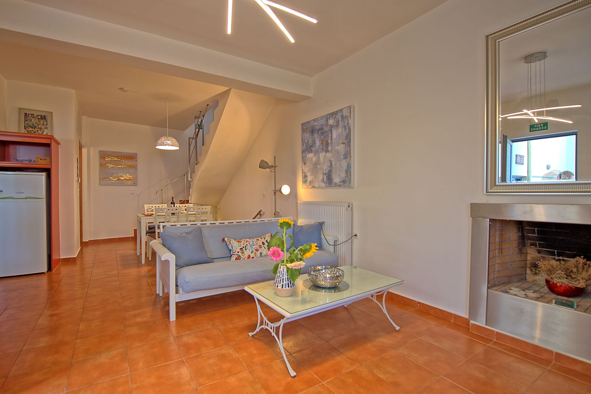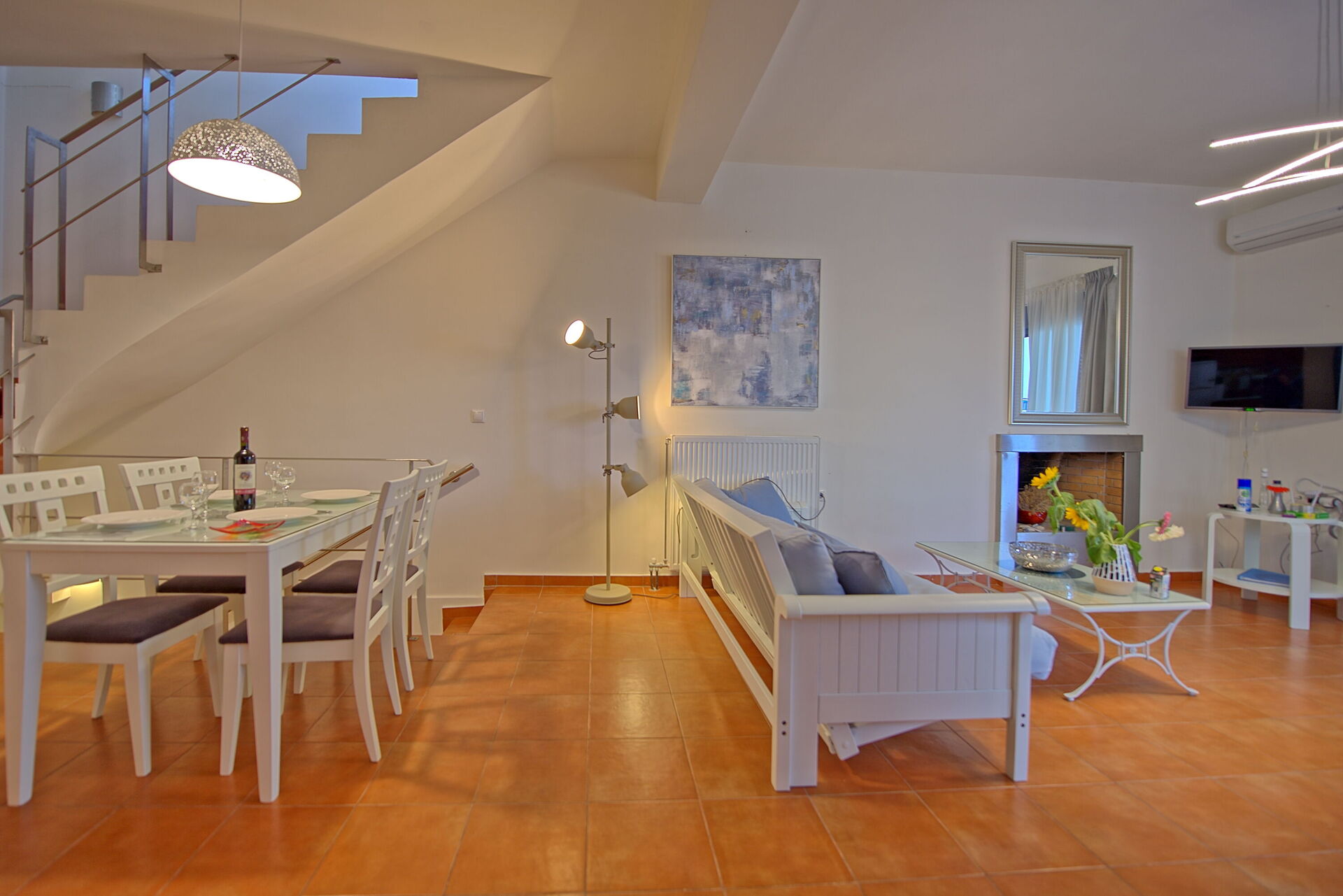 Piano terreno rialzato (si sale 6 gradini): soggiorno (aria condizionata) con camino e TV satellitare e accesso a terrazza privata ed attrezzata con tavolo, sedie e barbecue per mangiare all'aria aperta, zona pranzo e angolo cottura (forno, freezer, microonde, lavastoviglie), bagno con doccia.