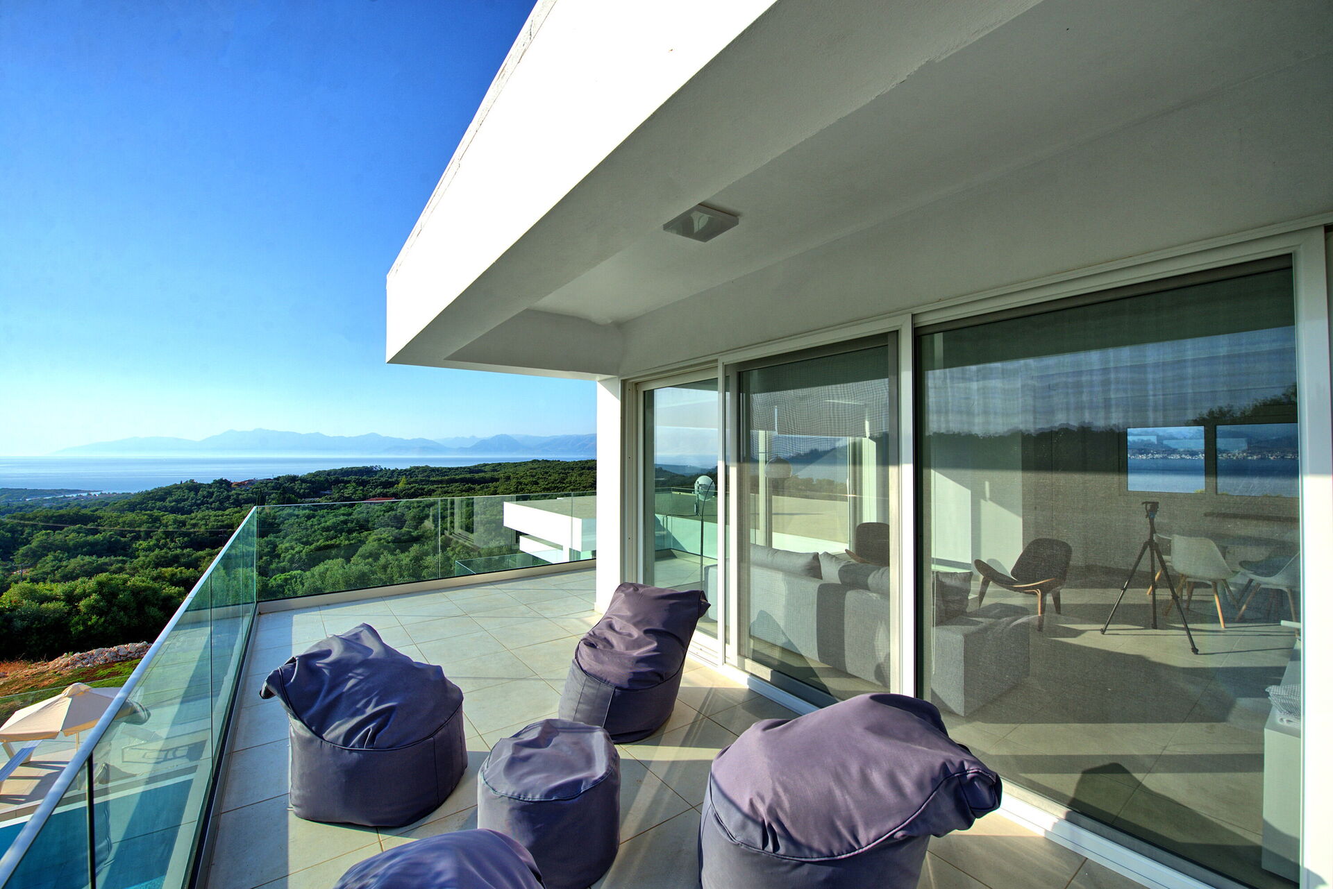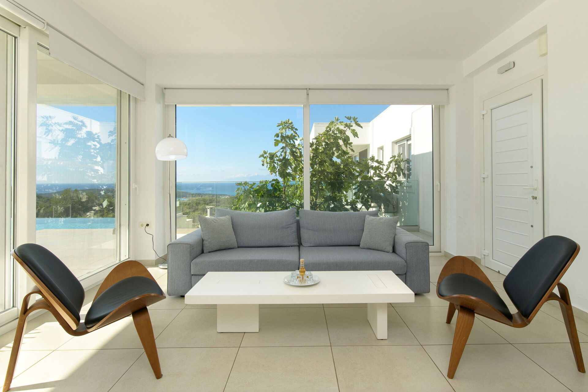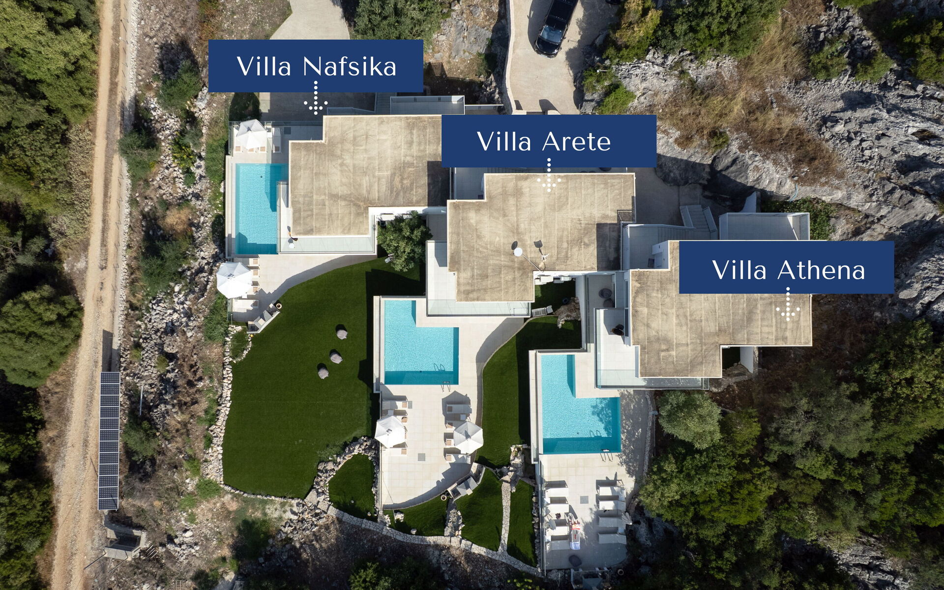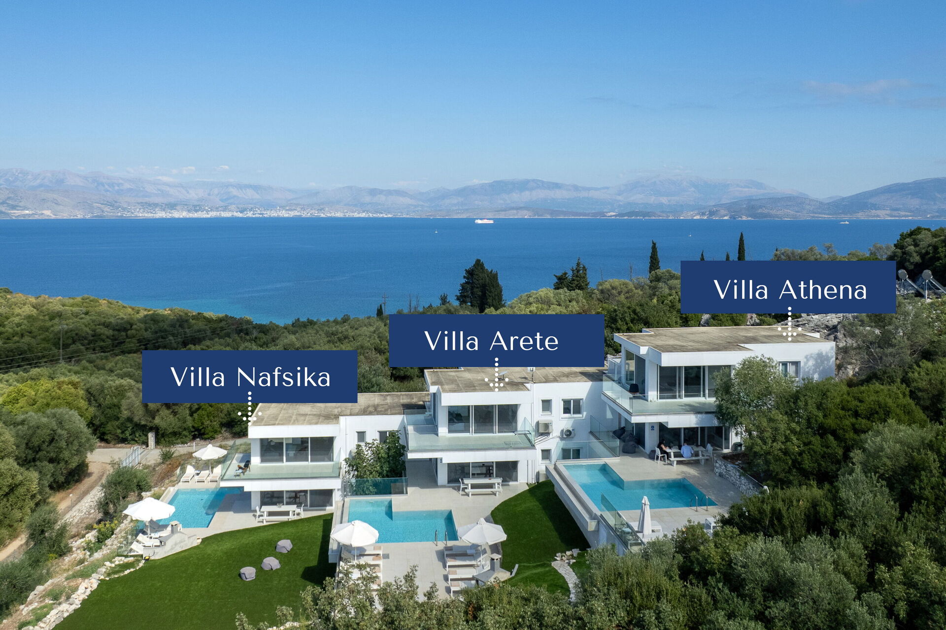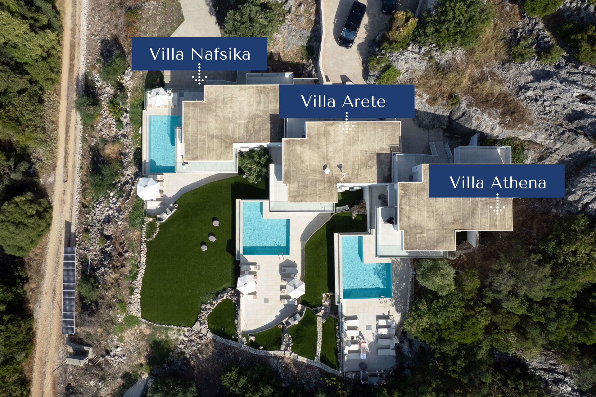 Grazie alle sue grandi vetrate Villa Athena gode di tutto il sole e la luce che la Grecia può offrire. Al piano terra c'è un ampio salone con divani, wi-fi e aria condizionata con cucina adiacente completamente attrezzata e 2 camere da letto (entrambe con bagno privato). Una camera da letto ha un letto matrimoniale + un divano (che può essere trasformato in un divano letto singolo full size) mentre l'altra camera è doppia. Il piano superiore è identico a quello inferiore, tranne per il fatto che la camera da letto principale ha solo un letto matrimoniale e non un divano letto supplementare. Ampi terrazzi su entrambi i piani offrono una vista magica sul Mar Ionio e sulla costa albanese.