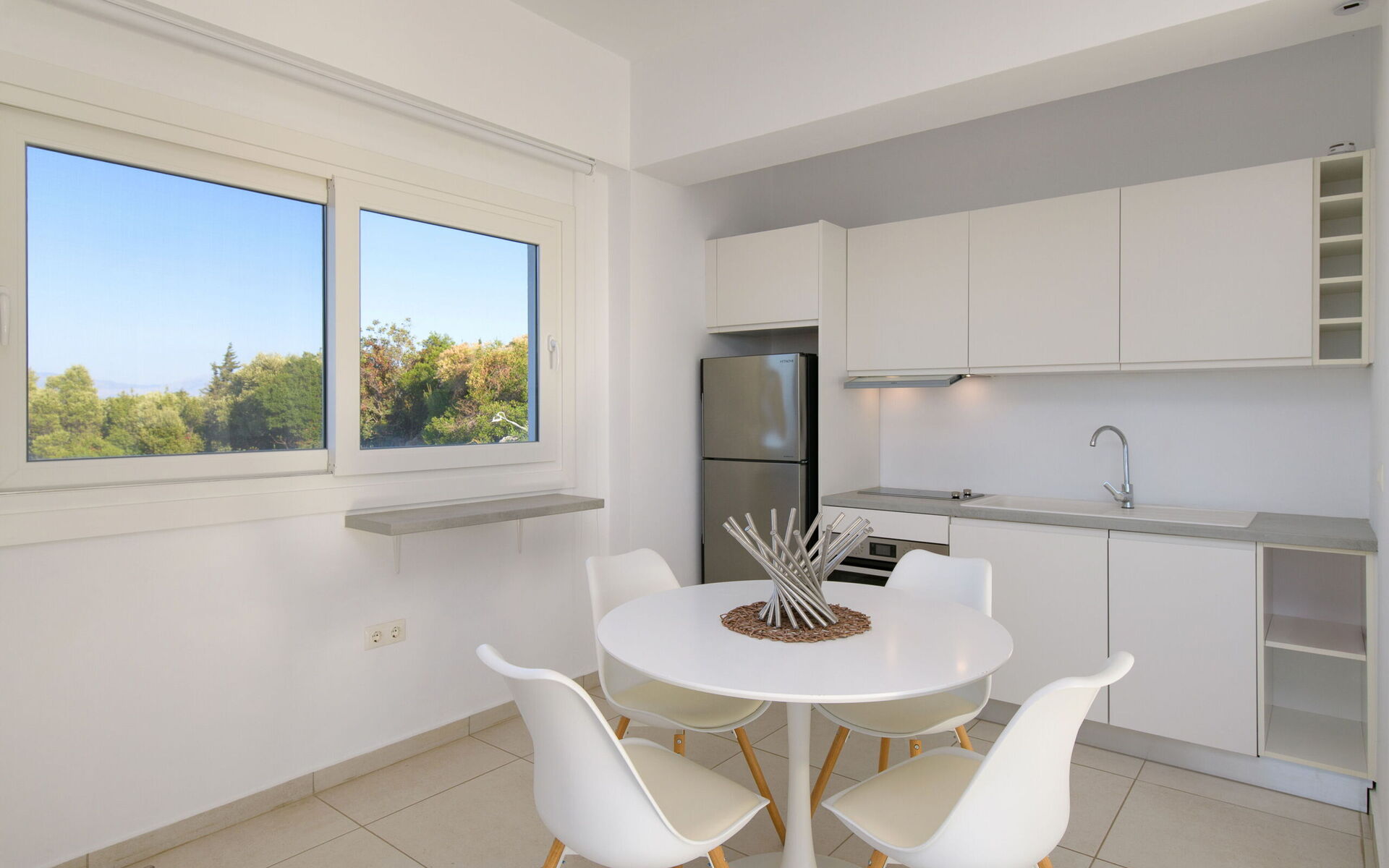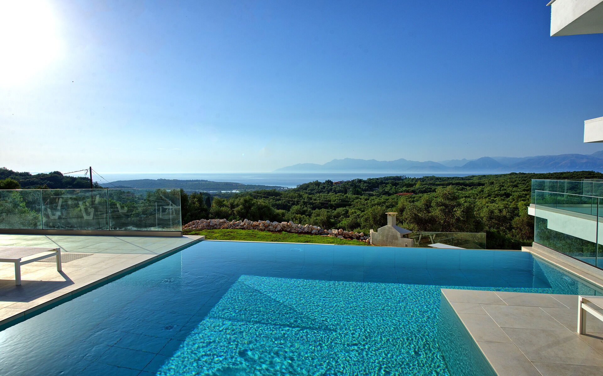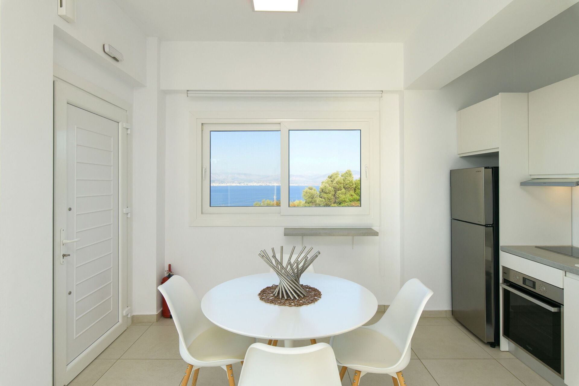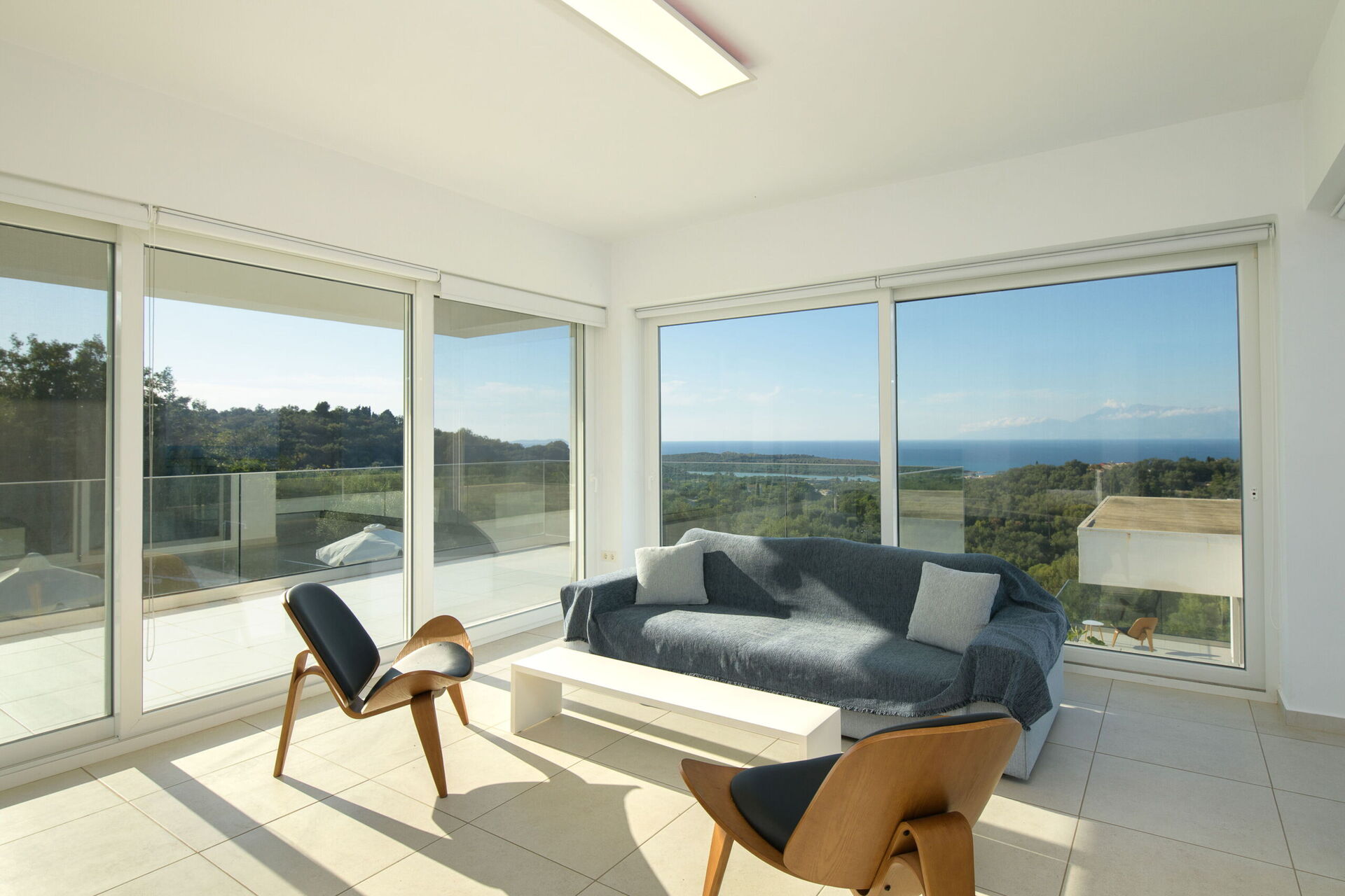 Grazie alle sue grandi vetrate Villa Athena gode di tutto il sole e la luce che la Grecia può offrire. Al piano terra c'è un ampio salone con divani, wi-fi e aria condizionata con cucina adiacente completamente attrezzata e 2 camere da letto (entrambe con bagno privato). Una camera da letto ha un letto matrimoniale + un divano (che può essere trasformato in un divano letto singolo full size) mentre l'altra camera è doppia. Il piano superiore è identico a quello inferiore, tranne per il fatto che la camera da letto principale ha solo un letto matrimoniale e non un divano letto supplementare. Ampi terrazzi su entrambi i piani offrono una vista magica sul Mar Ionio e sulla costa albanese.
