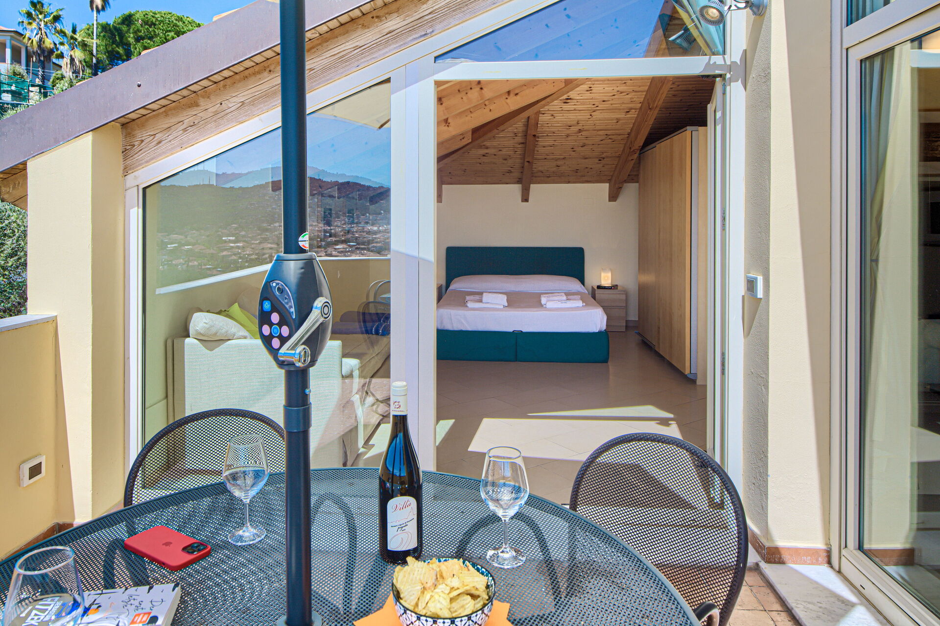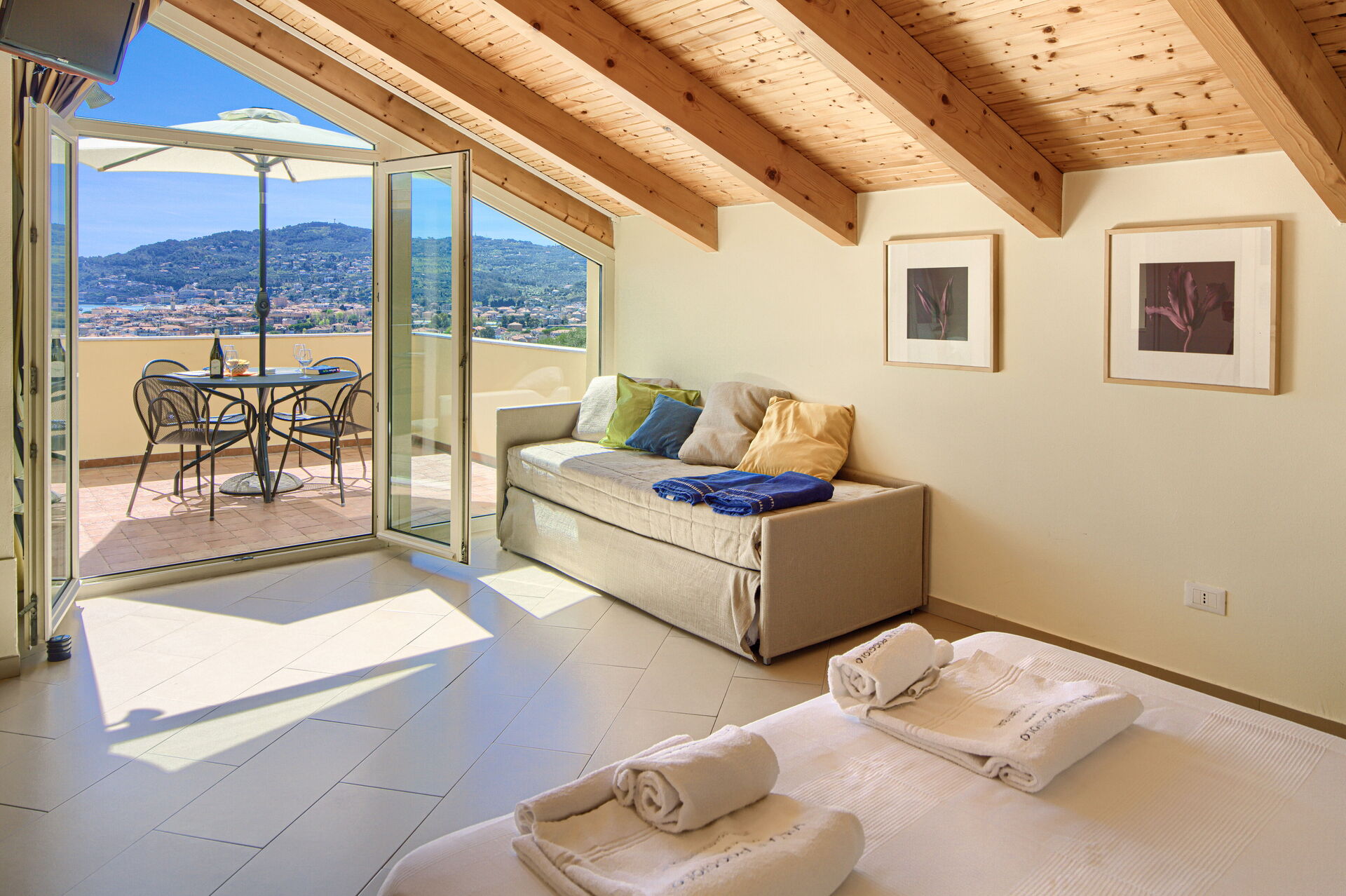Appartamento "ViP Panorama 2", primo piano. 60 mq, al primo piano. Può ospitare comodamente 4 persone. Una camera matrimoniale, due divani letto singoli in soggiorno o in camera da letto. Due terrazze panoramiche mozzafiato, una delle quali è attrezzata con tavolo e sedie. Aria condizionata. Smart TV, impianto Hi-Fi Bose.