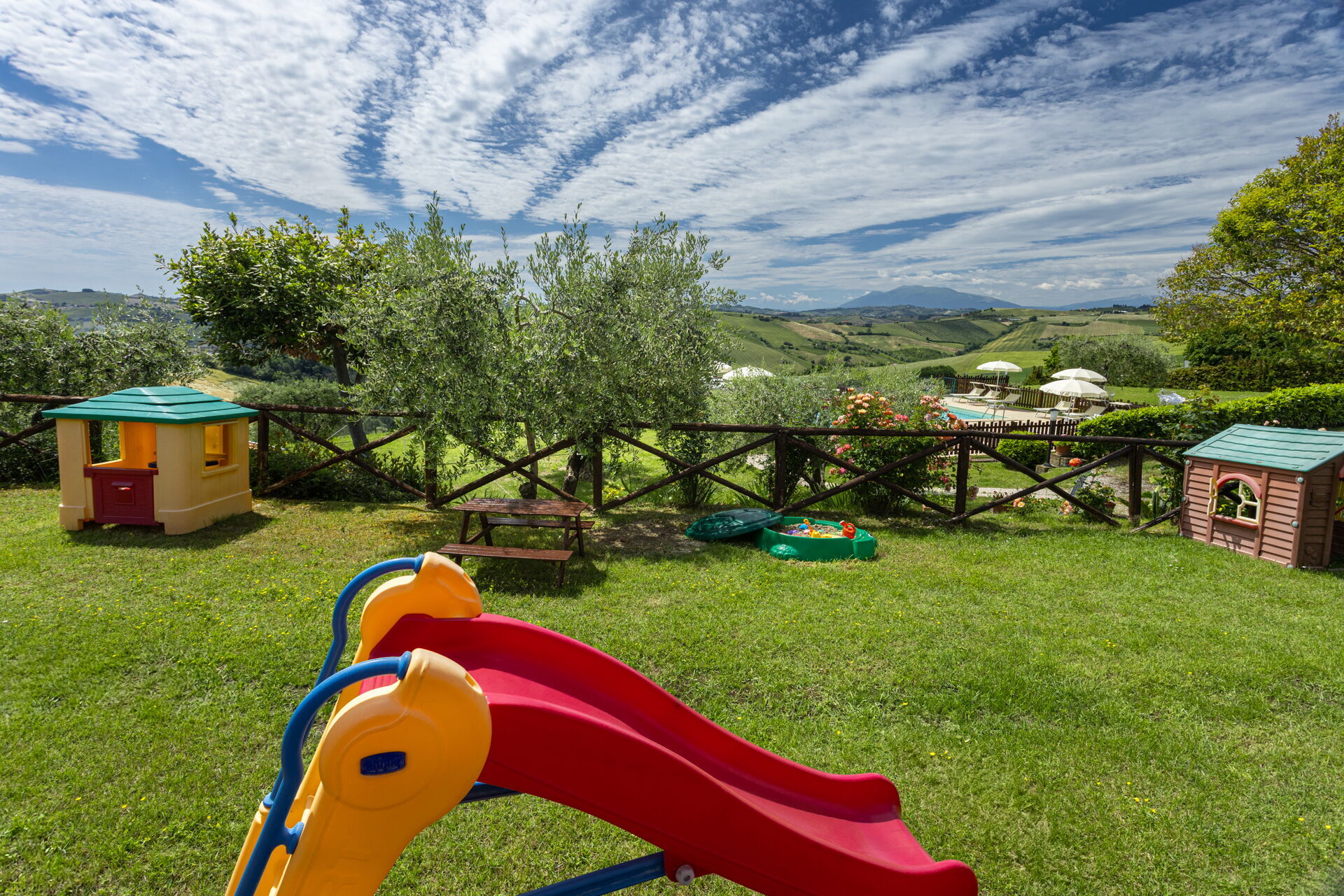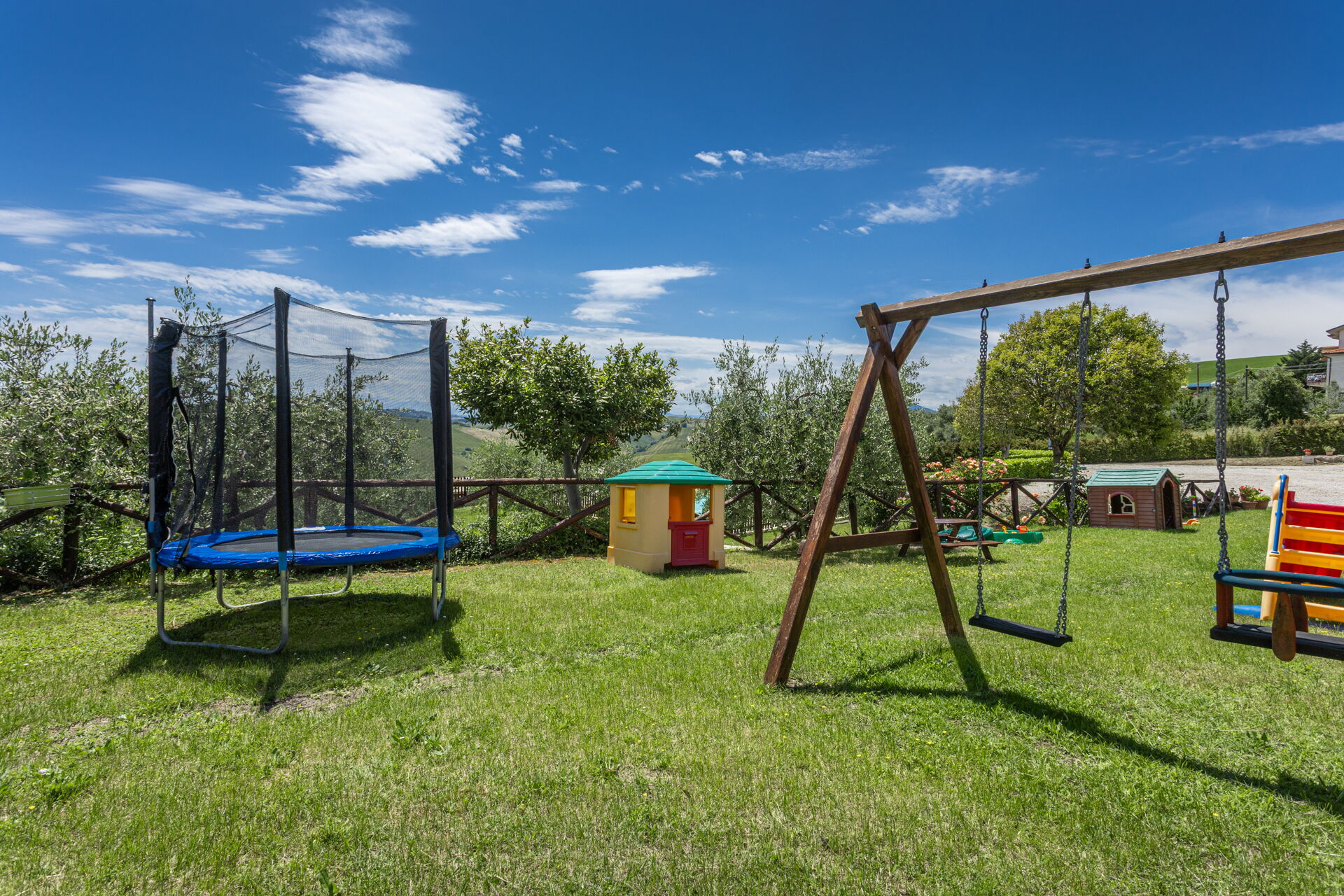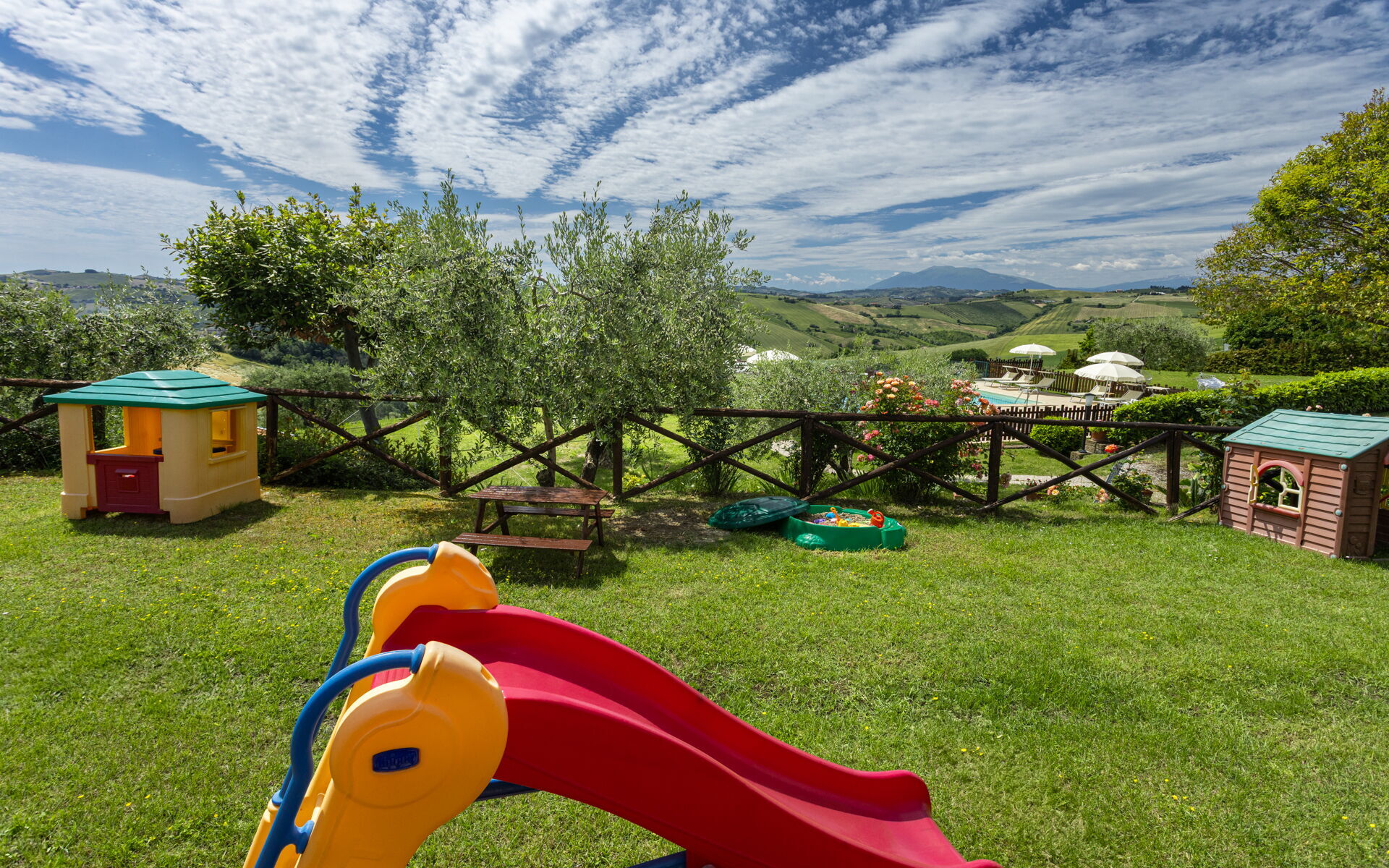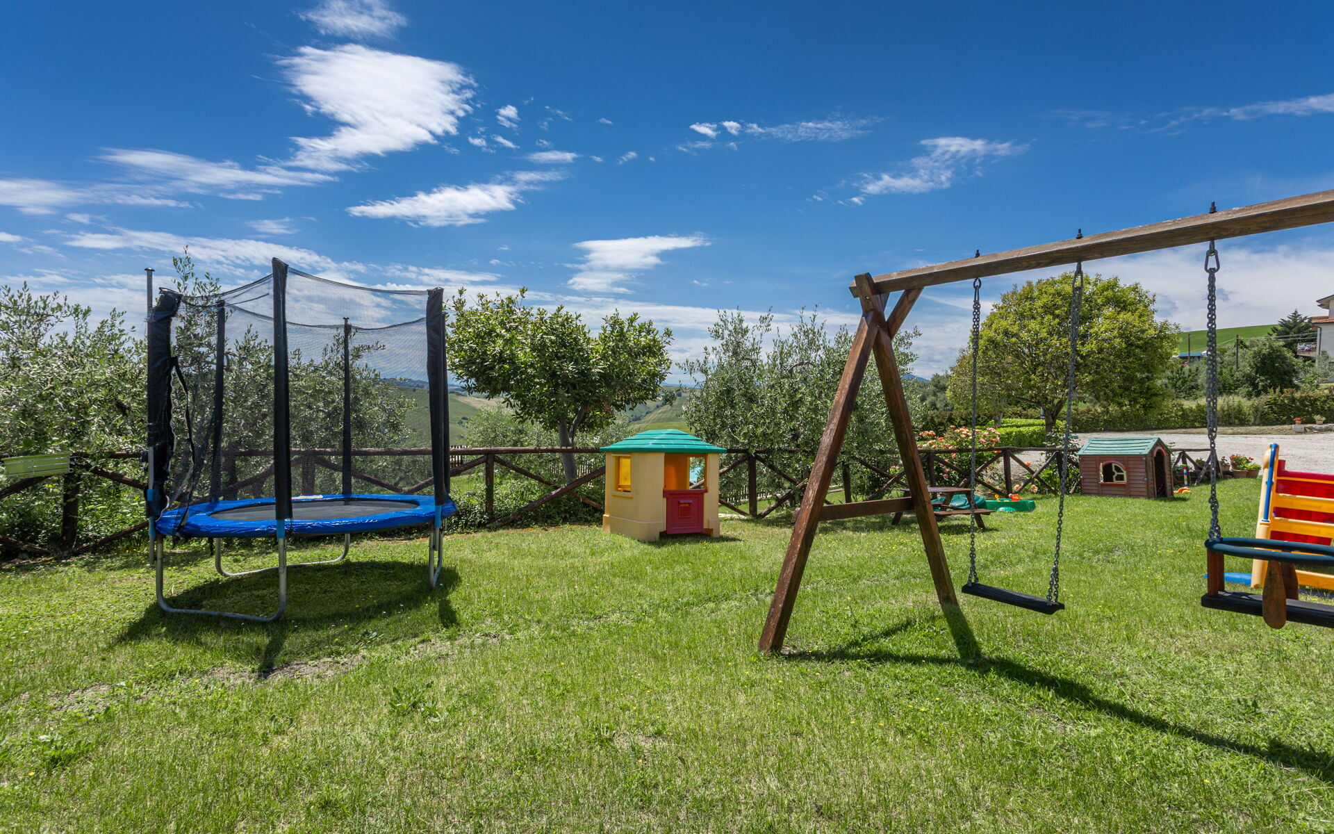 Intorno alla piscina c'è un grande prato che accoglie da un lato, lettini e sdraio e dall’altro, un’amaca e una sedia a dondolo appesa all’albero. C'è un parco giochi ben attrezzato con altalena, scivolo, sabbiera per giocare con formine e secchielli, due casette con tavolini e sedie e tanti libri da leggere. C'è anche un trampolino, un calcio balilla e un tavolo da ping pong e una piccola libreria (in italiano e in lingue diverse) anche per i più grandi.