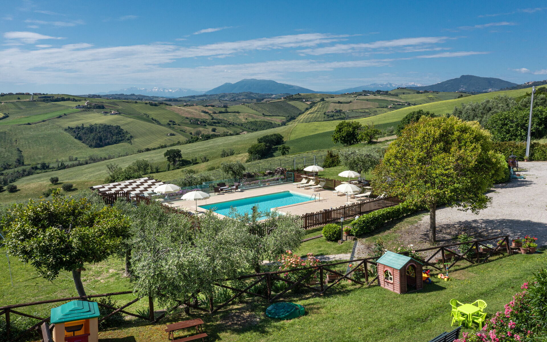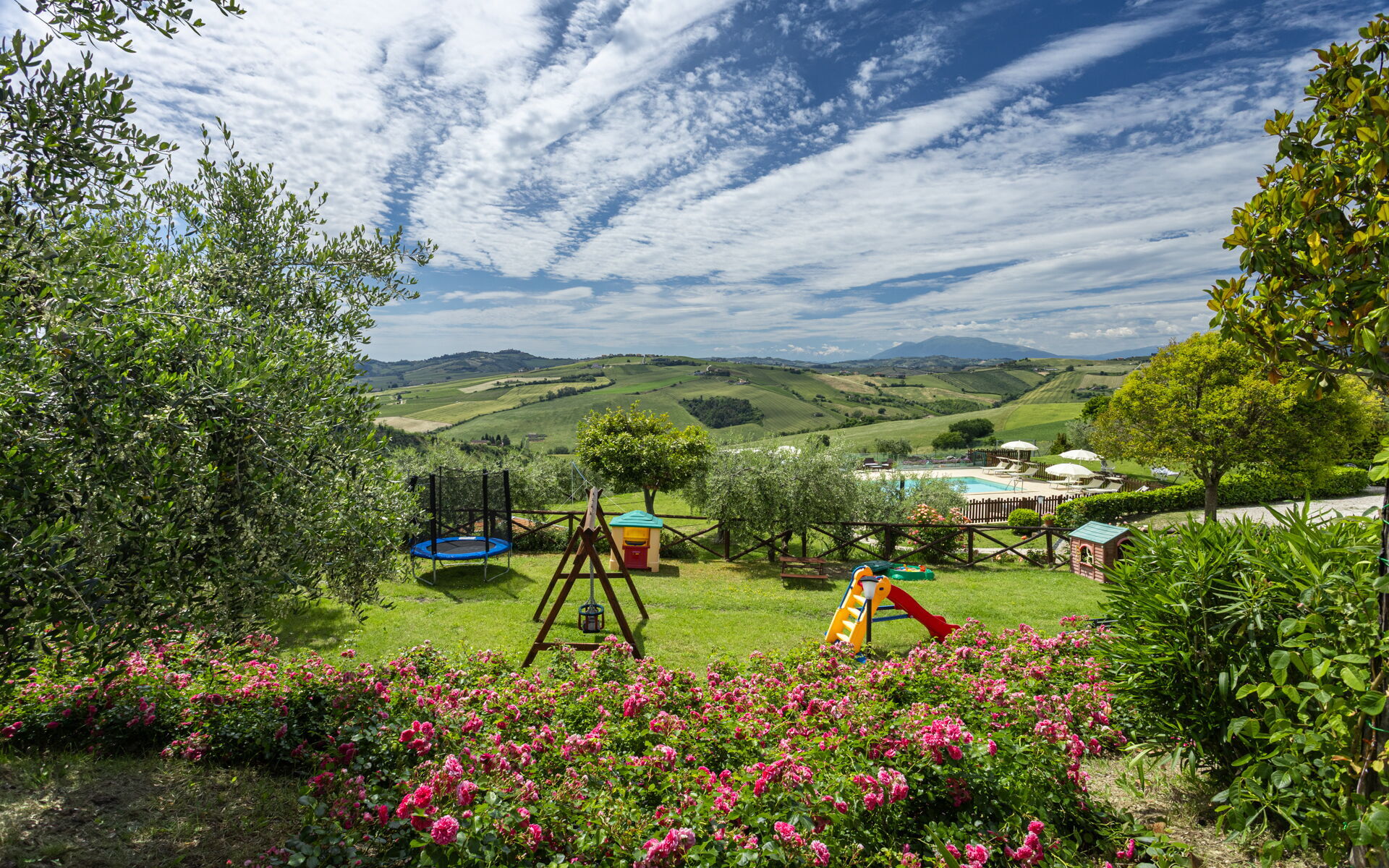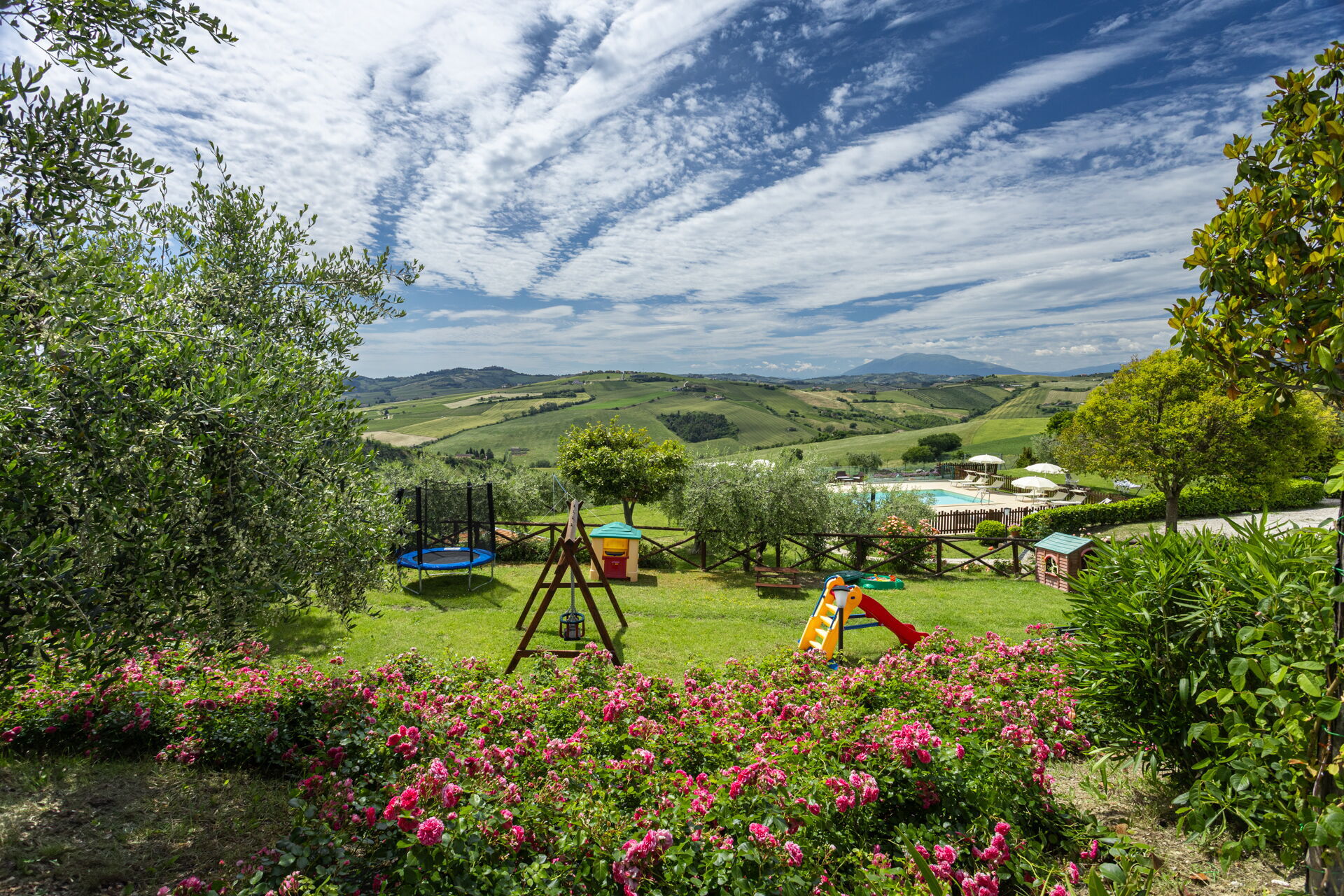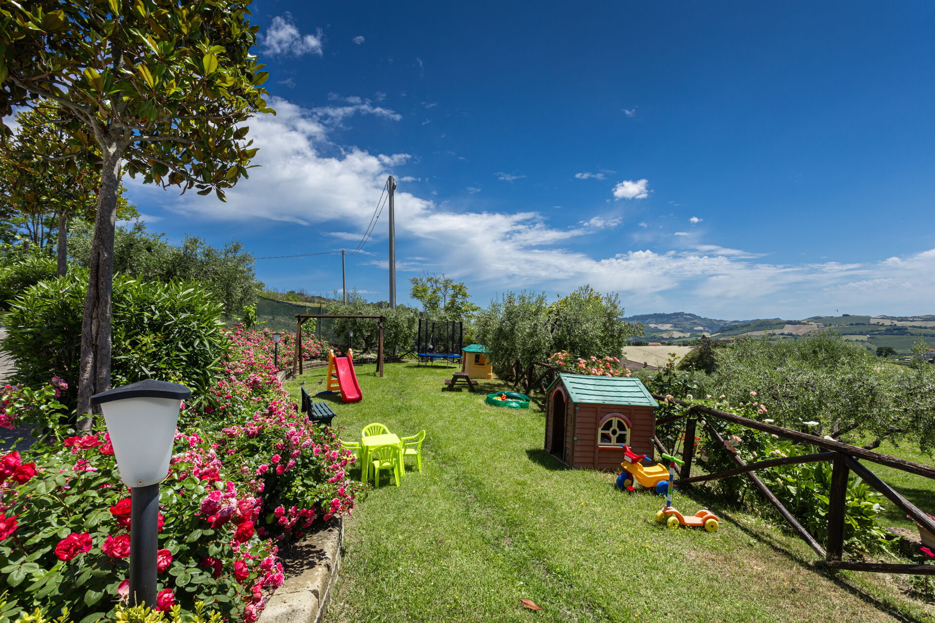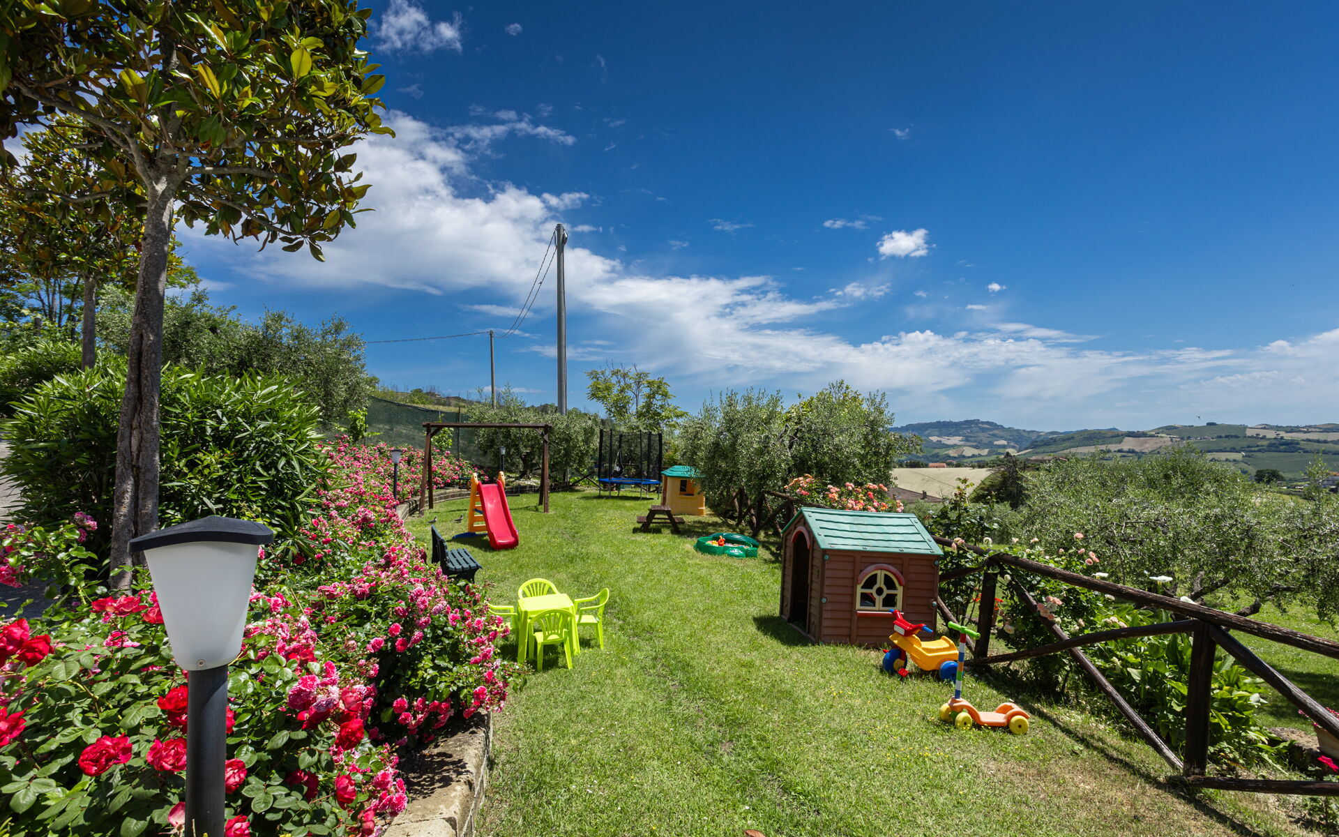 Intorno alla piscina c'è un grande prato che accoglie da un lato, lettini e sdraio e dall’altro, un’amaca e una sedia a dondolo appesa all’albero. C'è un parco giochi ben attrezzato con altalena, scivolo, sabbiera per giocare con formine e secchielli, due casette con tavolini e sedie e tanti libri da leggere. C'è anche un trampolino, un calcio balilla e un tavolo da ping pong e una piccola libreria (in italiano e in lingue diverse) anche per i più grandi.