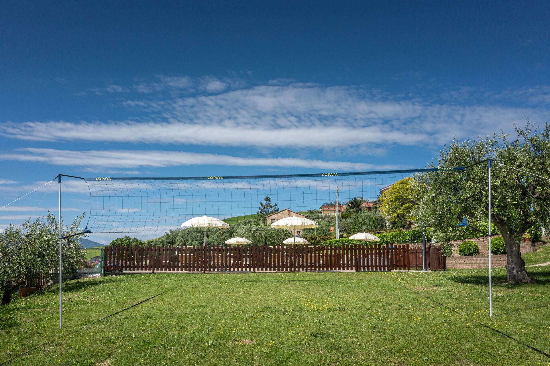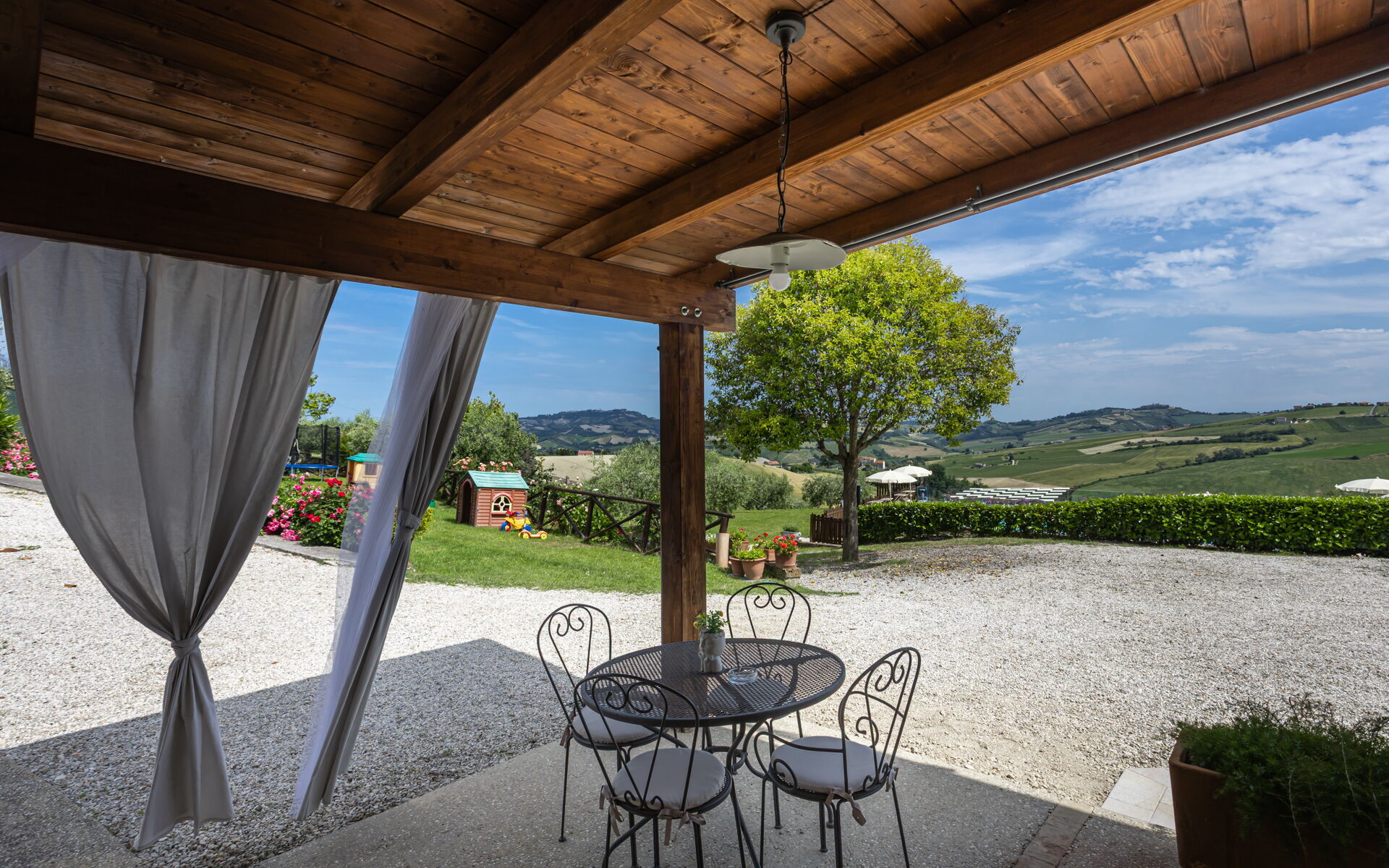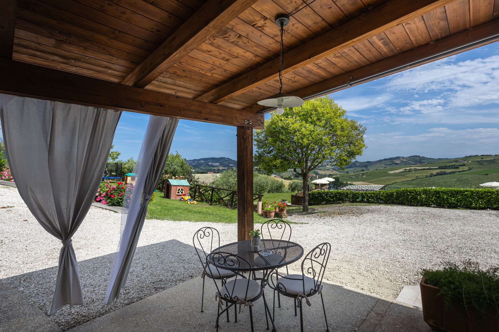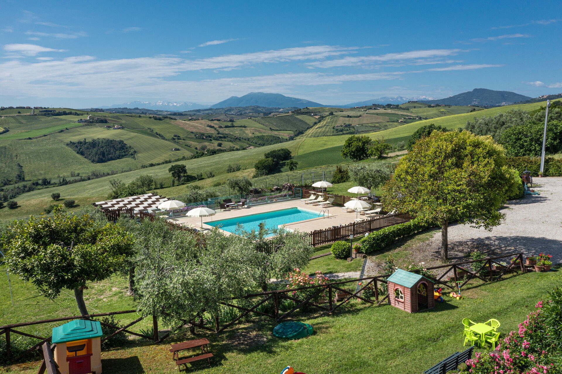 Intorno alla piscina c'è un grande prato che accoglie da un lato, lettini e sdraio e dall’altro, un’amaca e una sedia a dondolo appesa all’albero. C'è un parco giochi ben attrezzato con altalena, scivolo, sabbiera per giocare con formine e secchielli, due casette con tavolini e sedie e tanti libri da leggere. C'è anche un trampolino, un calcio balilla e un tavolo da ping pong e una piccola libreria (in italiano e in lingue diverse) anche per i più grandi.