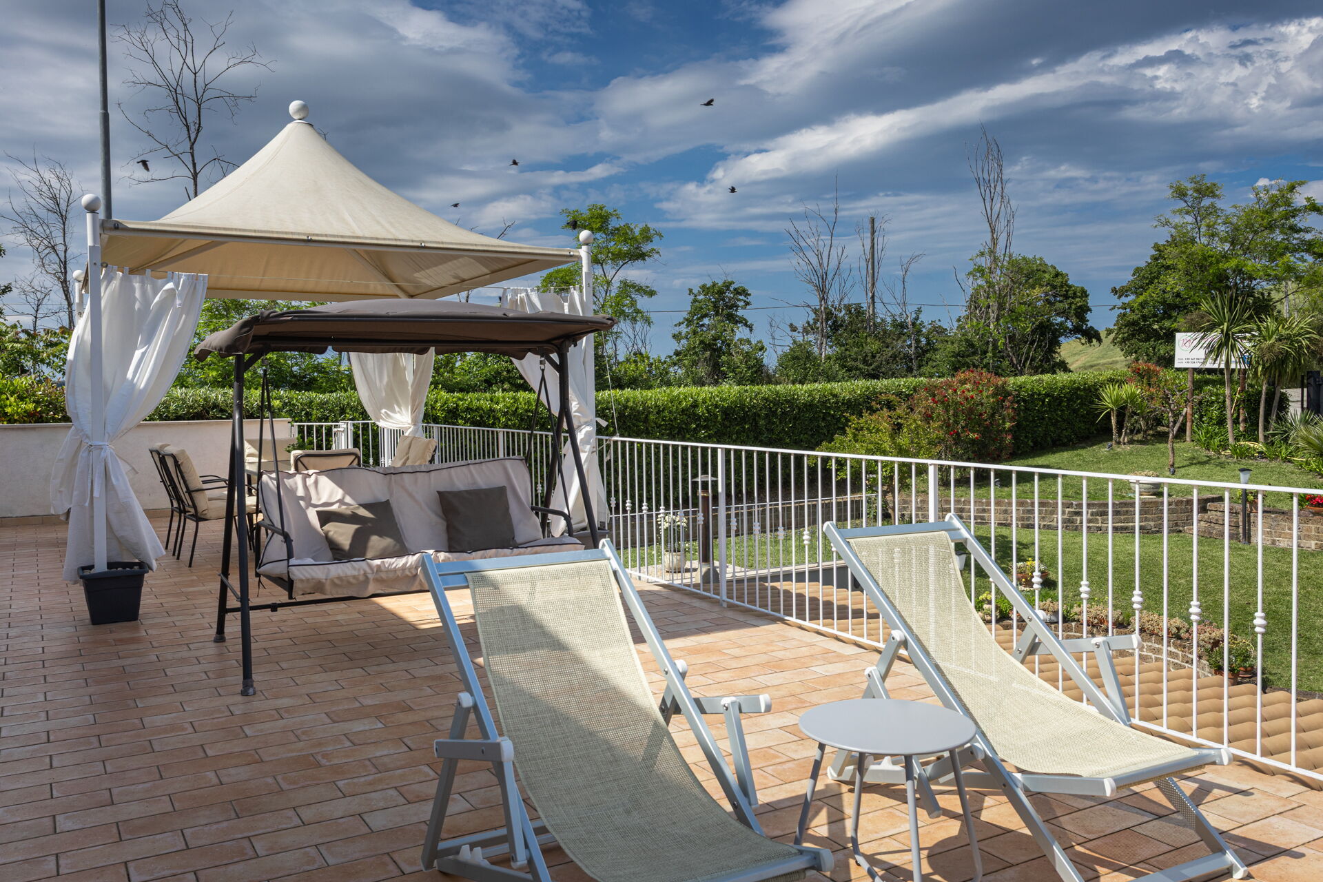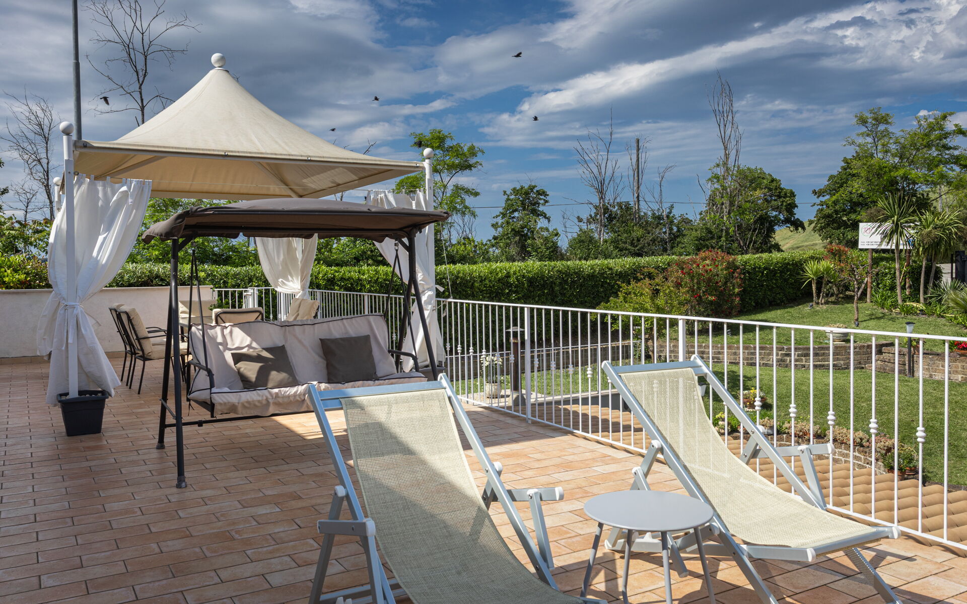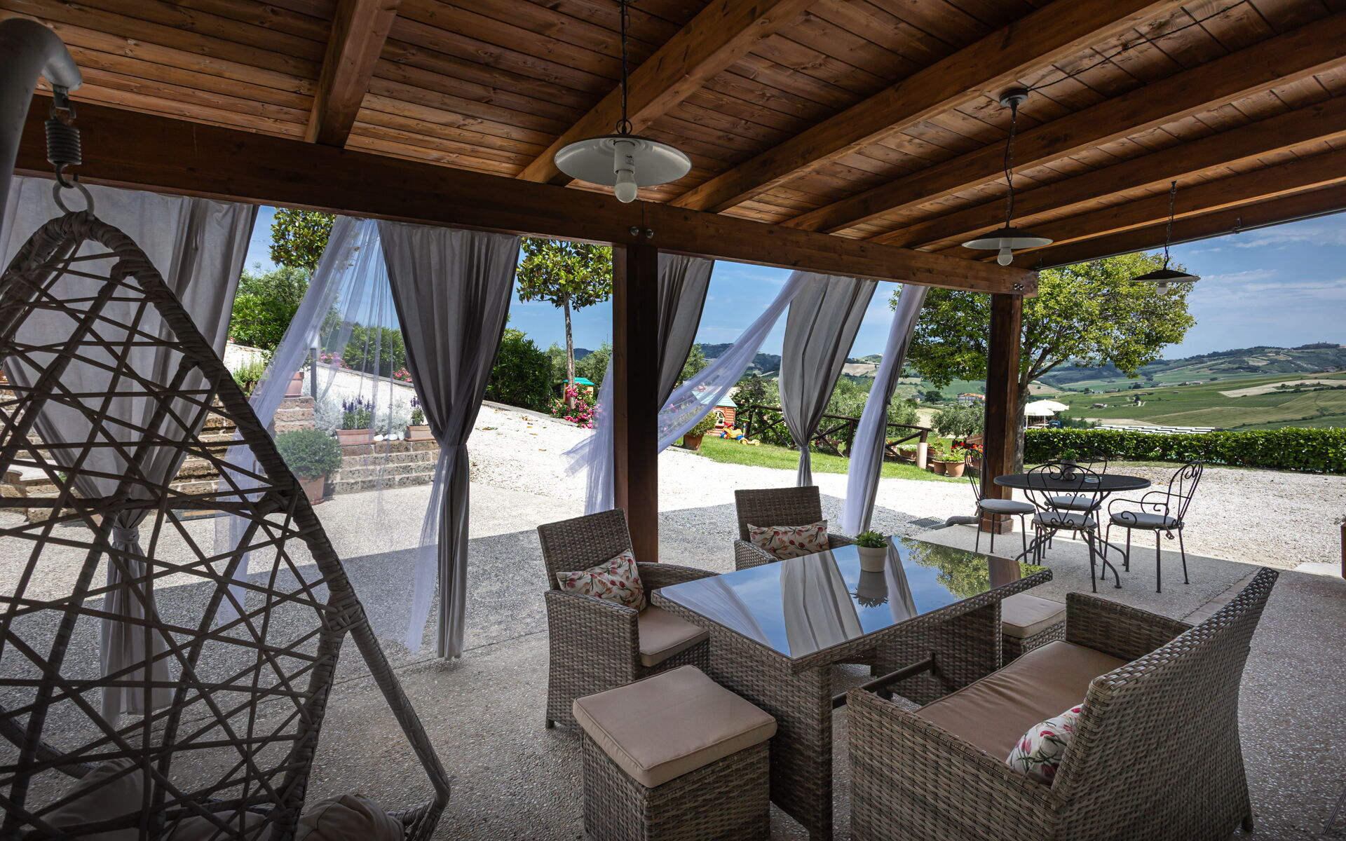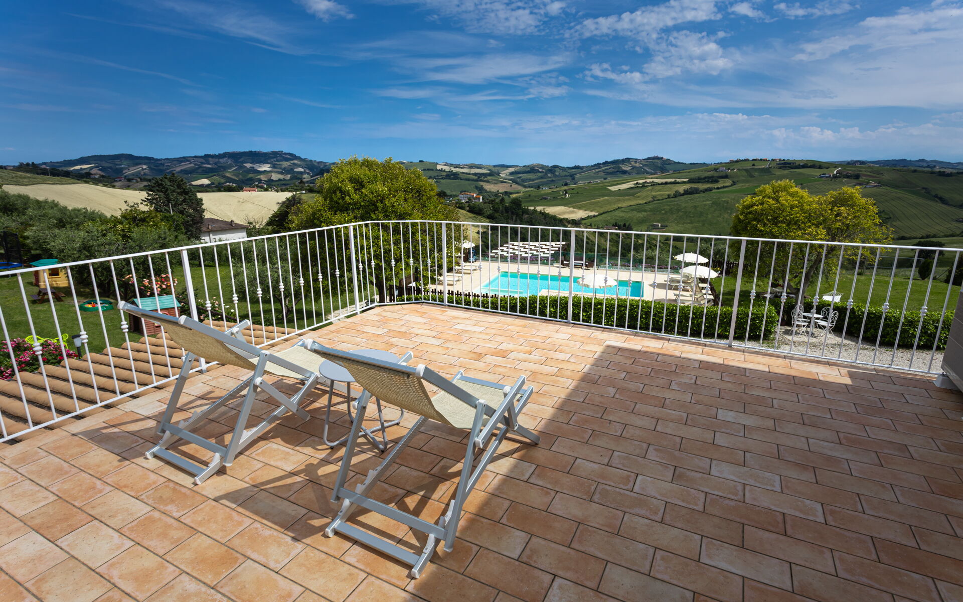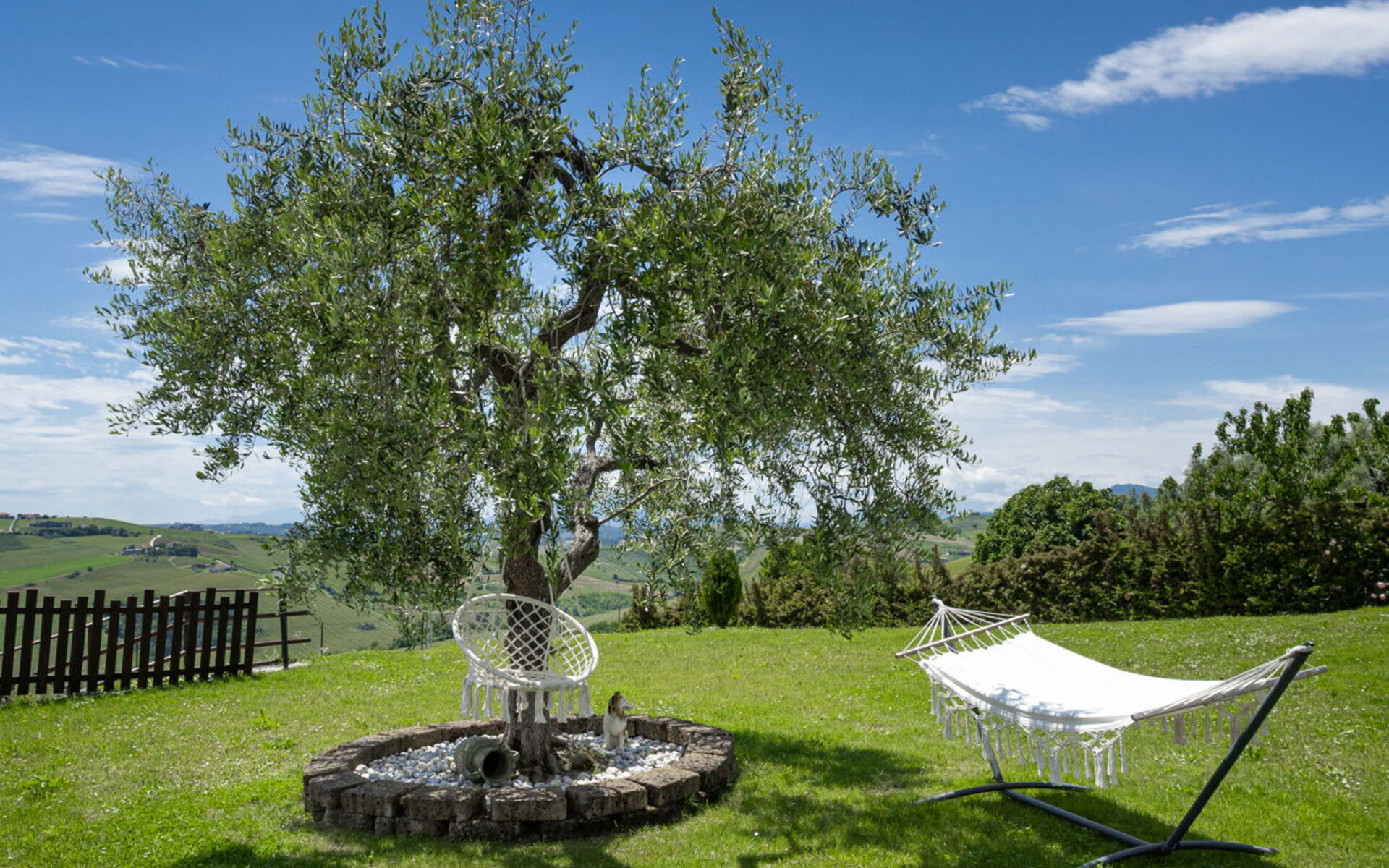 Intorno alla piscina c'è un grande prato che accoglie da un lato, lettini e sdraio e dall’altro, un’amaca e una sedia a dondolo appesa all’albero. C'è un parco giochi ben attrezzato con altalena, scivolo, sabbiera per giocare con formine e secchielli, due casette con tavolini e sedie e tanti libri da leggere. C'è anche un trampolino, un calcio balilla e un tavolo da ping pong e una piccola libreria (in italiano e in lingue diverse) anche per i più grandi.