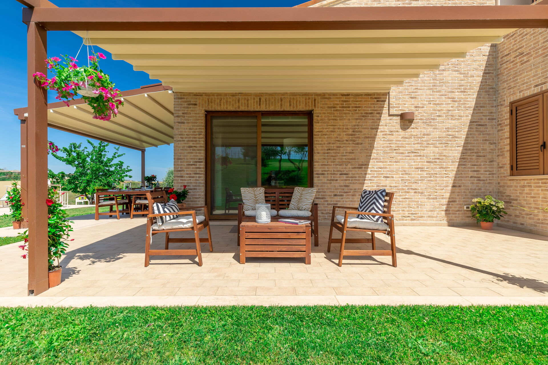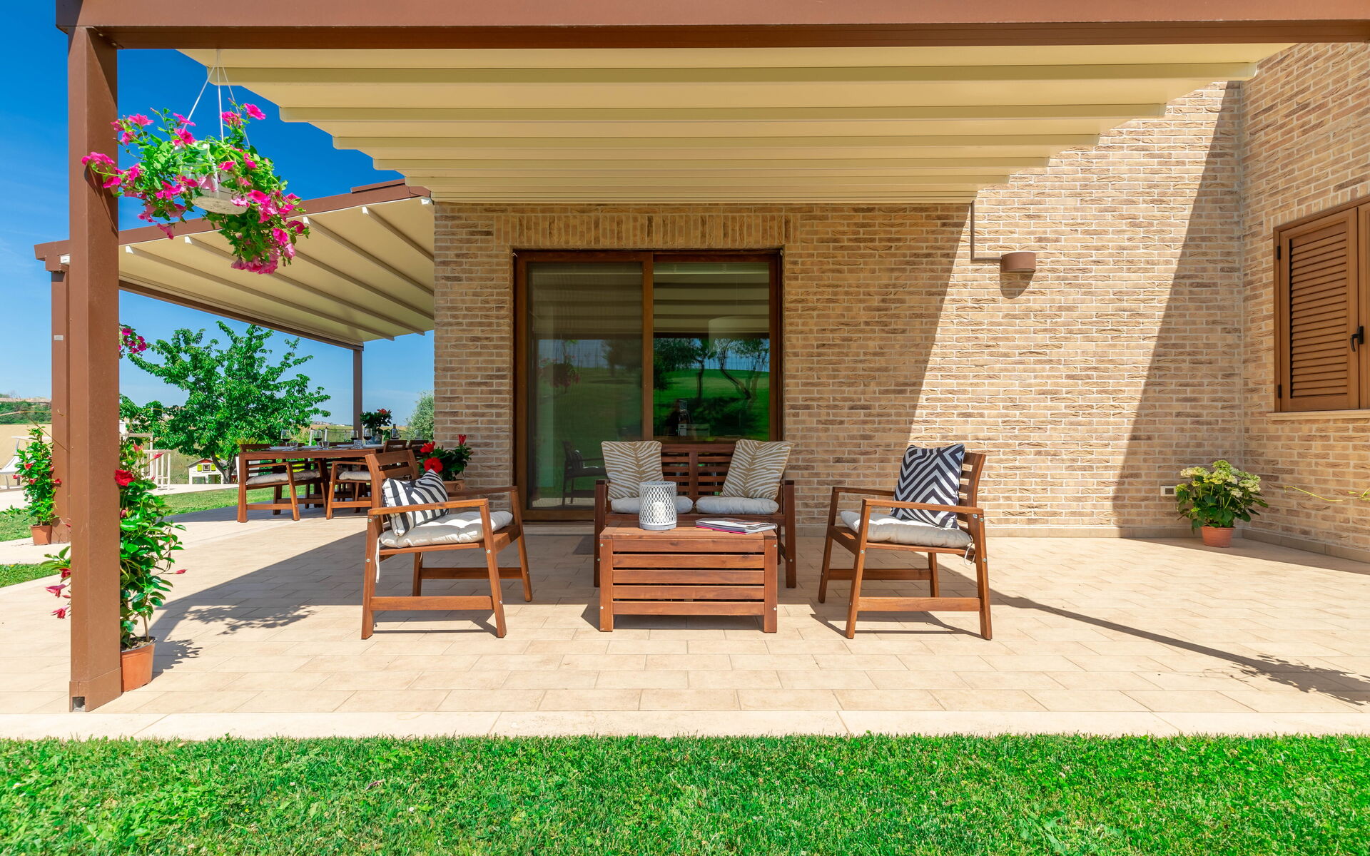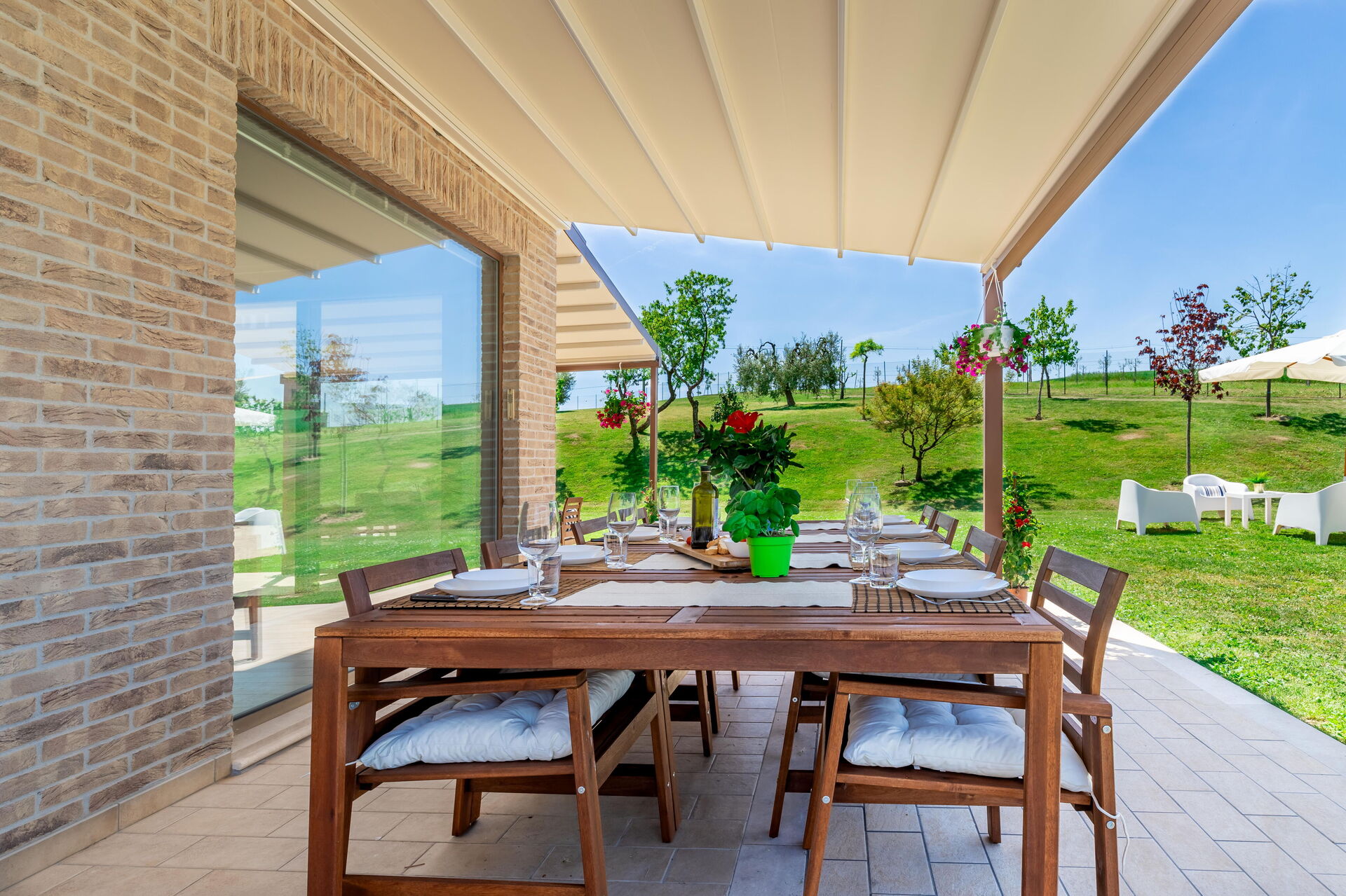 Un grande tavolo per mangiare fuori e godersi la brezza della sera che porta il profumo del mare è a disposizione degli ospiti proprio davanti all'area piscina.