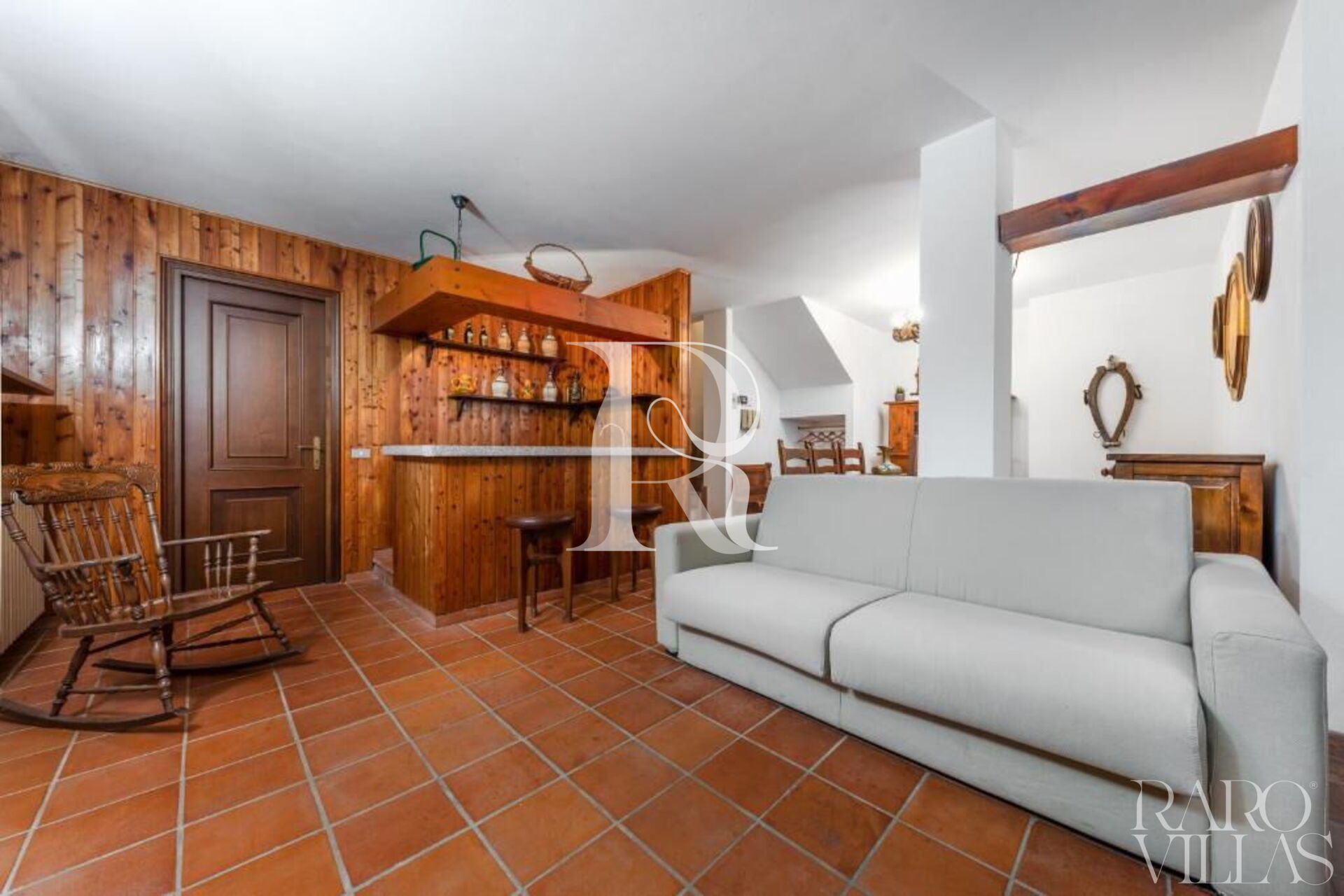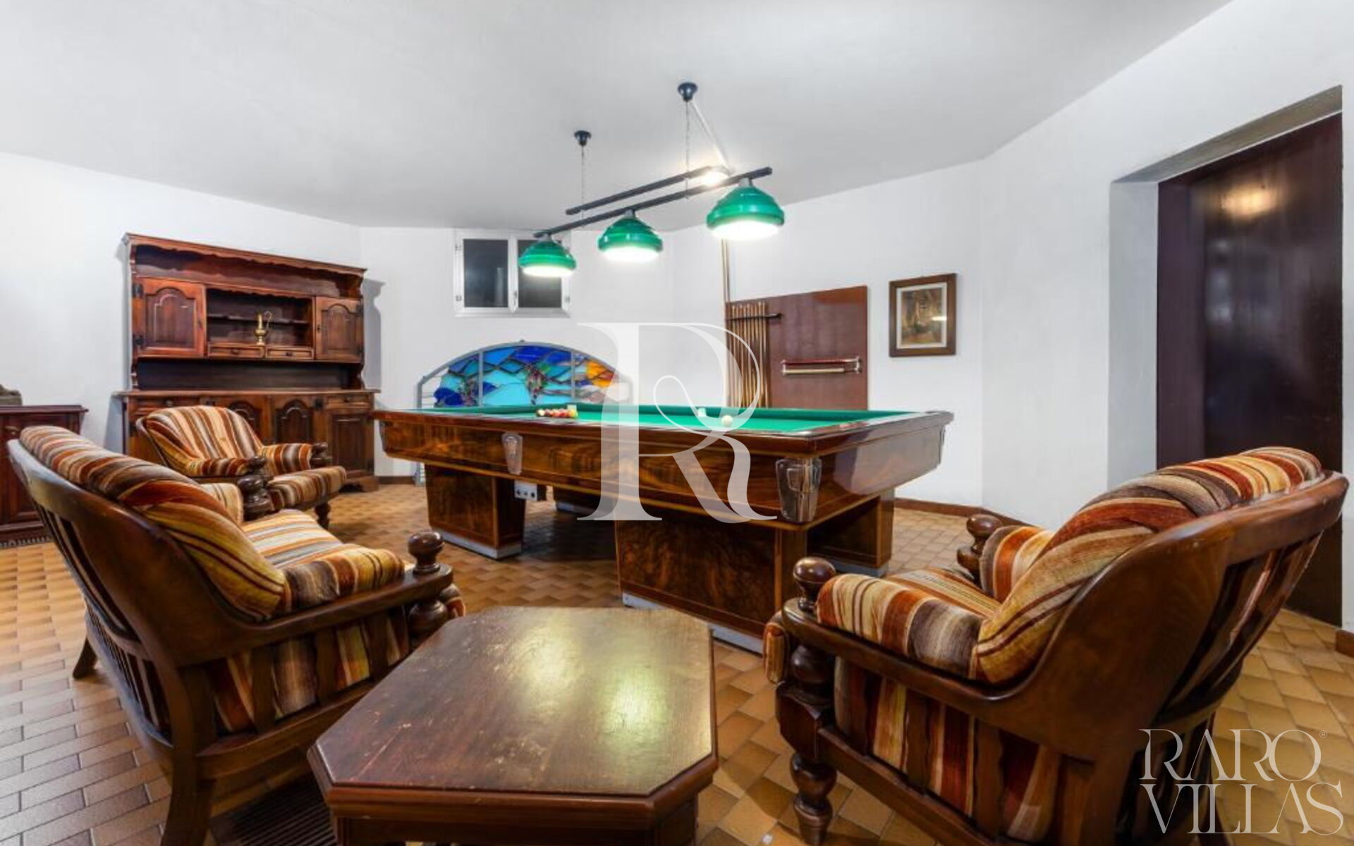 Gli spazi interni, su tre piani, sono provvisti di ogni comfort. Con quattro camere da letto, ognuna provvista di proprio bagno indipendente, una cucina abitabile, due saloni, una taverna con banco bar e una sala biliardo la villa ospita 10 persone in tutta comodità.