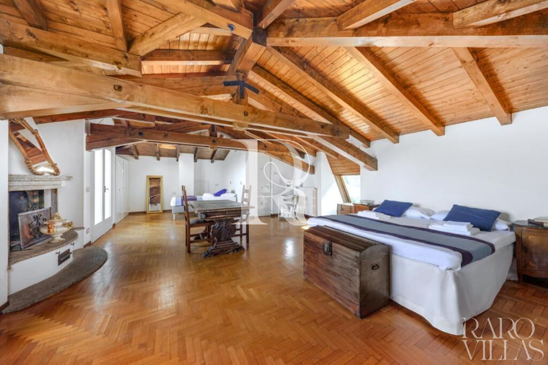 Camera da letto con bagno: aria condizionata, bidet, caminetto, divano, internet WIFI, lavandino, letto matrimoniale, uscita sul balcone, wc.