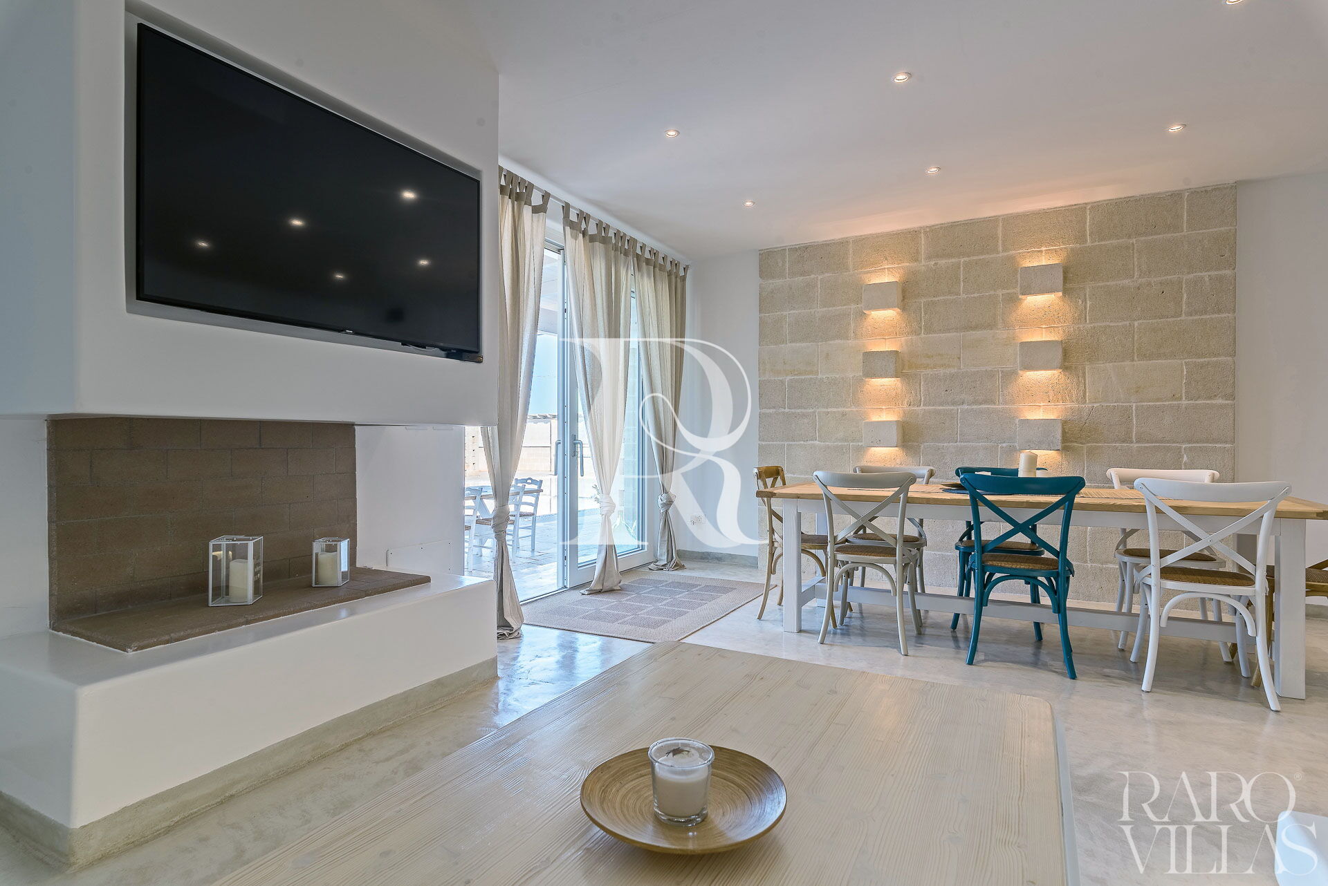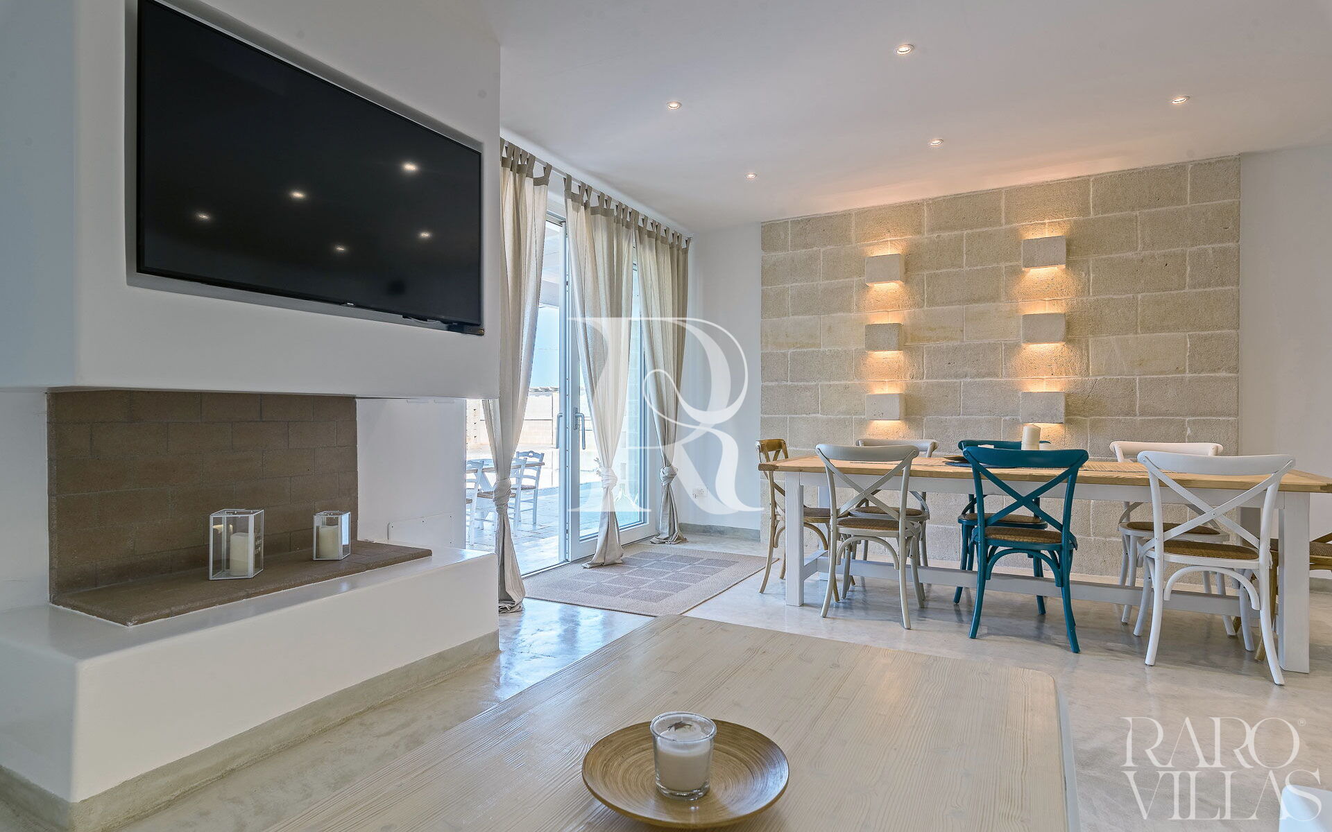 La sala da pranzo presenta al centro il grande tavolo che può ospitare fino a 10 commensali, ed entrando, sulla destra prende posto il grande divano ad "L" con tavolino e Smart TV (incluso di TV satellitare SKY) incassato nel caminetto.