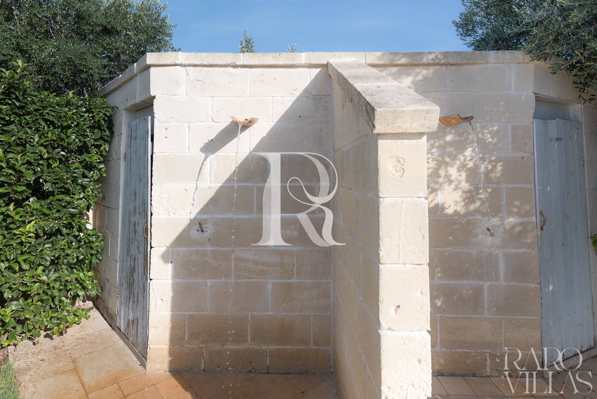 Il giardino, completamente recintato con muratura a vista, è contornato da un'alta siepe tale da riservare privacy e tranquillità. La pavimentazione del cortile è in pietra locale e ad i bordi è presente il prato inglese con i bagni esterni e le docce.