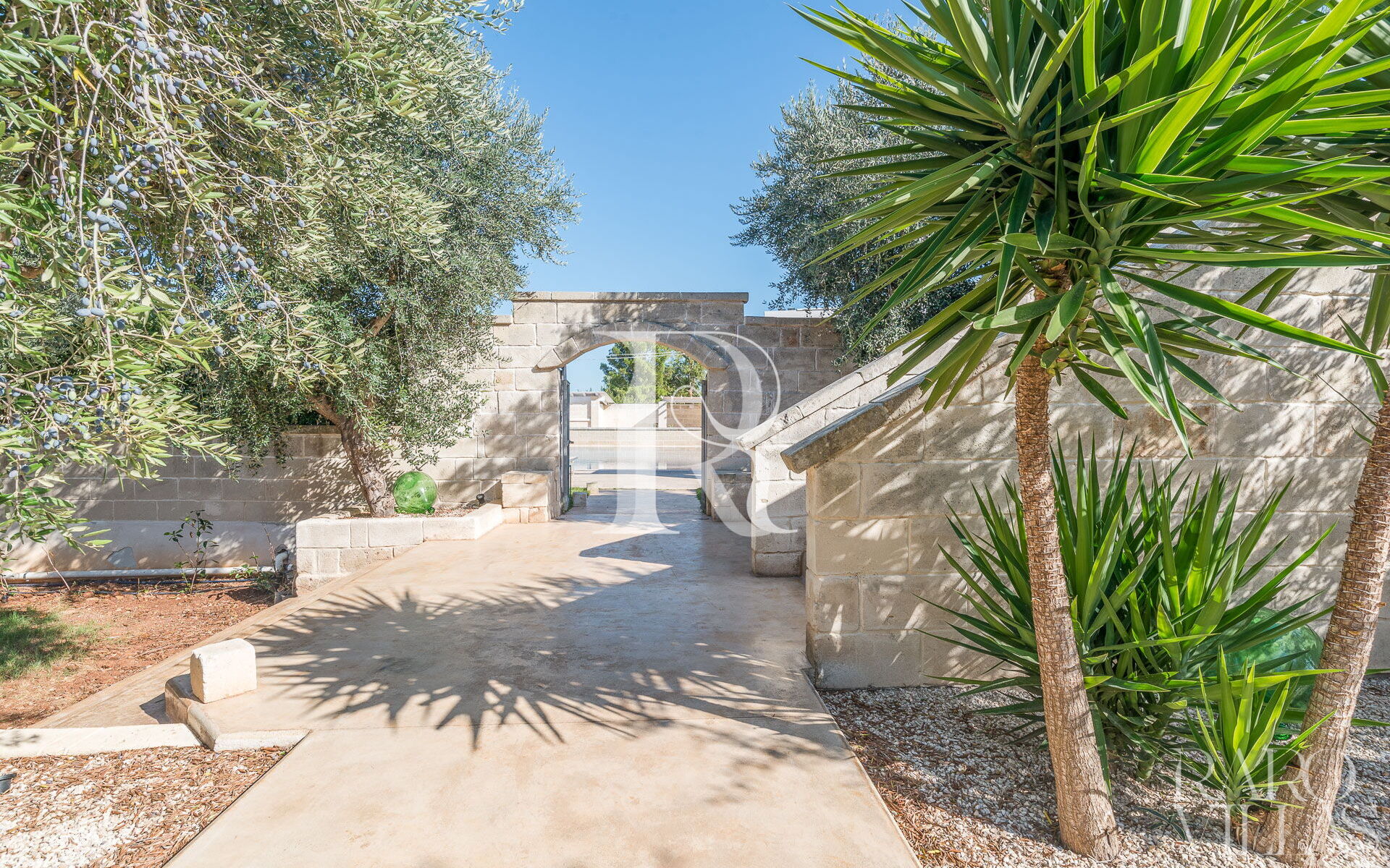 Dal parcheggio, un sentiero guida l'ospite verso l'ingresso principale che avviene dal retro delle villa.