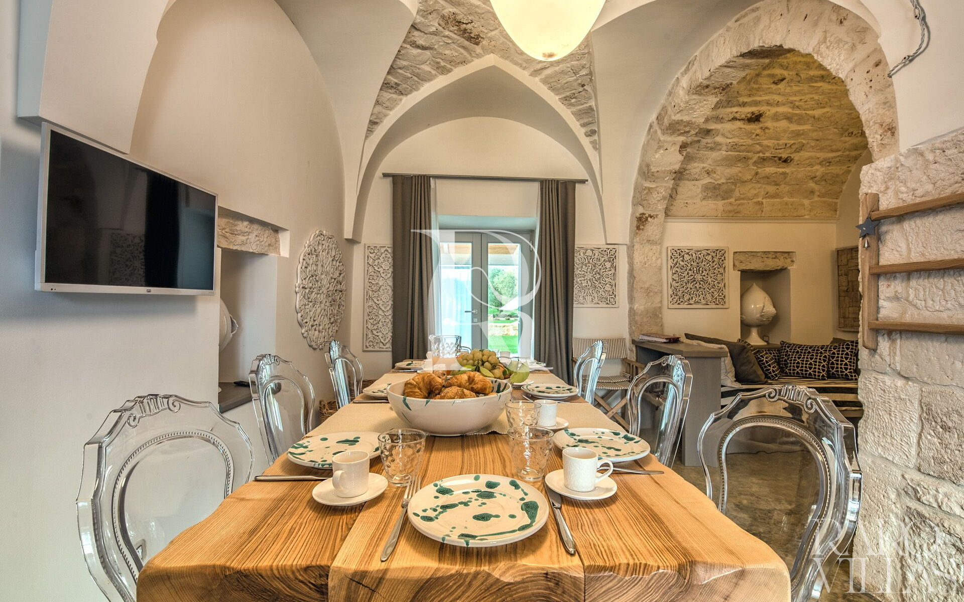 All'esterno, un vasto e curato giardino accoglie gli ospiti con alberi da frutto e maestosi ulivi secolari, offrendo spazi verdi e ombreggiati perfetti per momenti di relax e convivialità. I più piccoli potranno divertirsi con il tavolo da ping pong e godersi i loro programmi preferiti grazie alle TV disponibili.