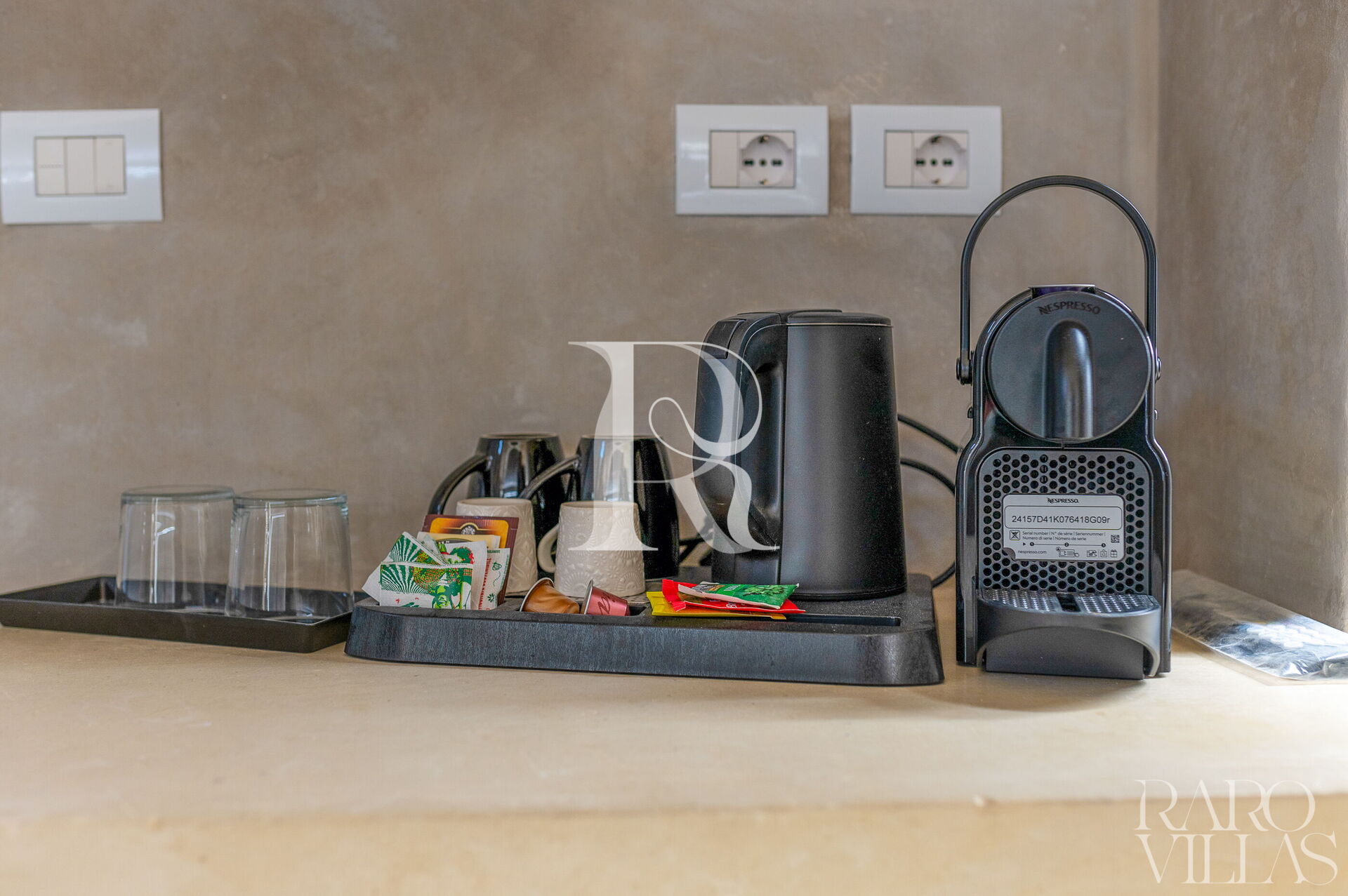 - Dotazione della camera: macchina del caffè Nespresso, capsule caffè, caffè solubile, thé, bottiglia d'acqua liscia da 75ml, bollitore acqua;