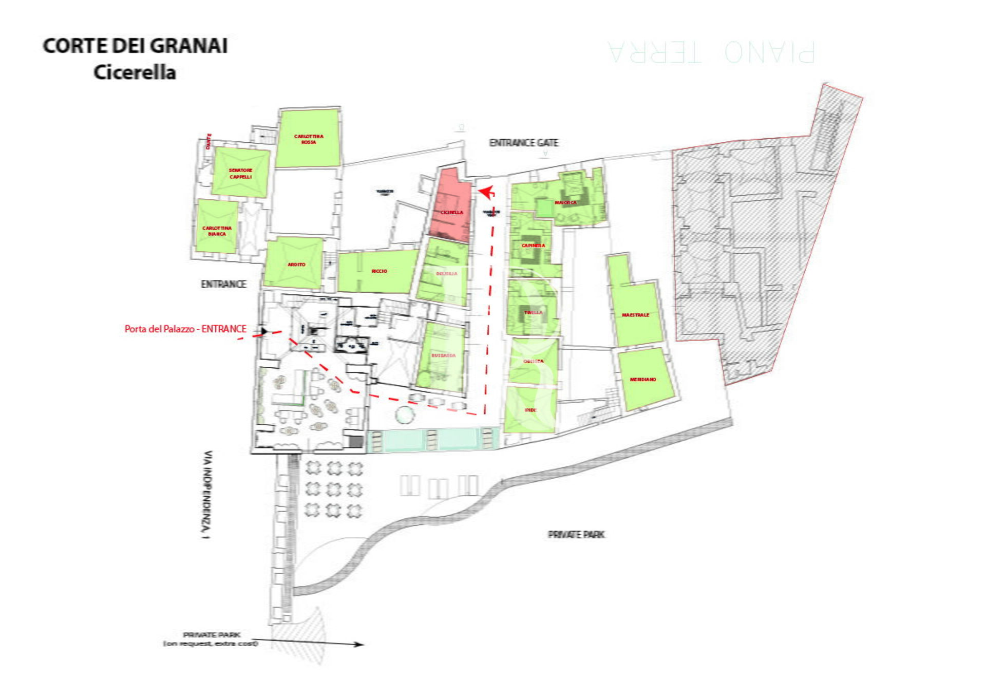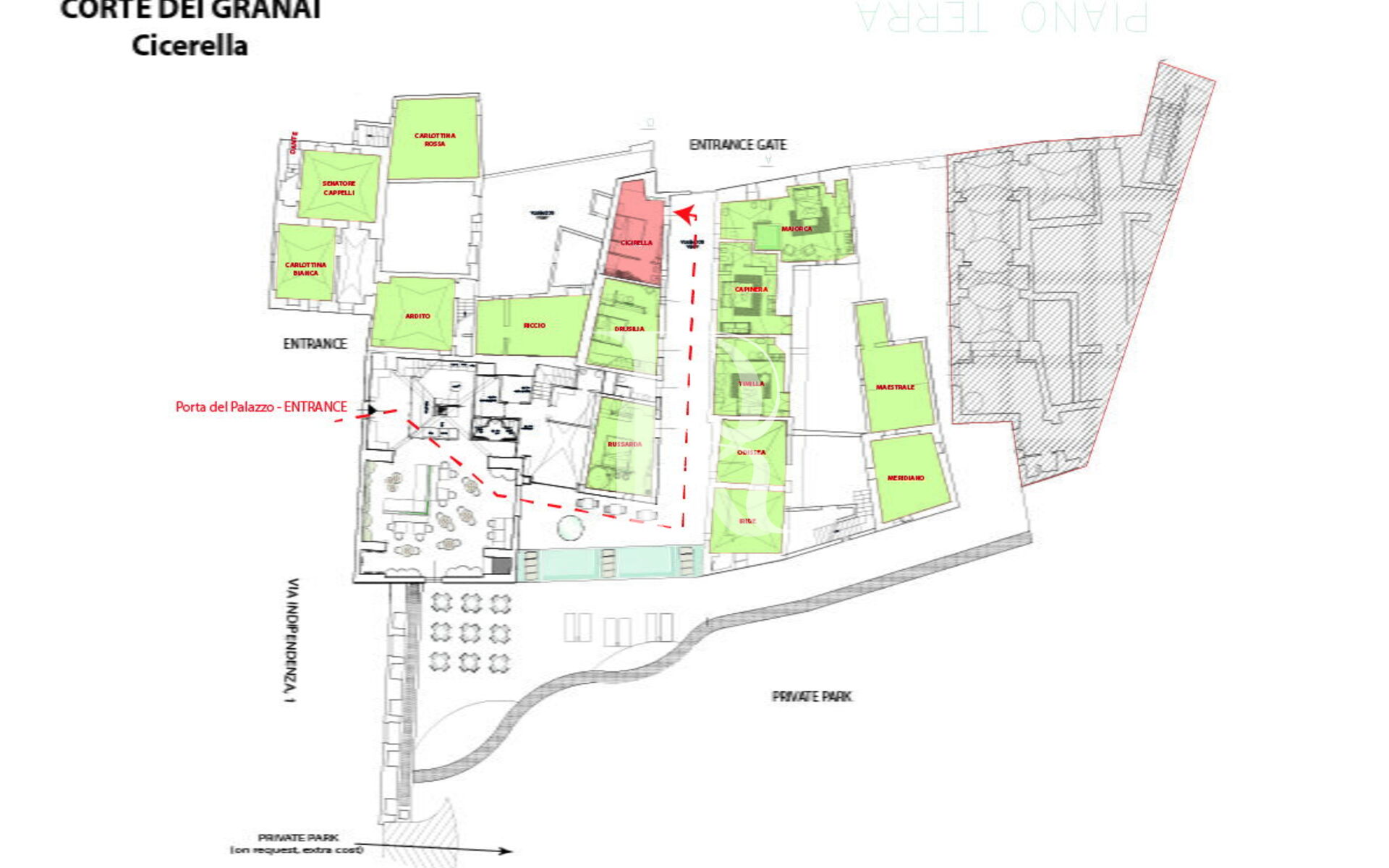 La Cicerella è una camera matrimoniale dalle caratteristiche pareti color pesca, e dotata di un elemento di vanto per la Corte, ovvero la base del lavello del bagno è stata ottenuta da un unico blocco di pietra leccese scolpito a fascioni verticali, che rendono questa camera un esempio unico di design del territorio. È inoltre dotata di aria condizionata, televisione e zona bagno privata.