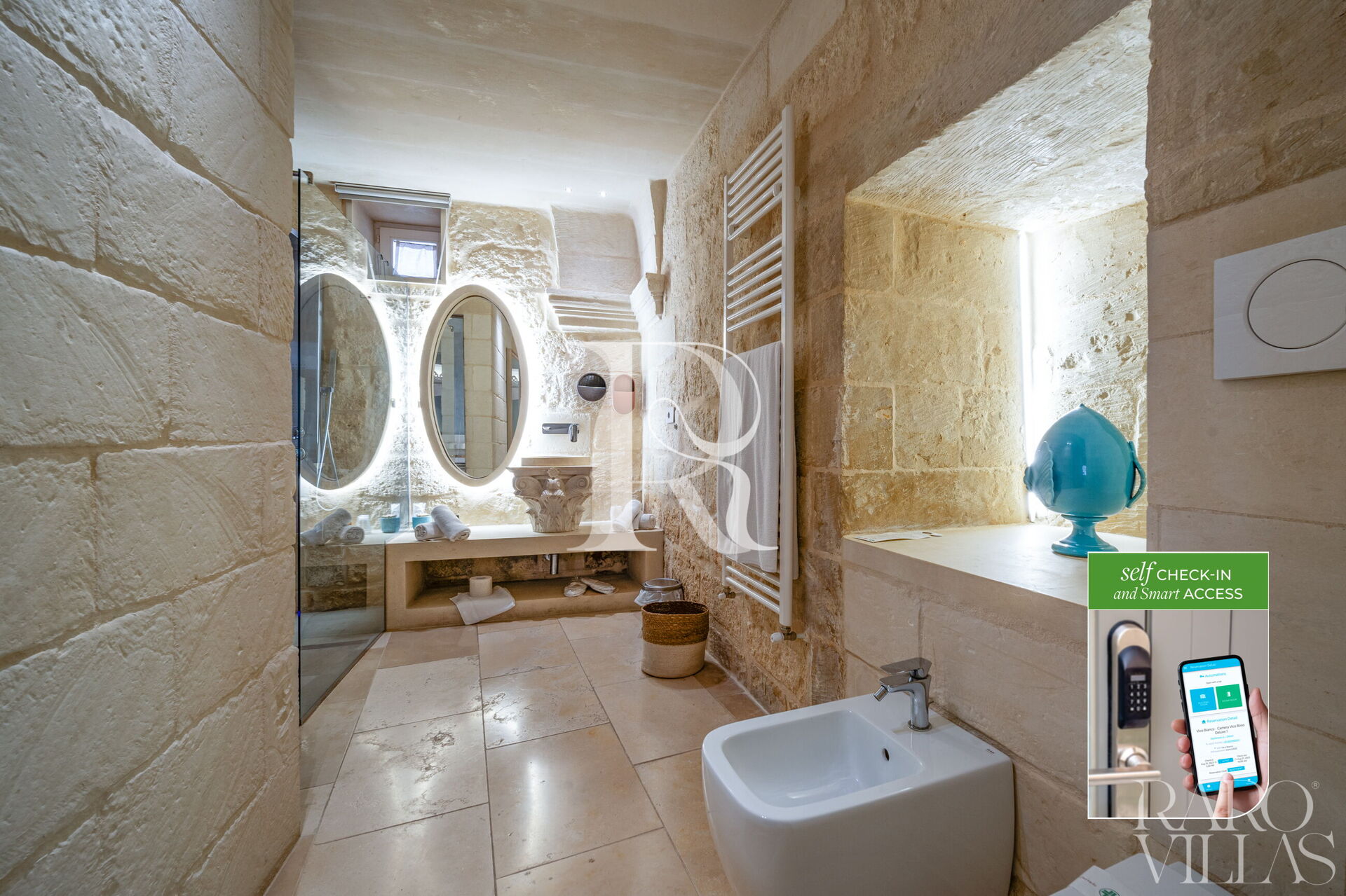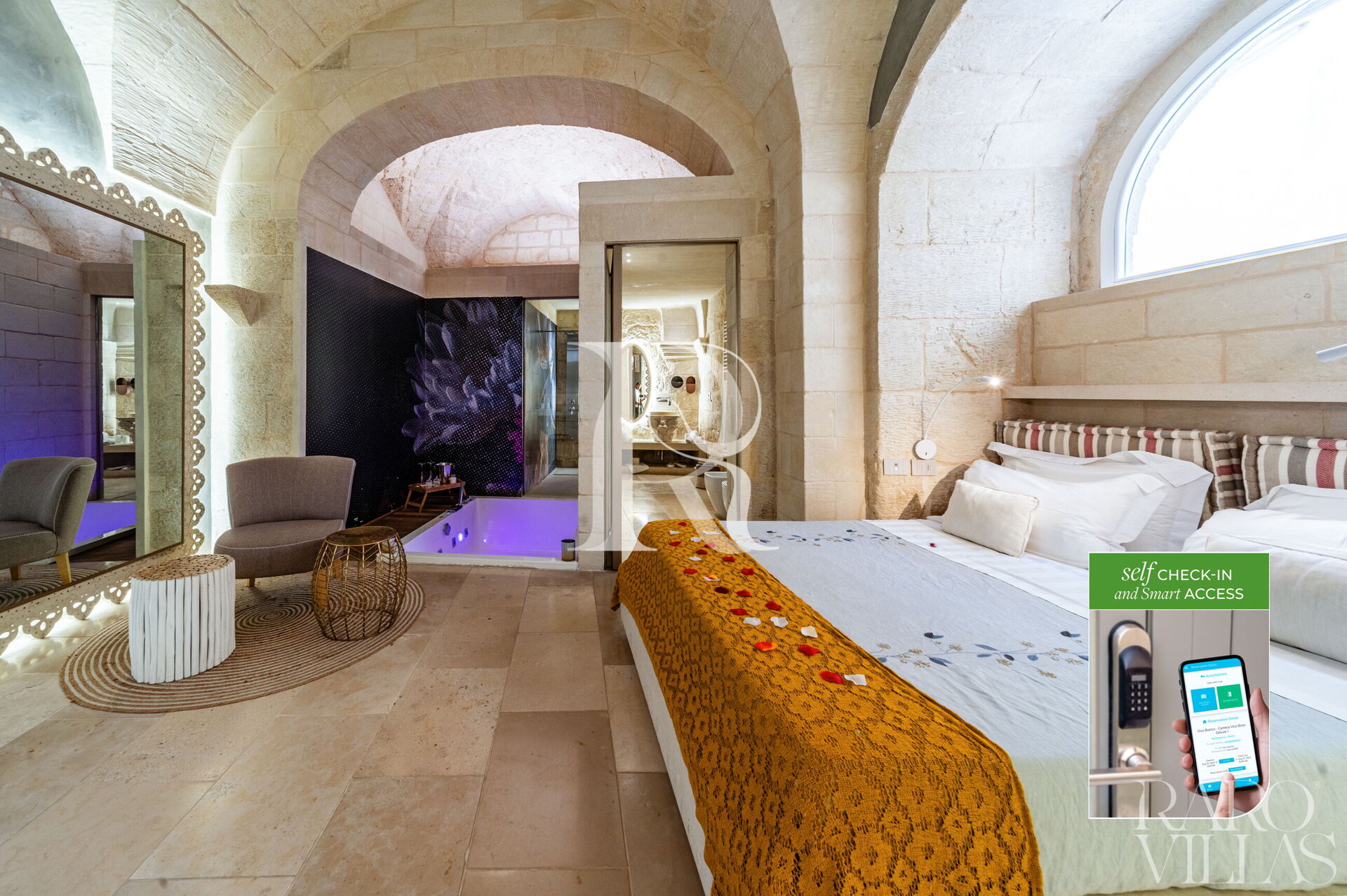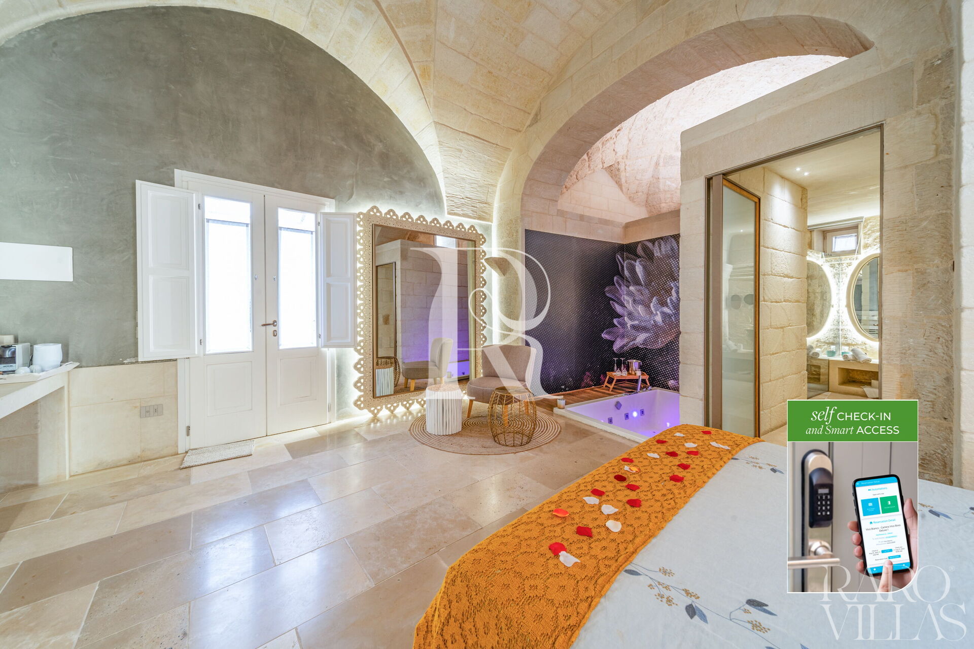 La suite Majorca è realizzata in pietra e arredata con cura per essere una delle suite più ricercate della Corte. Possiede oltre tutti i comfort di cui dispongono le camere, anche di una vasca Jacuzzi privata posta nella zona living. Altro elemento caratteristico della camera è Il lavello del bagno, ricavato all’interno di un tipico capitello barocco salentino, ricco di dettagli e simbolismi, per rendere la vostra esperienza di soggiorno unica e indimenticabile.