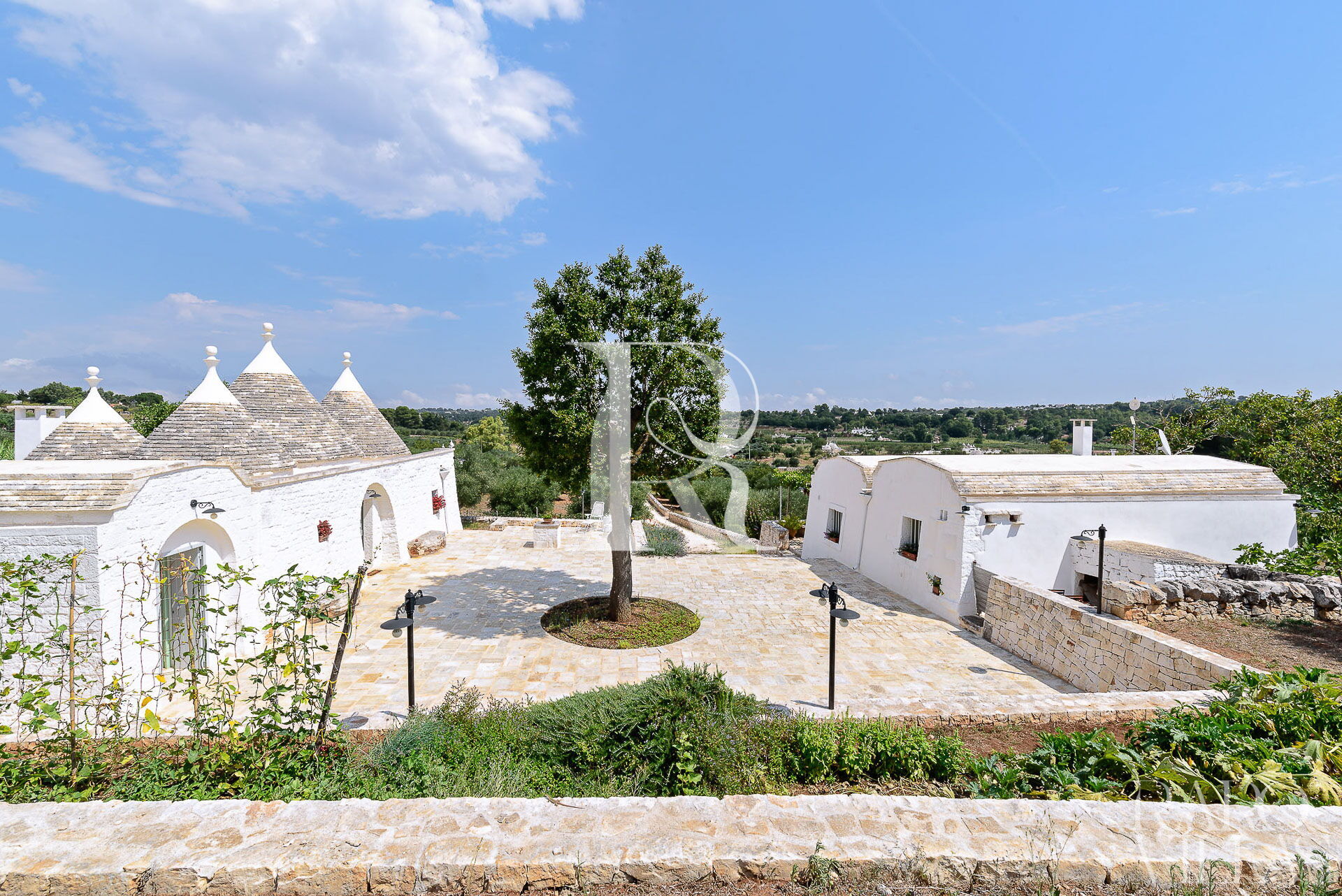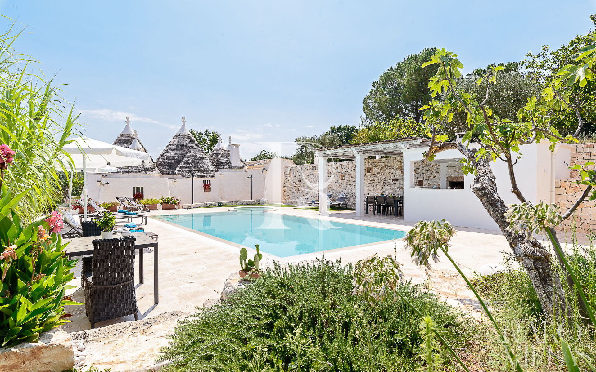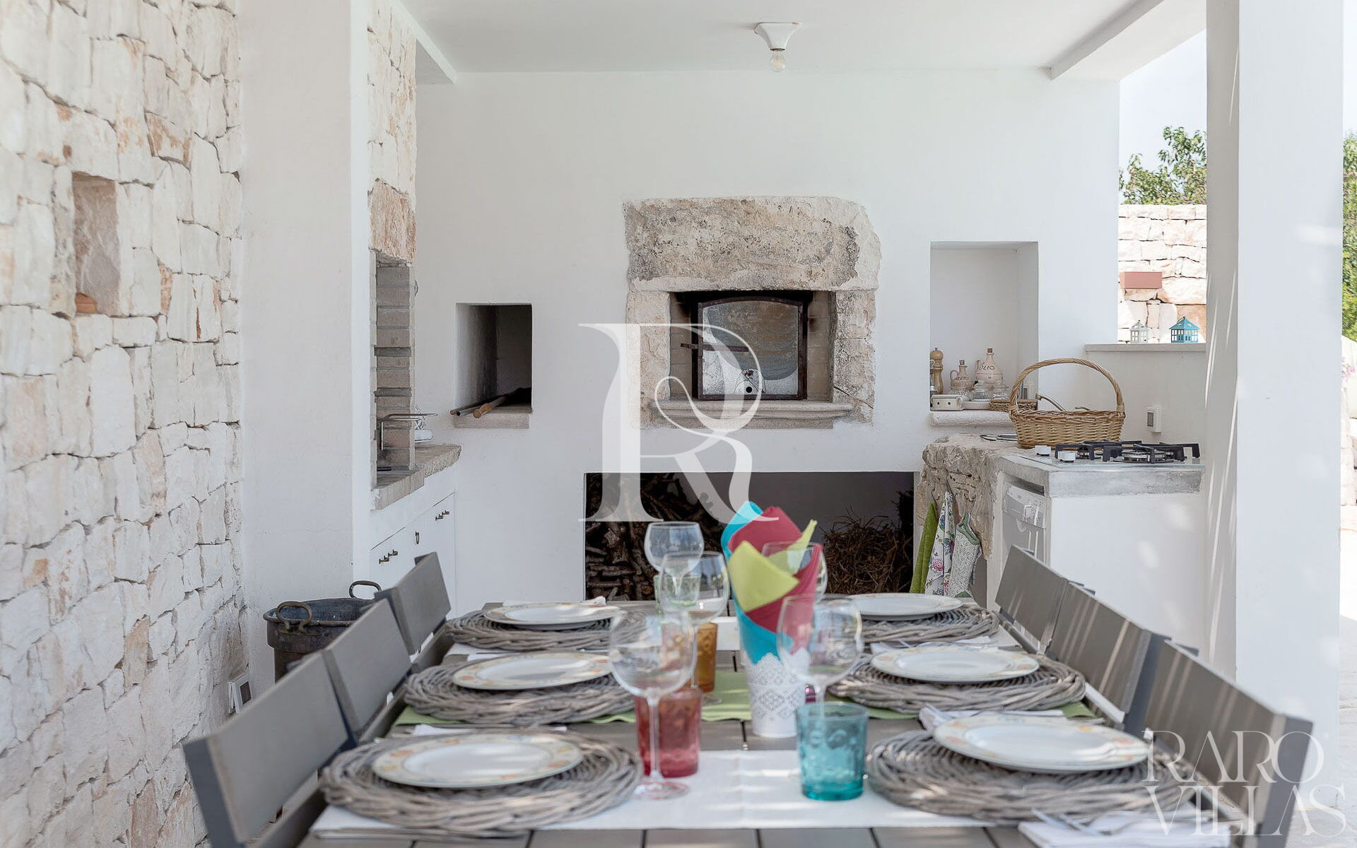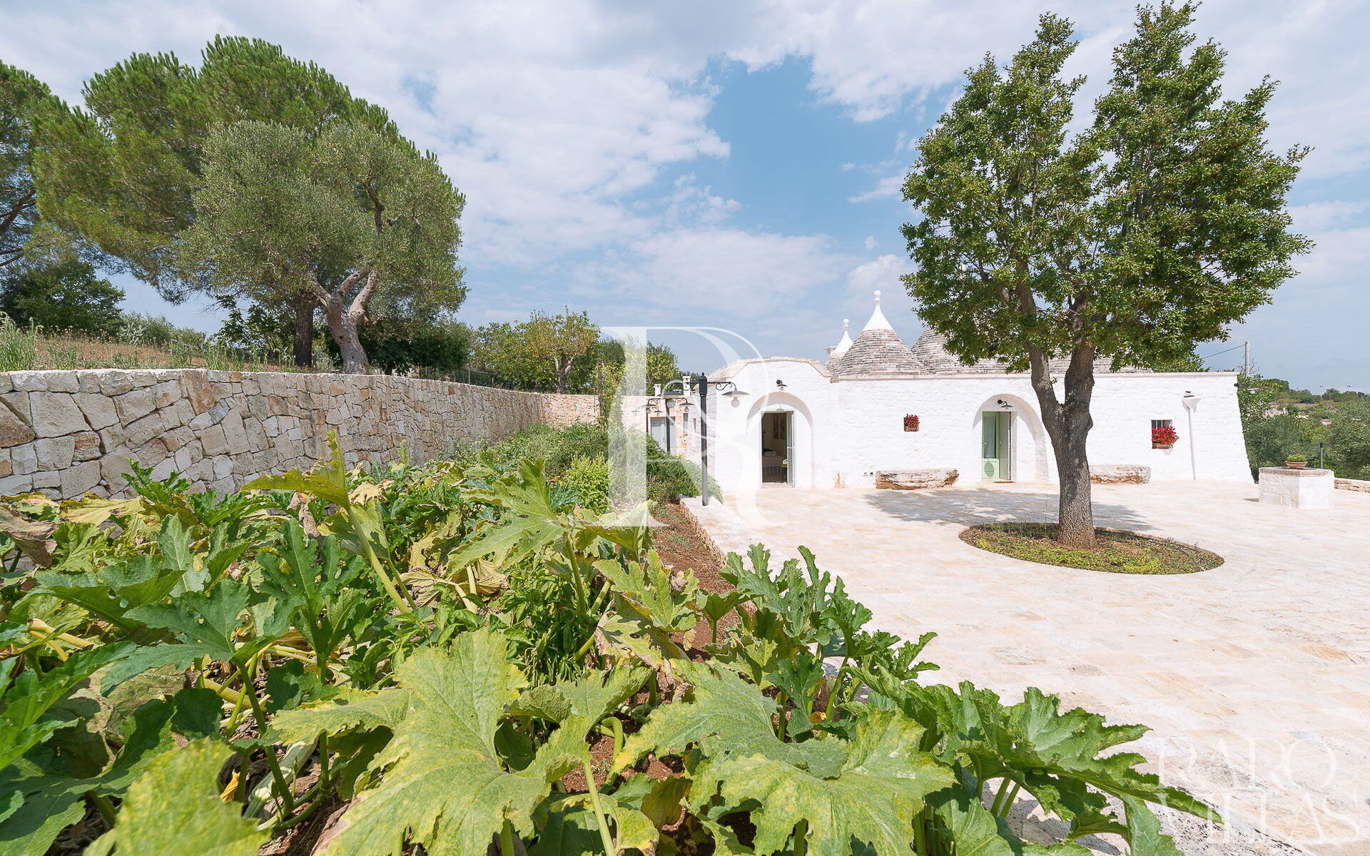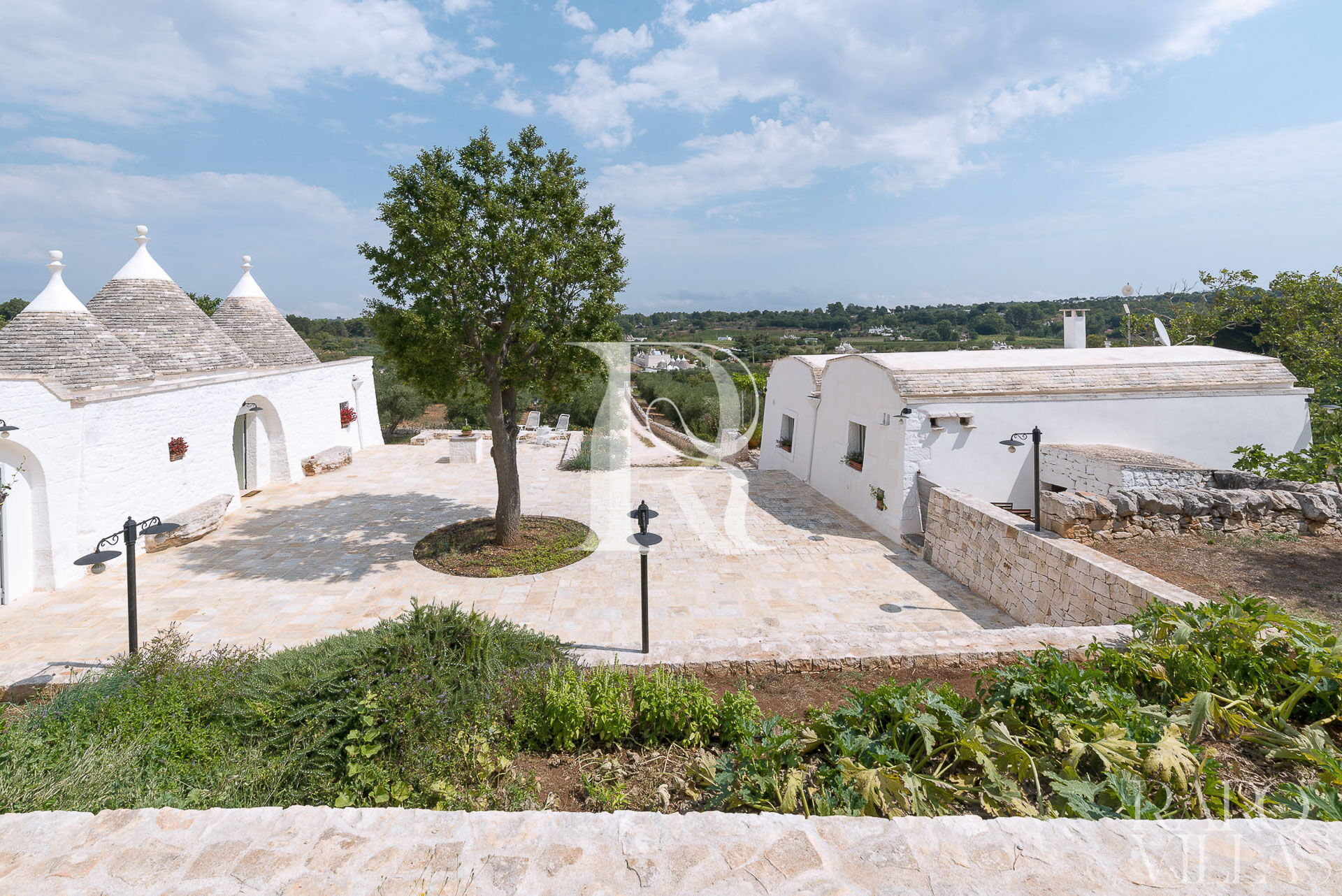 All'esterno del Trullo in affitto è presente il grande giardino con cucina esterna (forno a legna e lavastoviglie), impianto di filodiffusione BOSE e l'orto biologico con le due veranda al fresco.