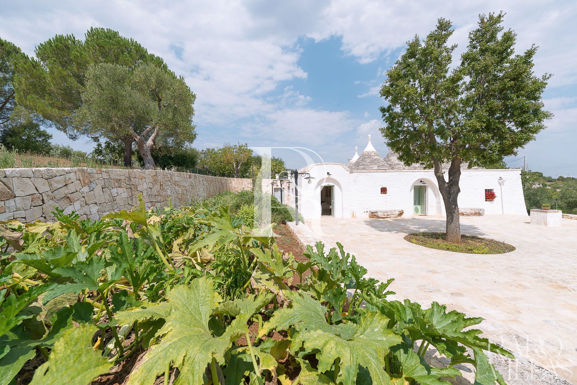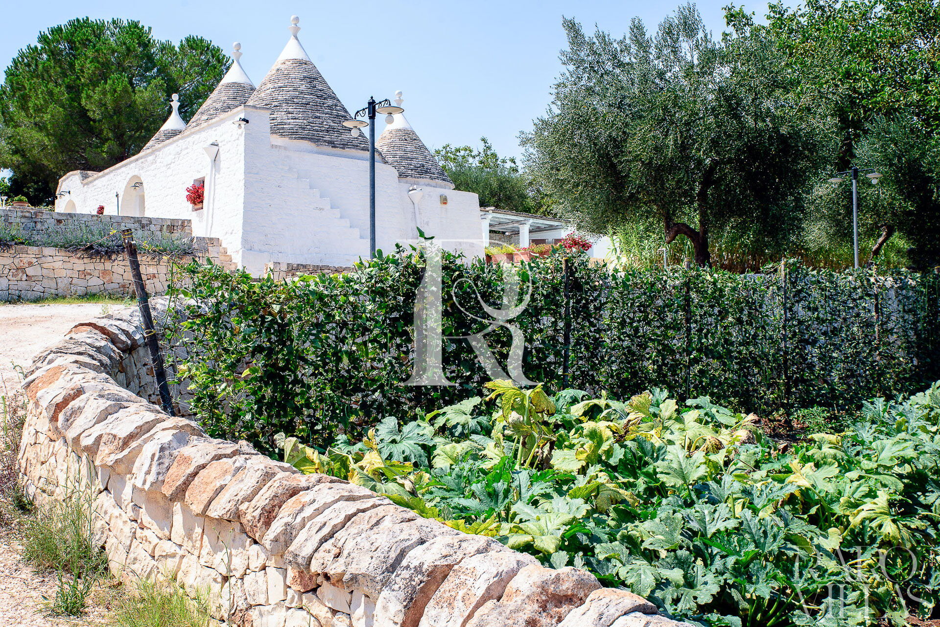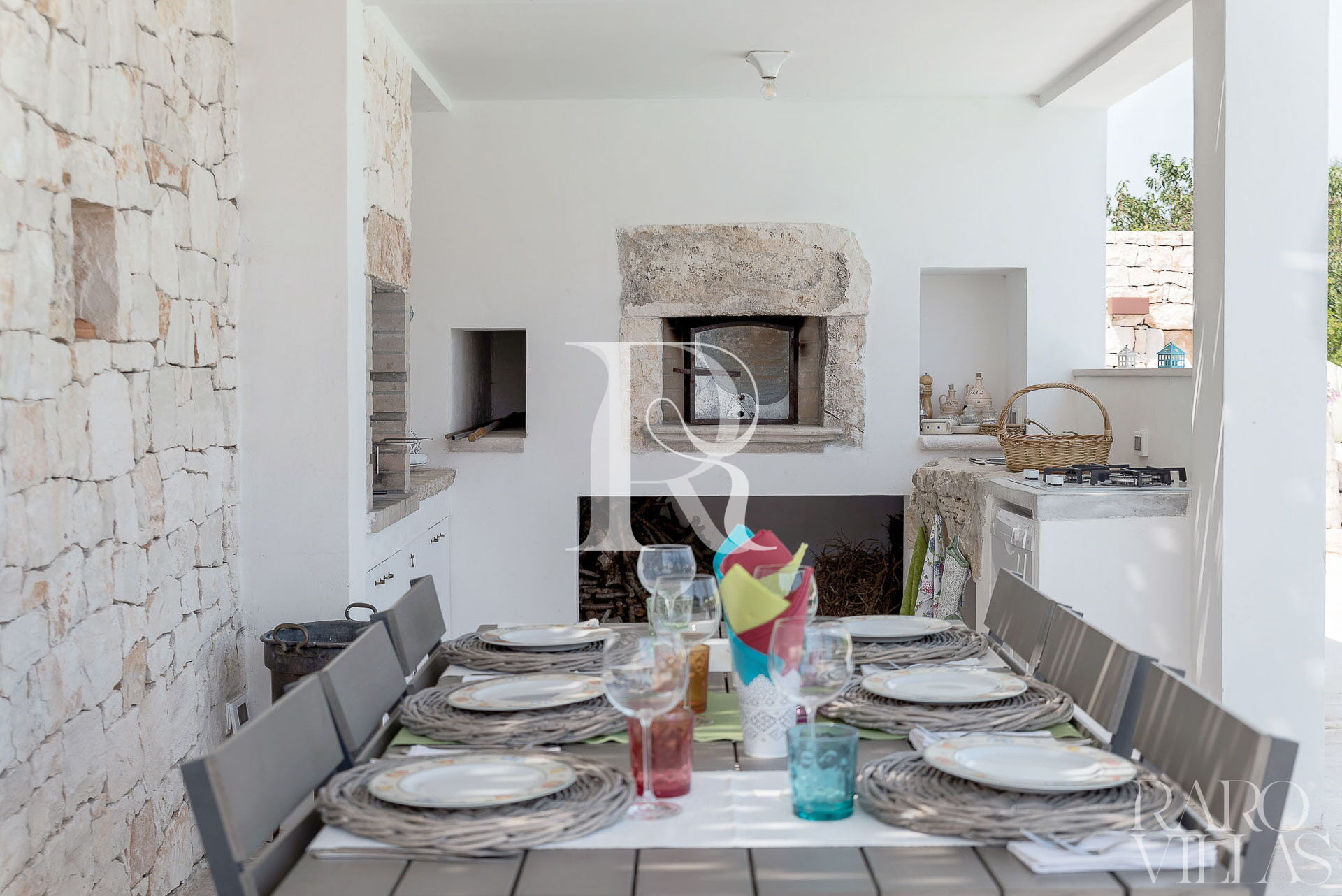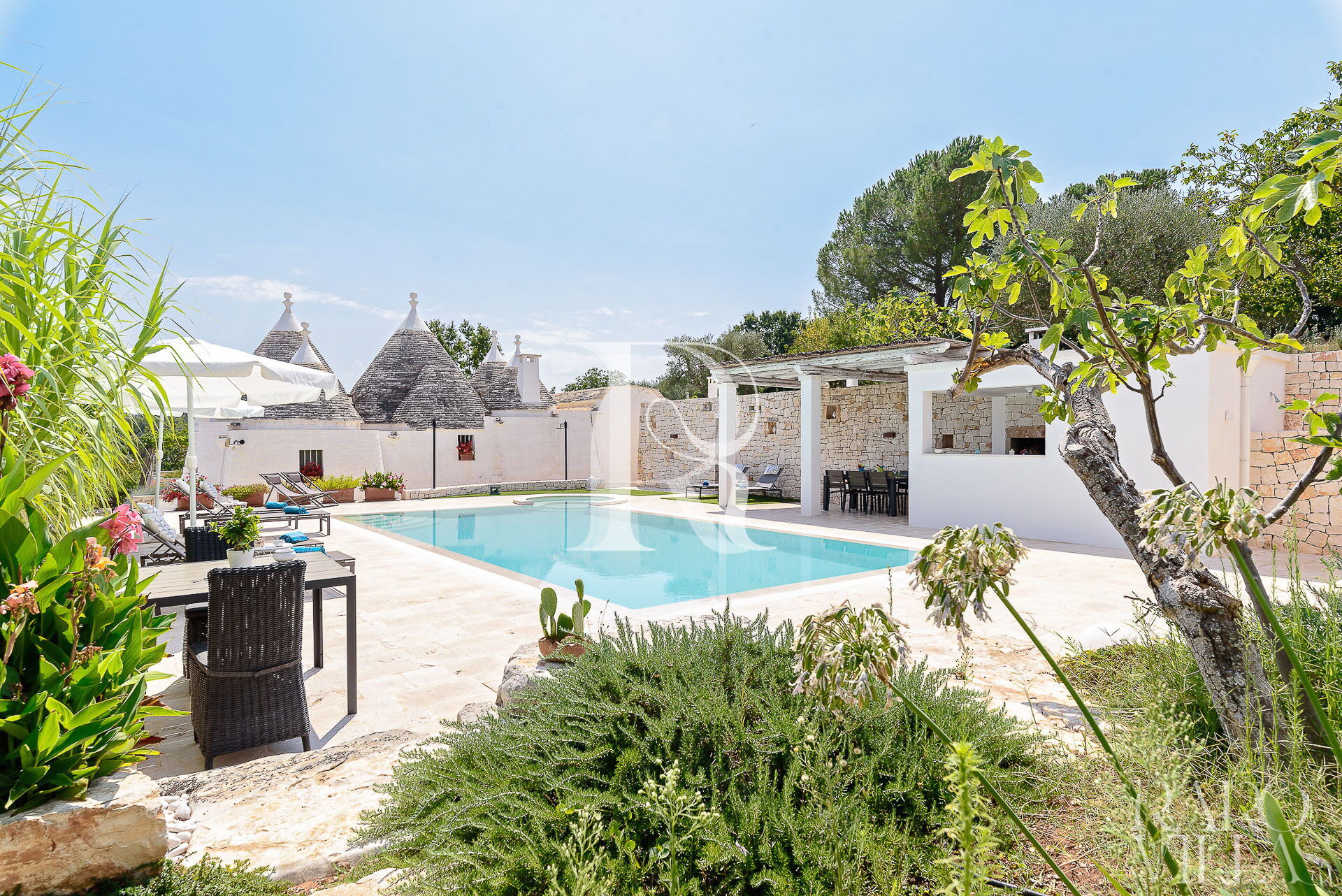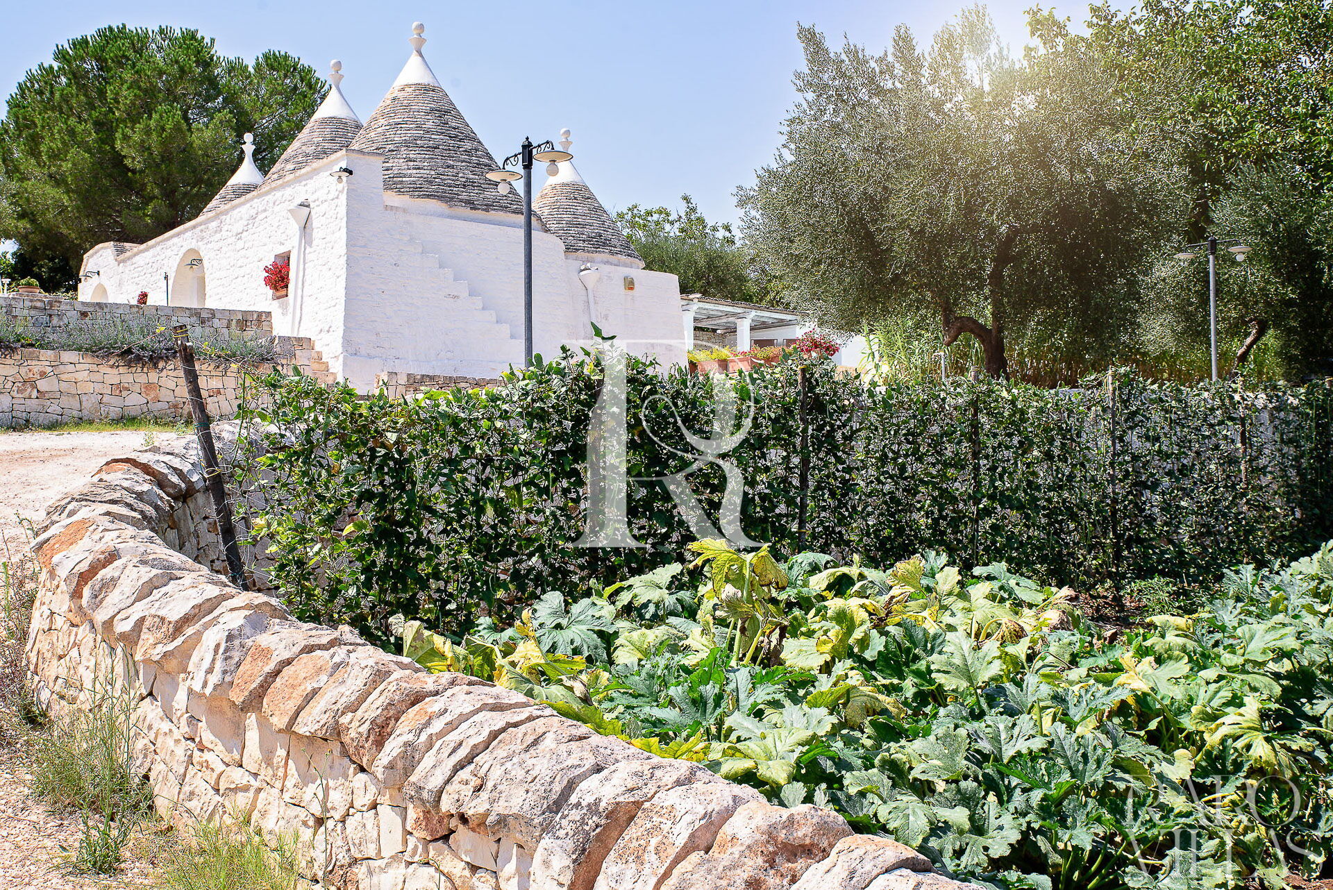 All'esterno del Trullo in affitto è presente il grande giardino con cucina esterna (forno a legna e lavastoviglie), impianto di filodiffusione BOSE e l'orto biologico con le due veranda al fresco.