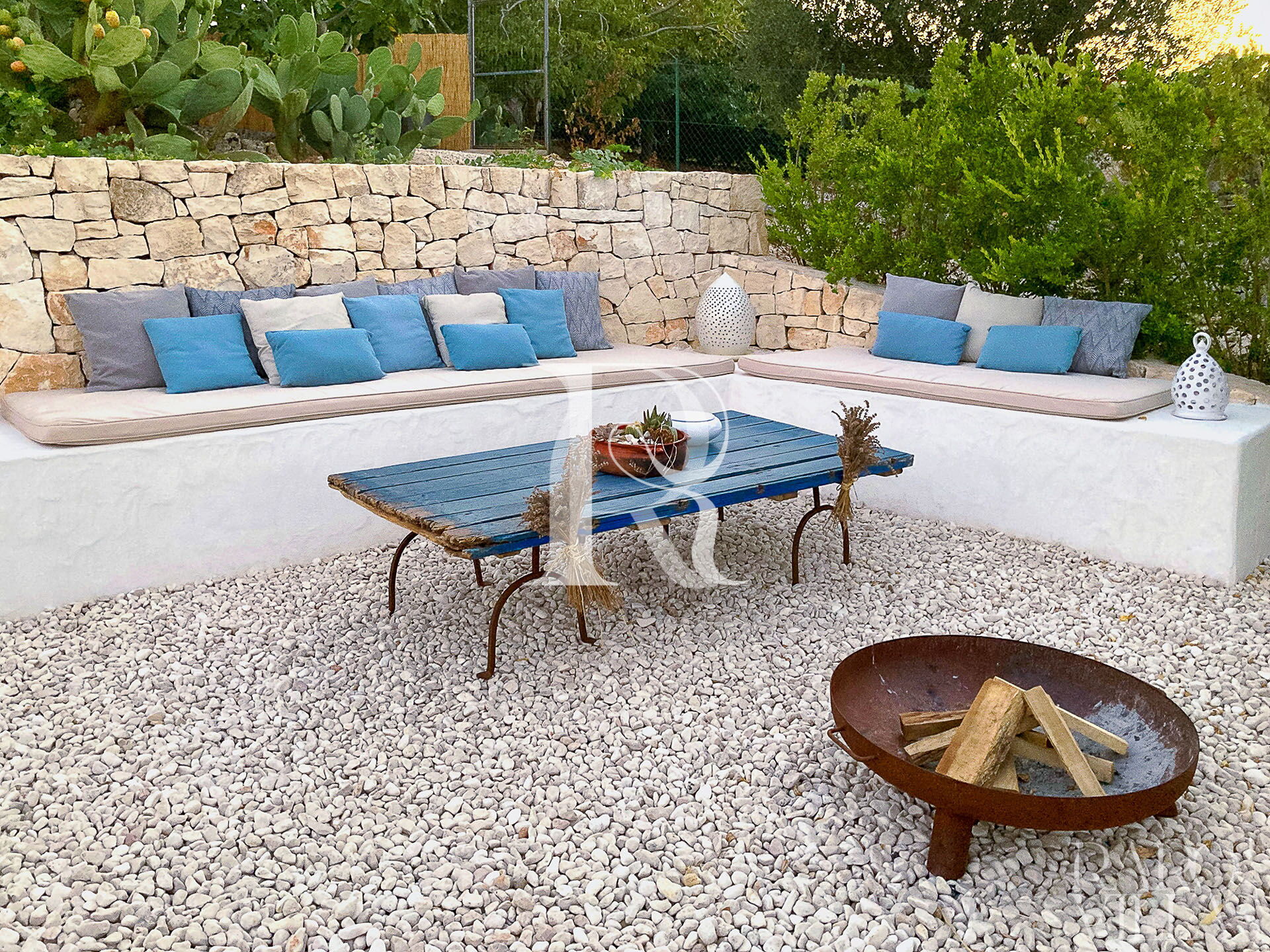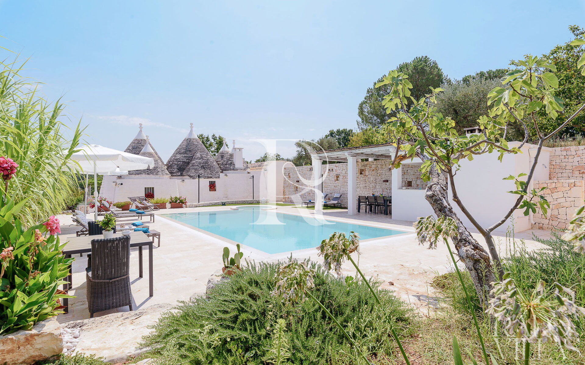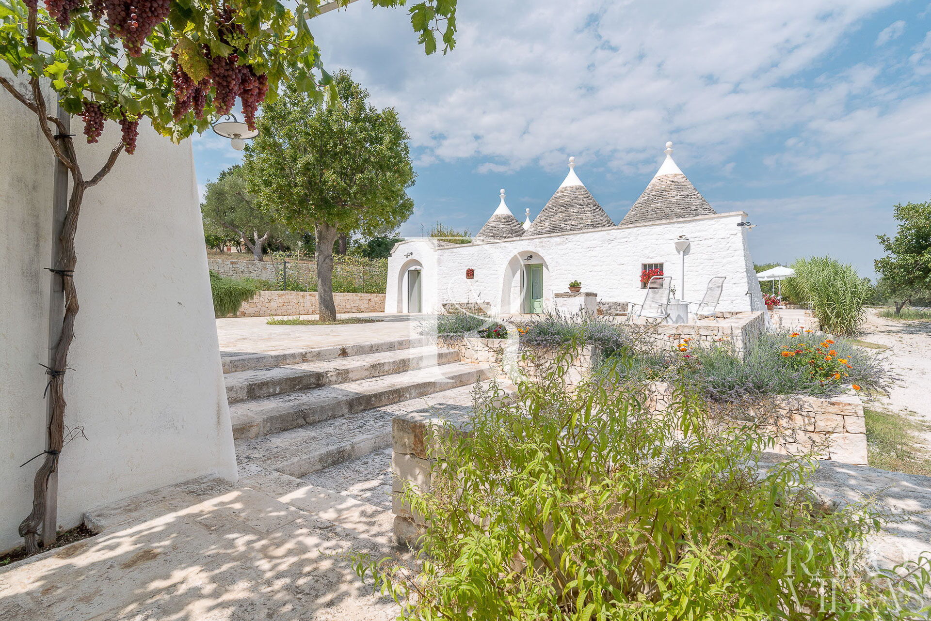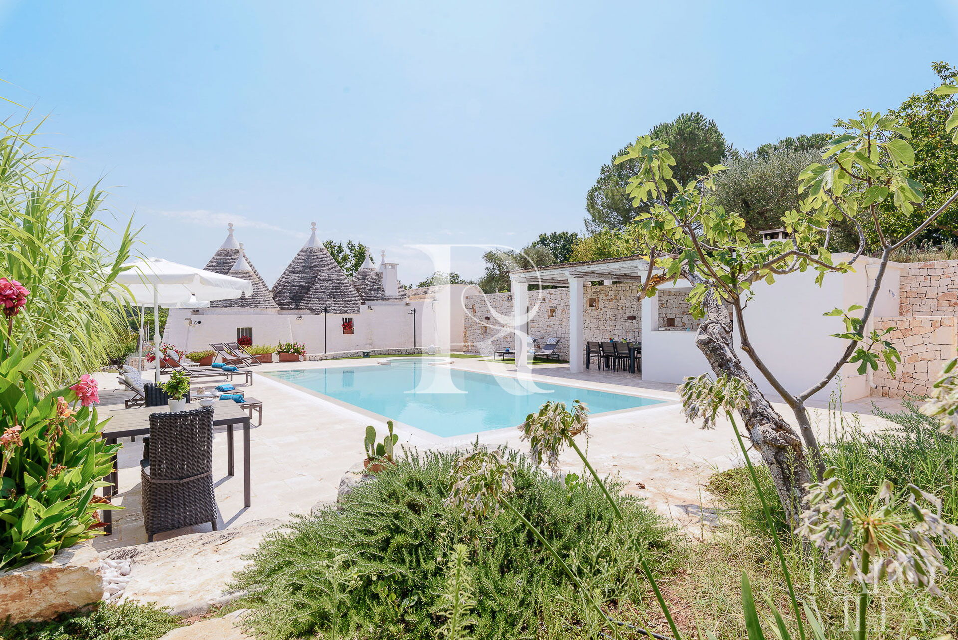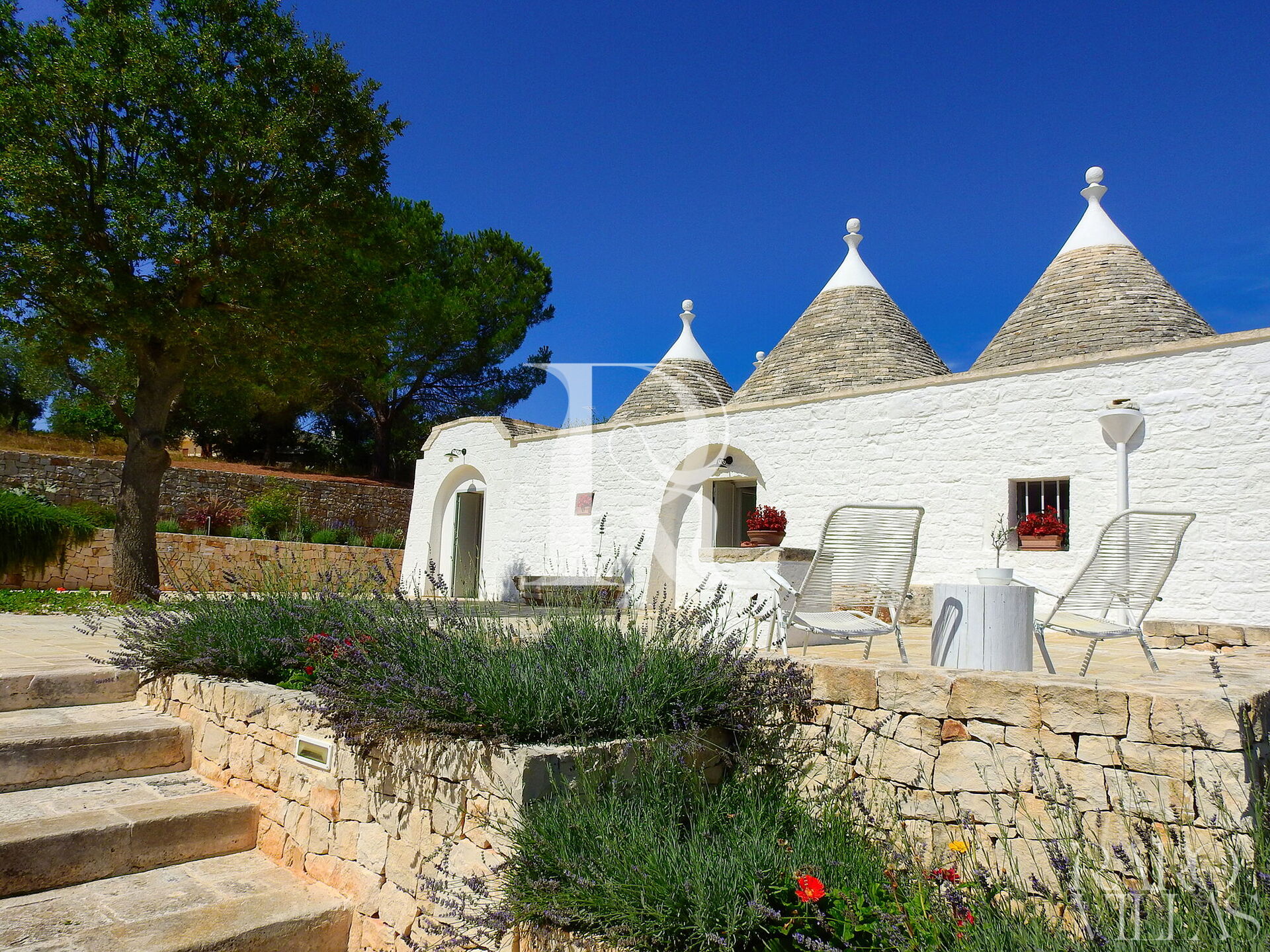 All'esterno del Trullo in affitto è presente il grande giardino con cucina esterna (forno a legna e lavastoviglie), impianto di filodiffusione BOSE e l'orto biologico con le due veranda al fresco.