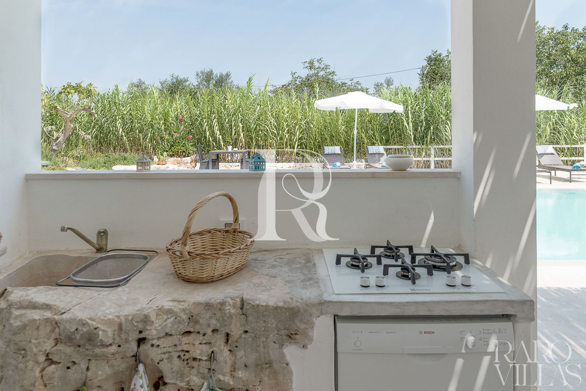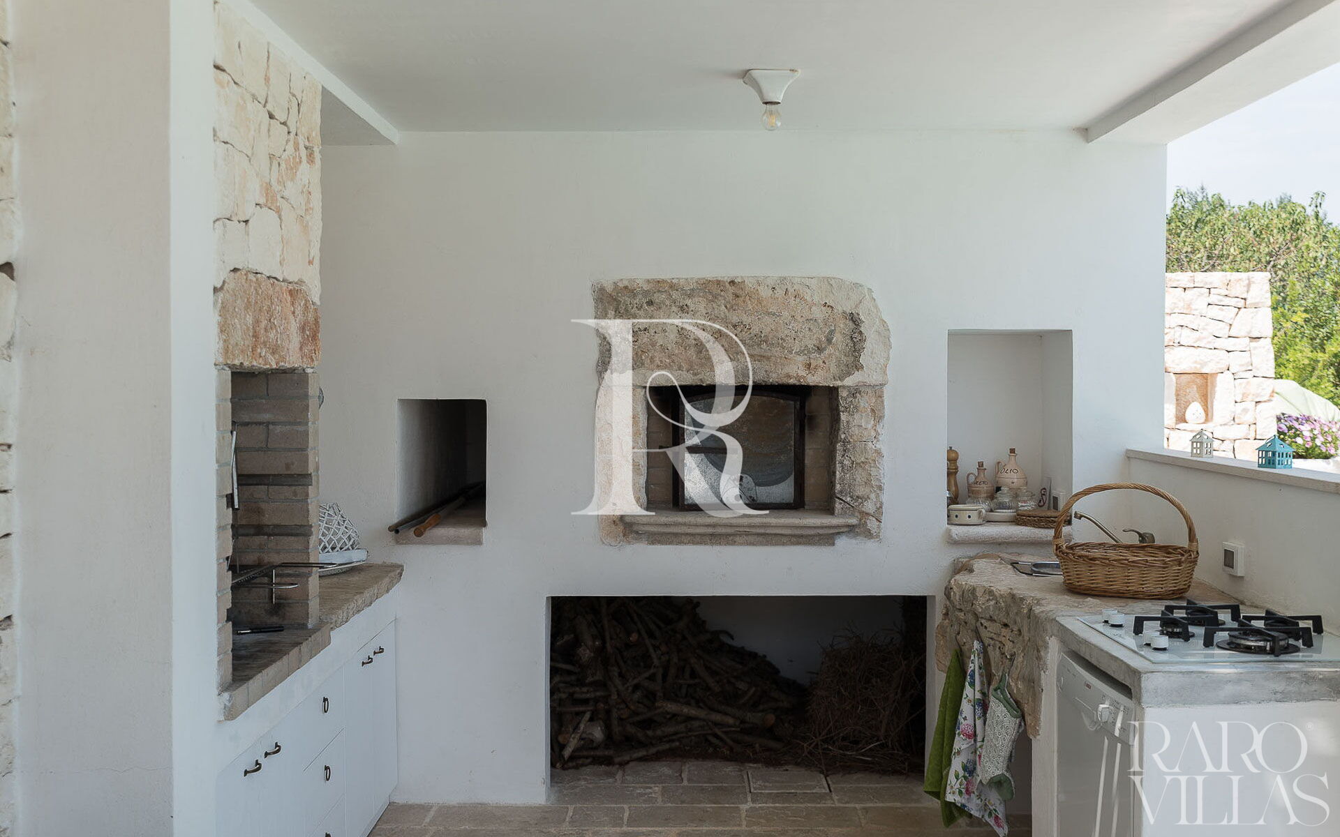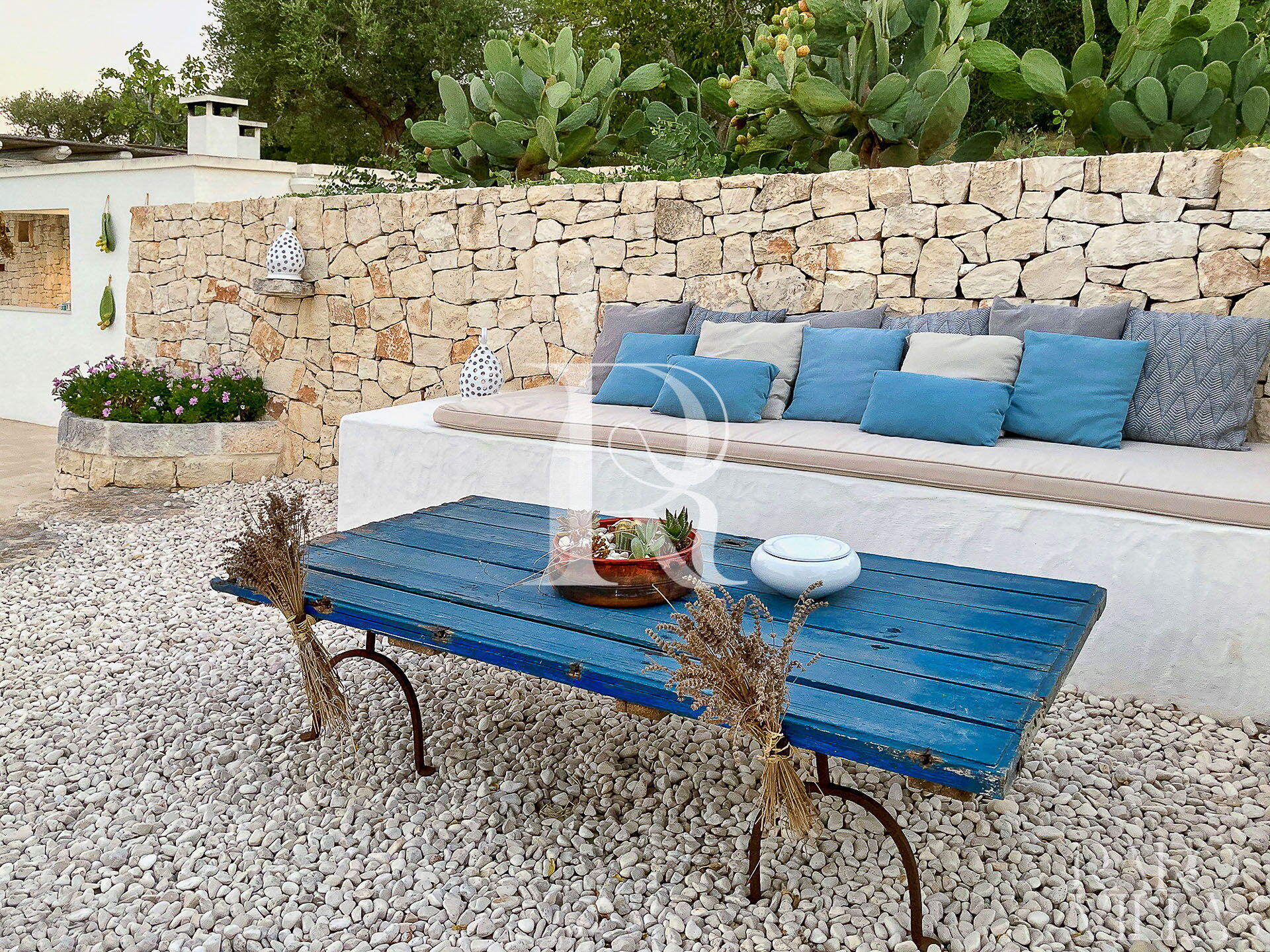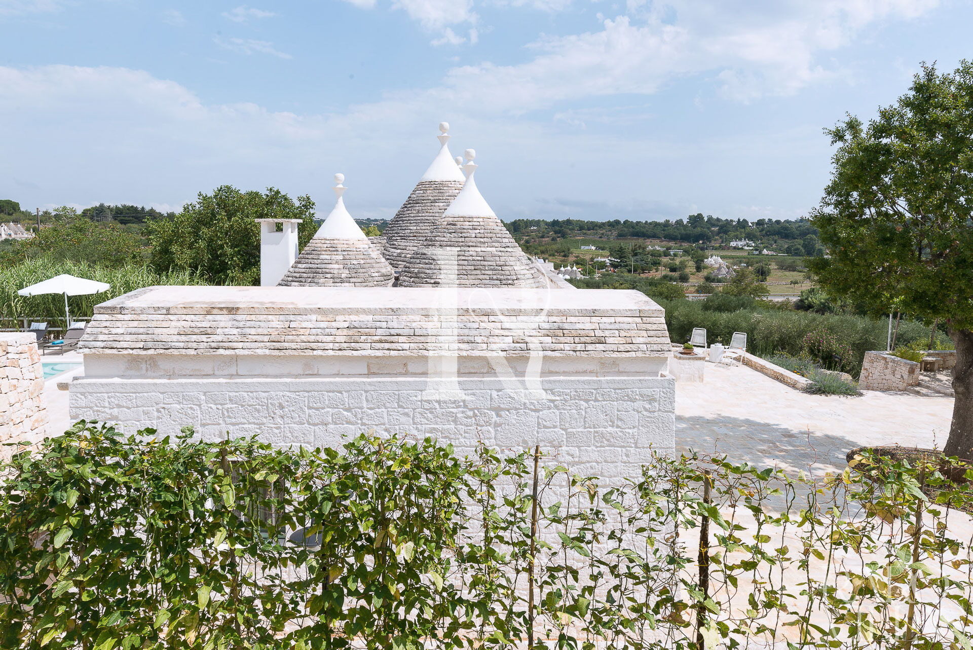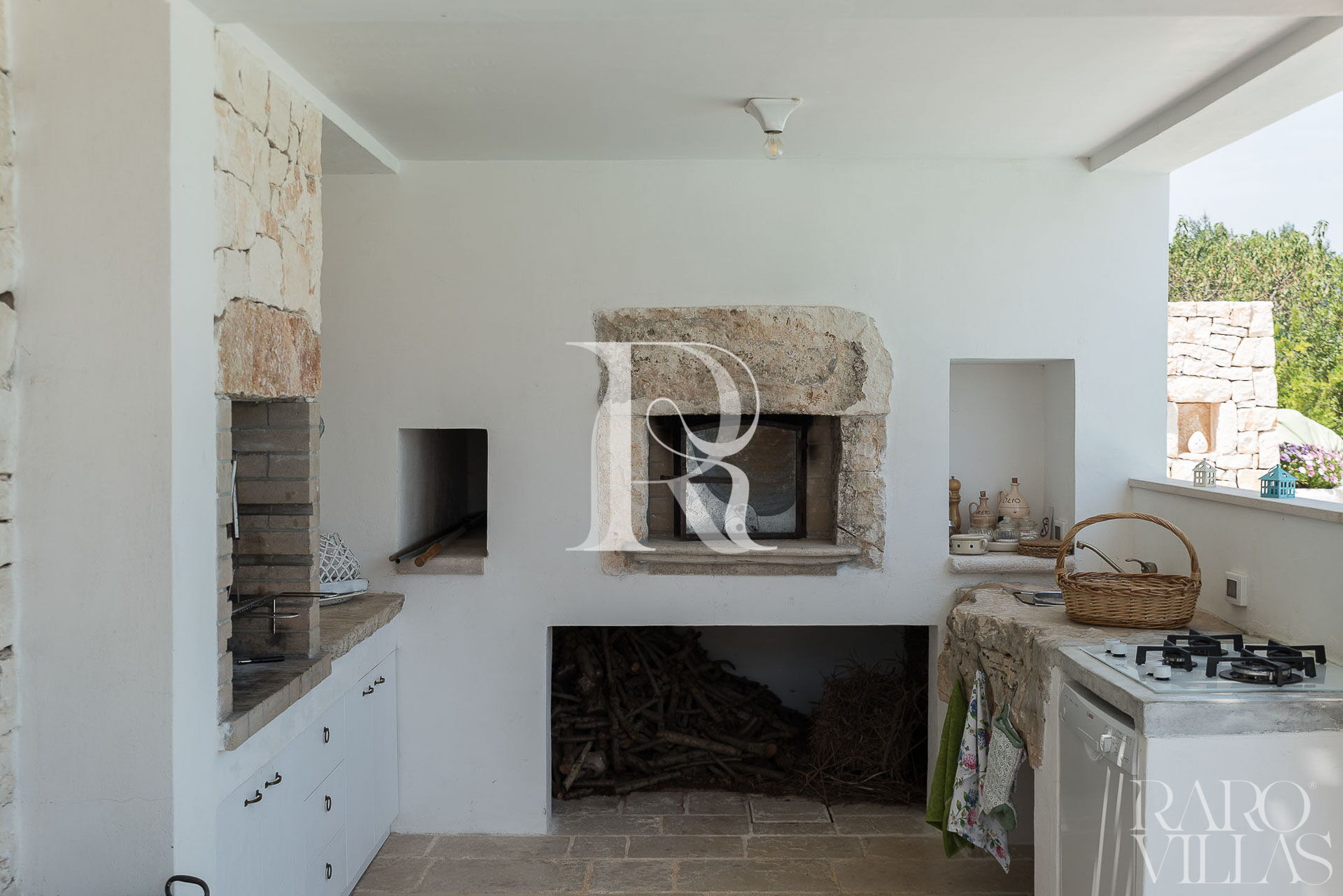 All'esterno del Trullo in affitto è presente il grande giardino con cucina esterna (forno a legna e lavastoviglie), impianto di filodiffusione BOSE e l'orto biologico con le due veranda al fresco.