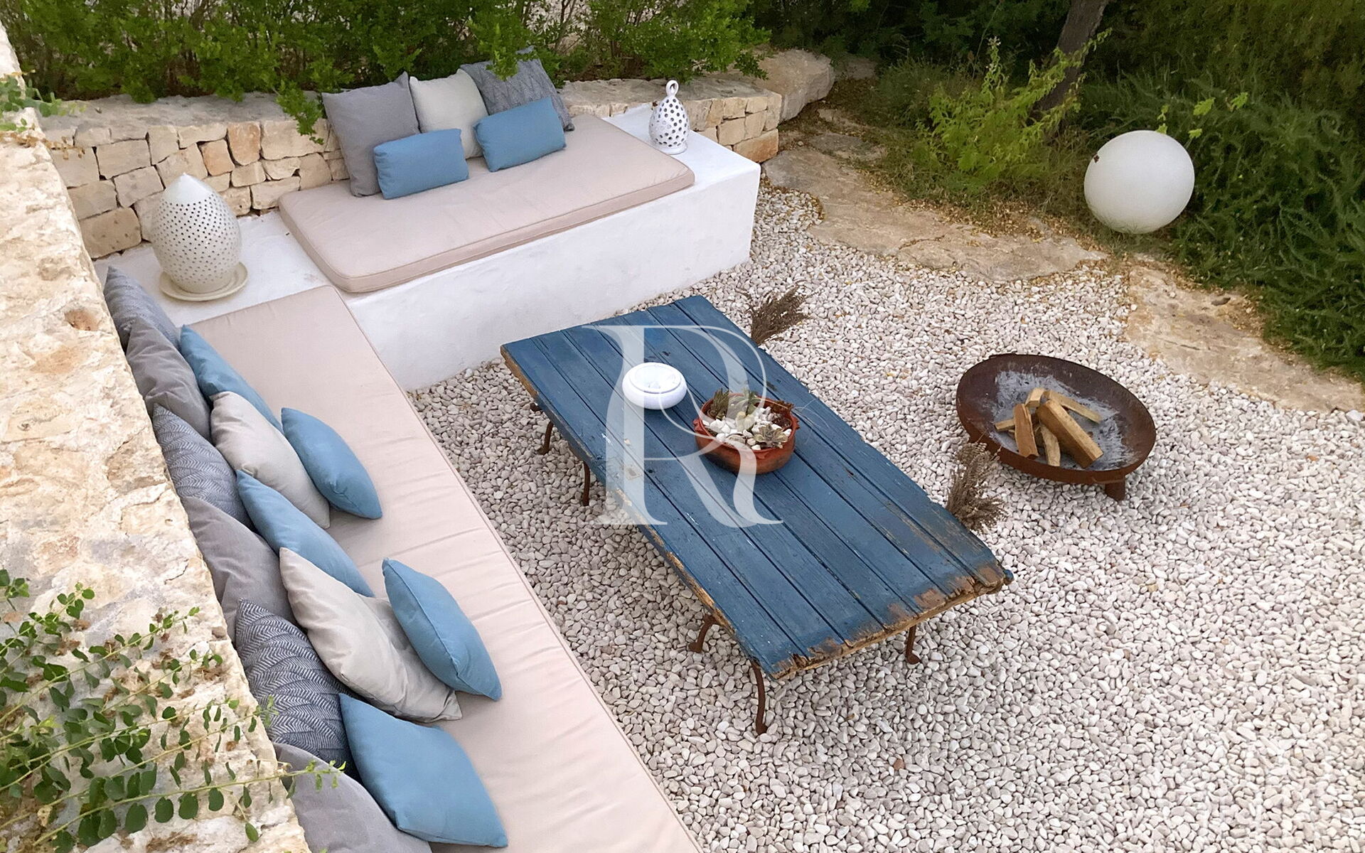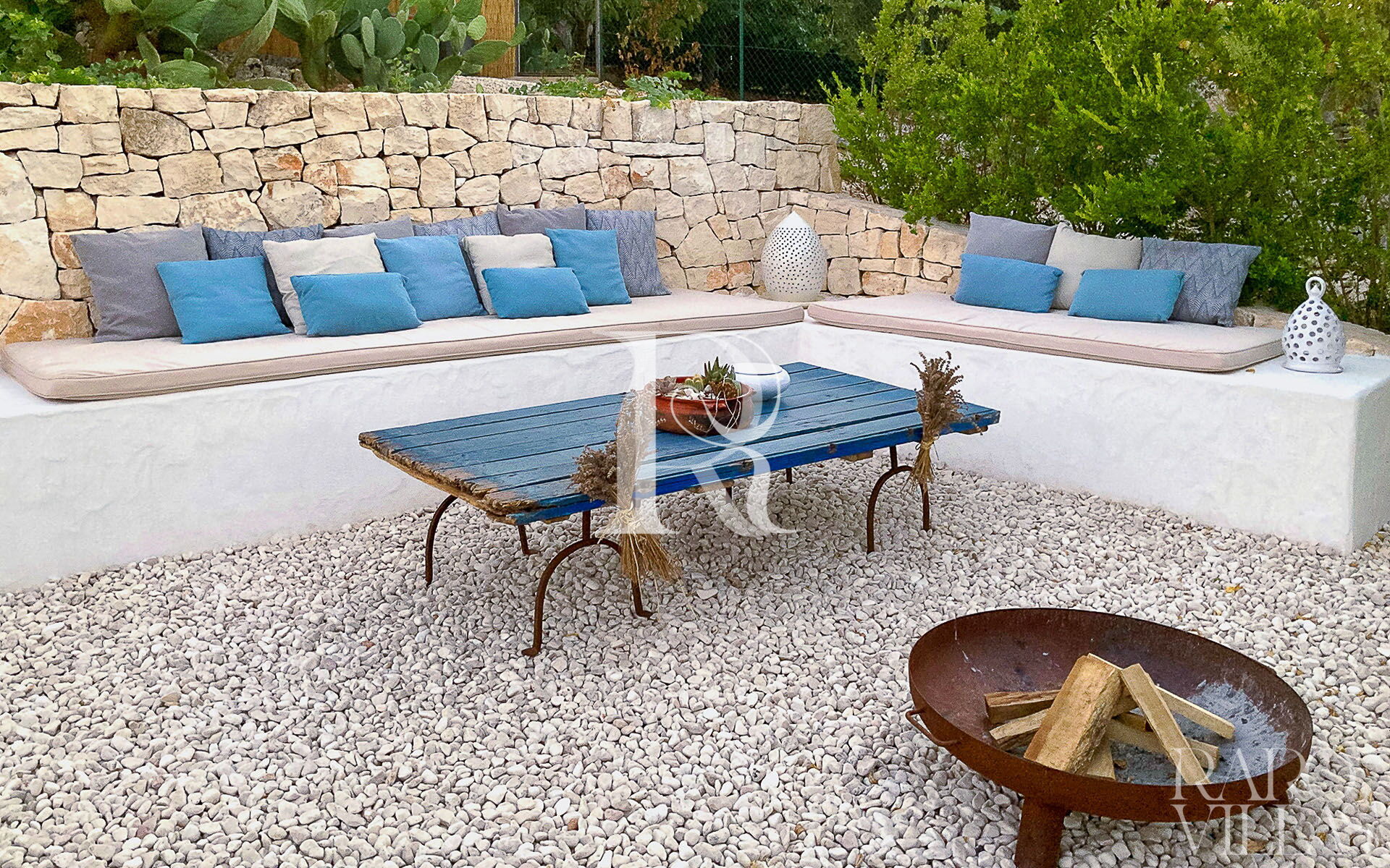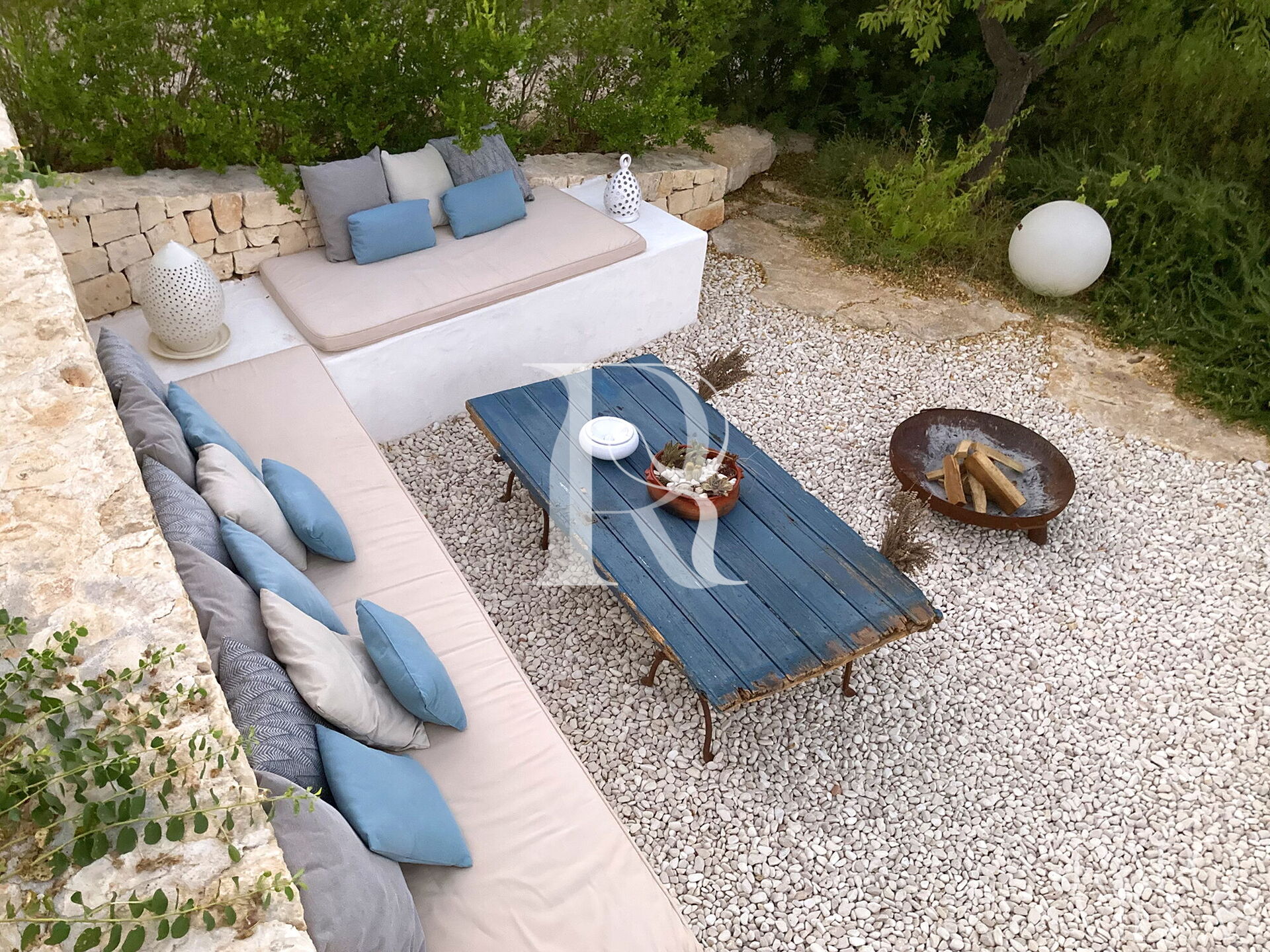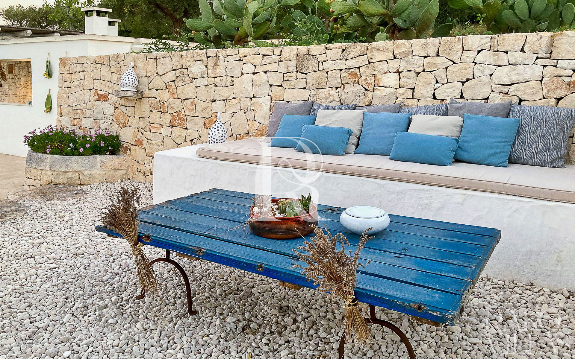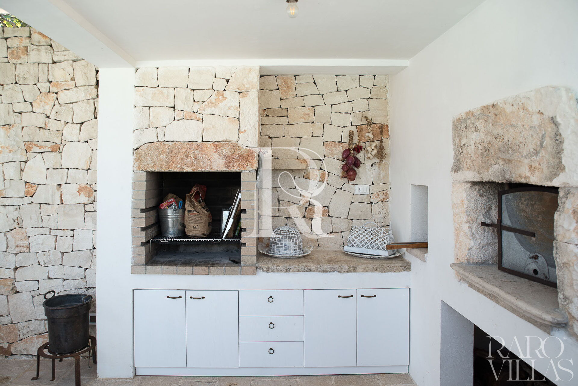 All'esterno del Trullo in affitto è presente il grande giardino con cucina esterna (forno a legna e lavastoviglie), impianto di filodiffusione BOSE e l'orto biologico con le due veranda al fresco.