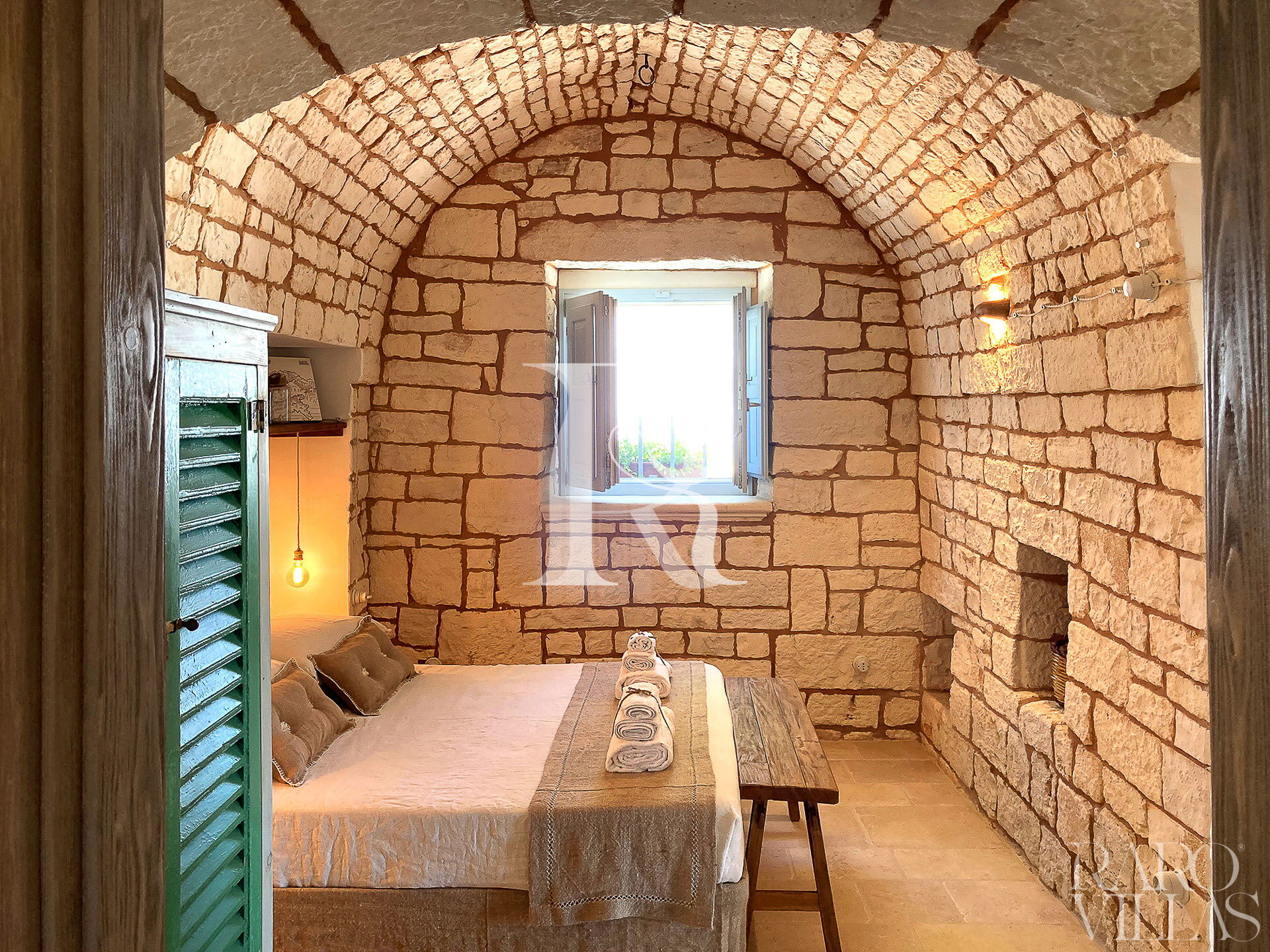 Trullo Oak è composto da due camere matrimoniali molto luminose e una camera doppia con finestre che permettono una vista sulla campagna circostante, ma ciò che le rende uniche sono le volte con pietra a vista che danno un tocco caratteristico, unico e particolare a questi ambienti. I bagni sono 5 in tutto, di cui uno esterno vicino alla piscina; i bagni sono composti da WC, bidet, lavabo e doccia.
