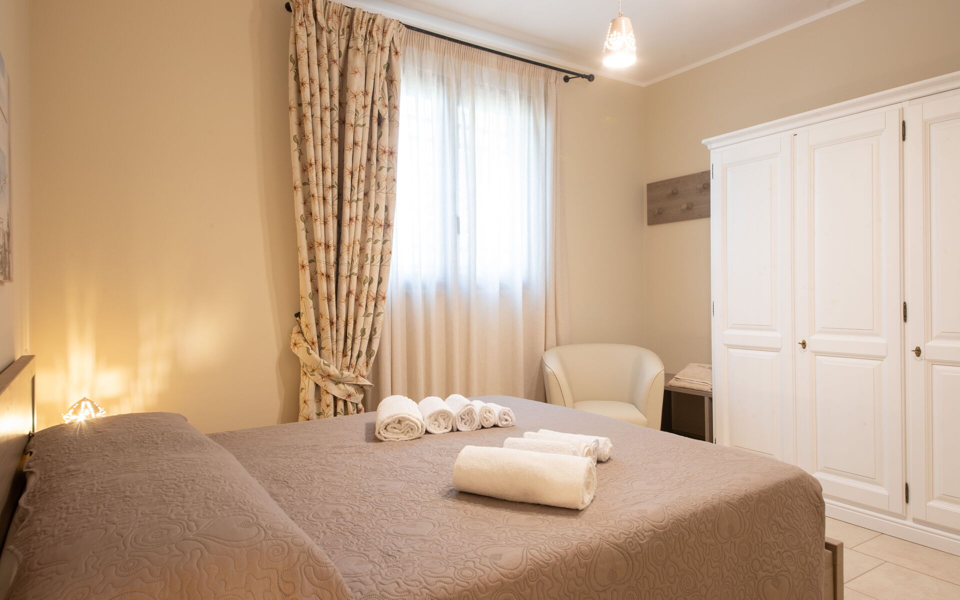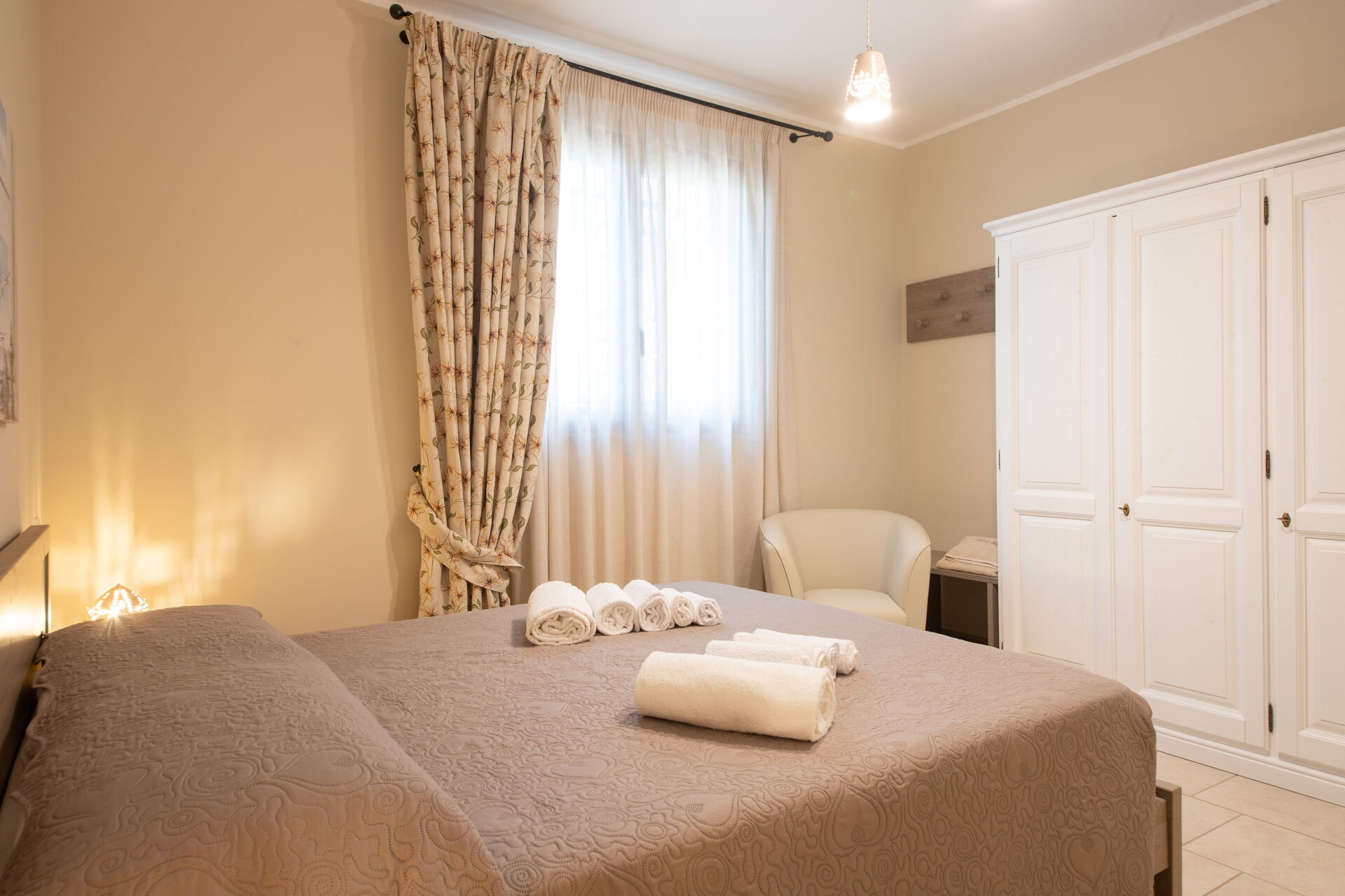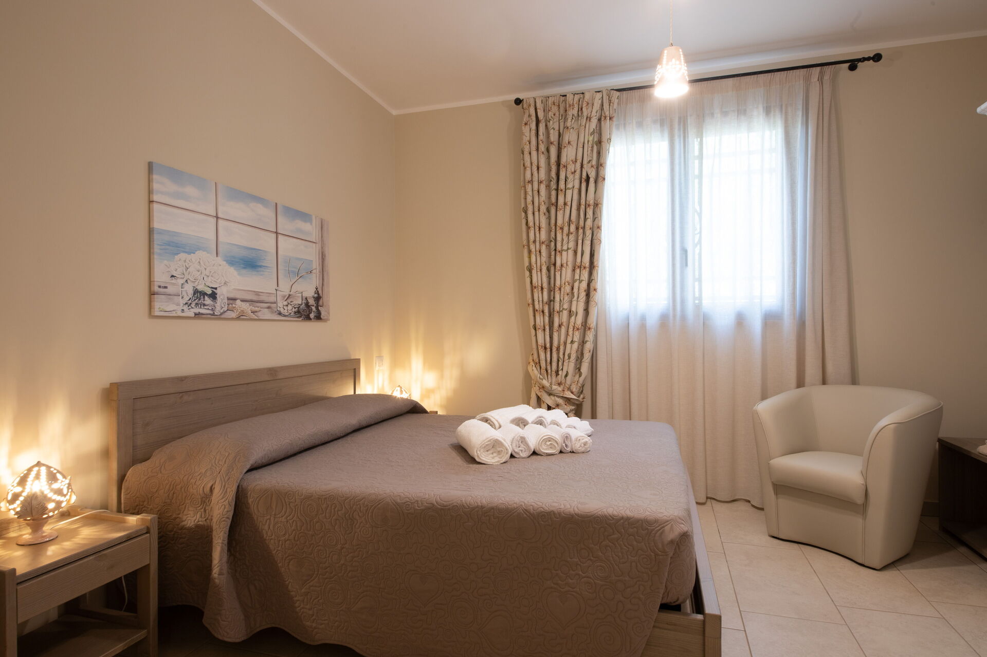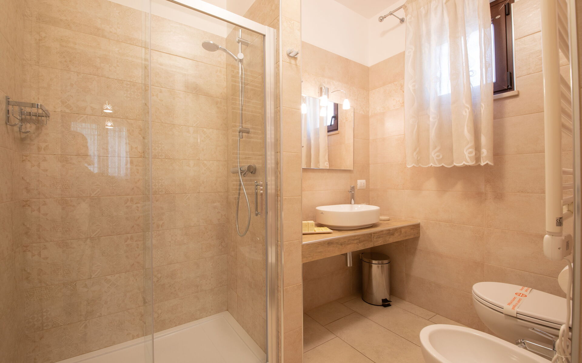 Piano terreno rialzato: soggiorno, 2 camere matrimoniali (aria condizionata, frigobar, tv, zanzariere) con bagno privato con doccia, camera con 2 letti singoli (aria condizionata, frigobar, tv, zanzariere) con bagno privato con doccia.
