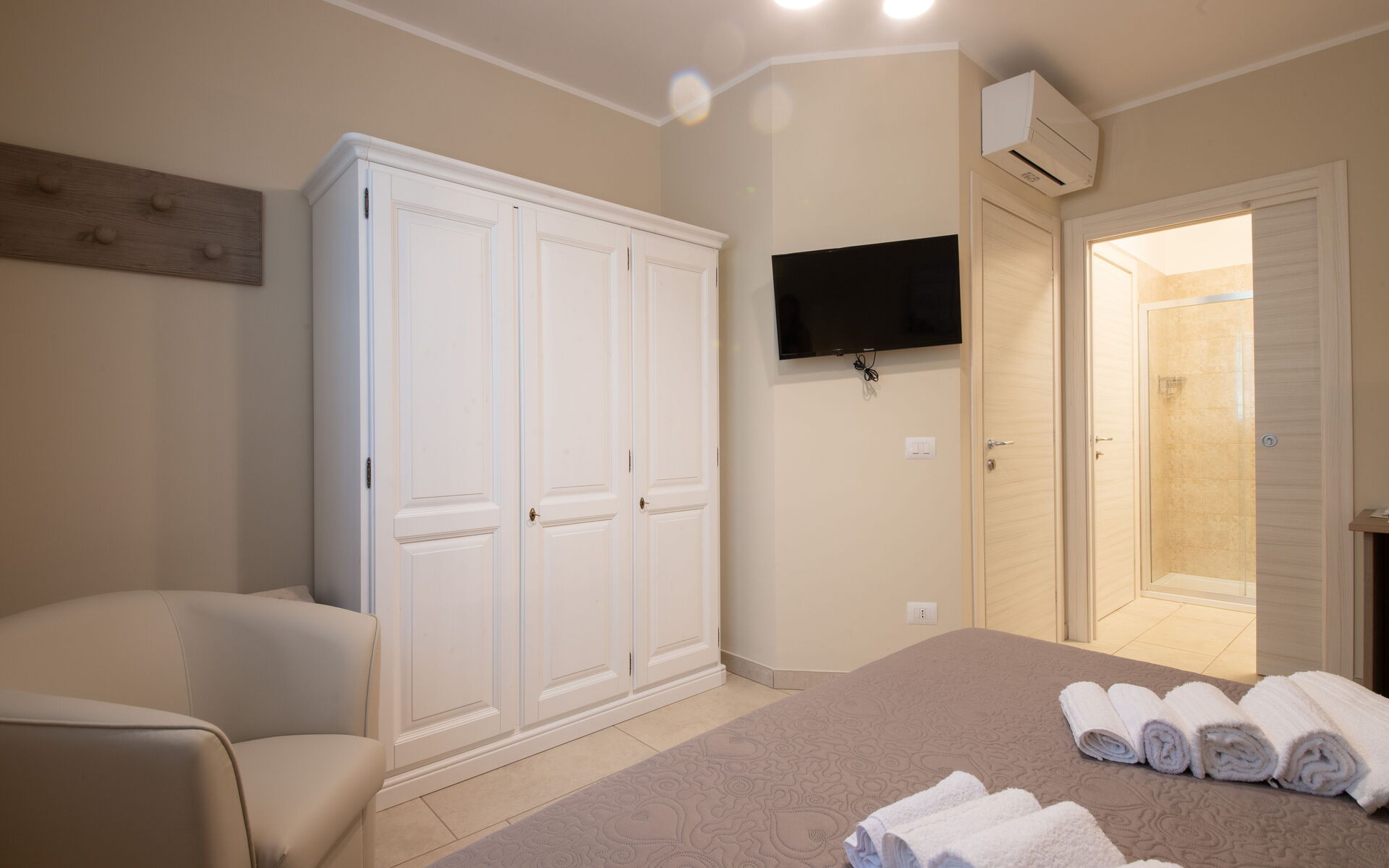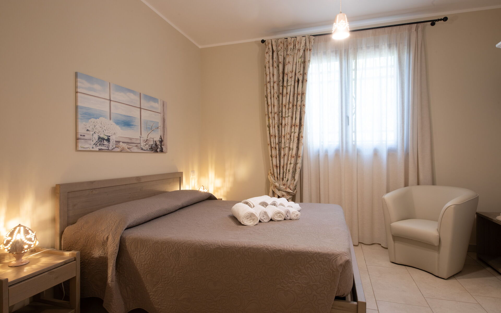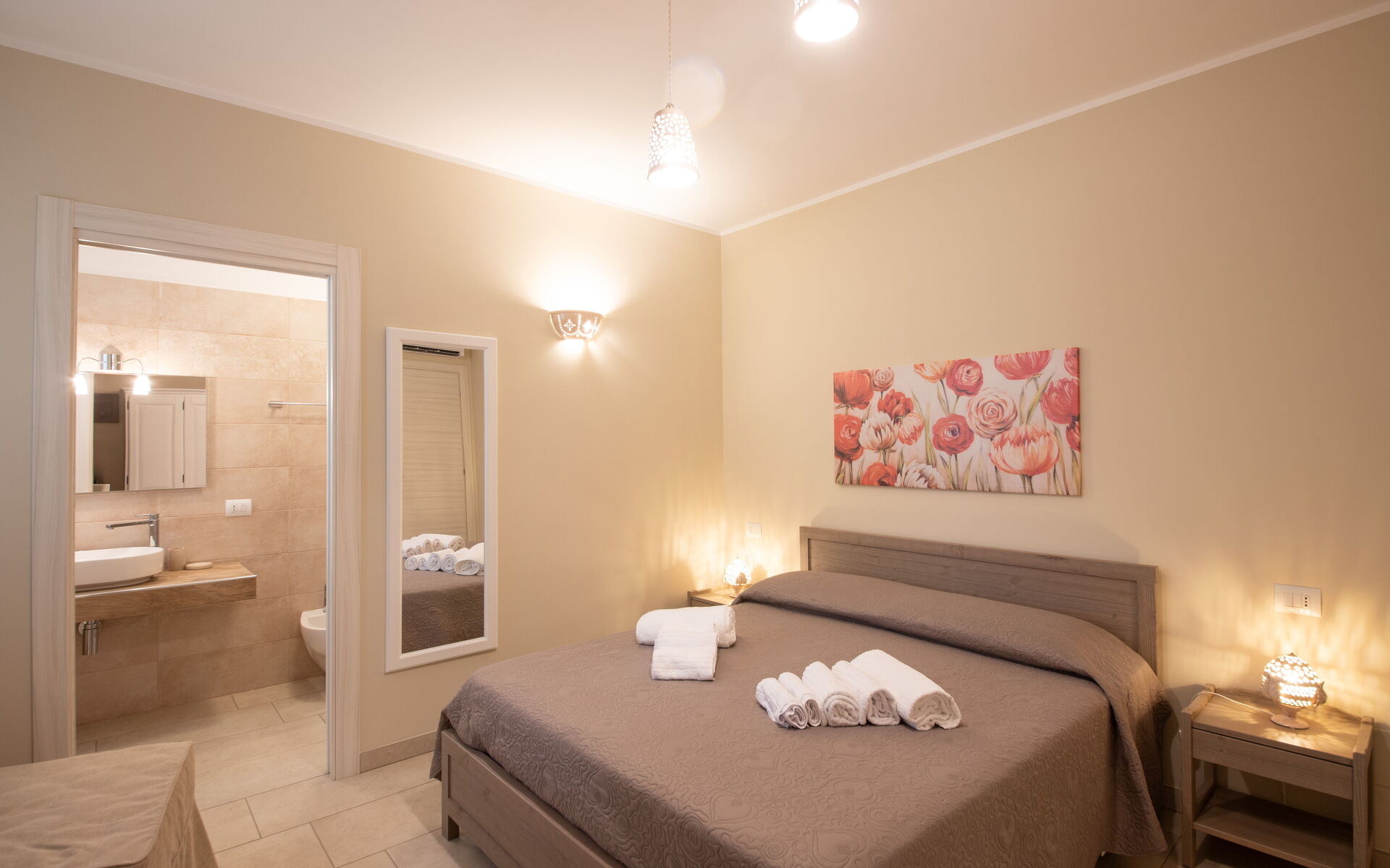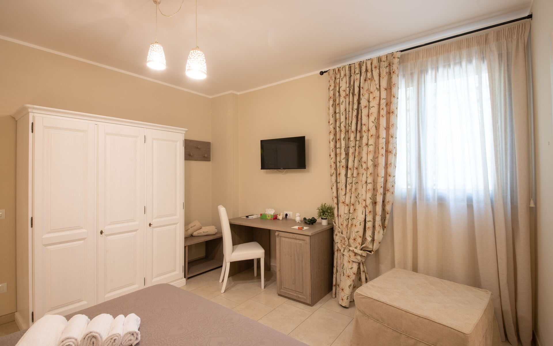Piano terreno rialzato: soggiorno, 2 camere matrimoniali (aria condizionata, frigobar, tv, zanzariere) con bagno privato con doccia, camera con 2 letti singoli (aria condizionata, frigobar, tv, zanzariere) con bagno privato con doccia.