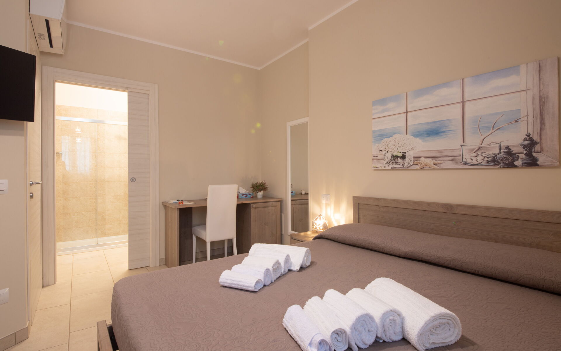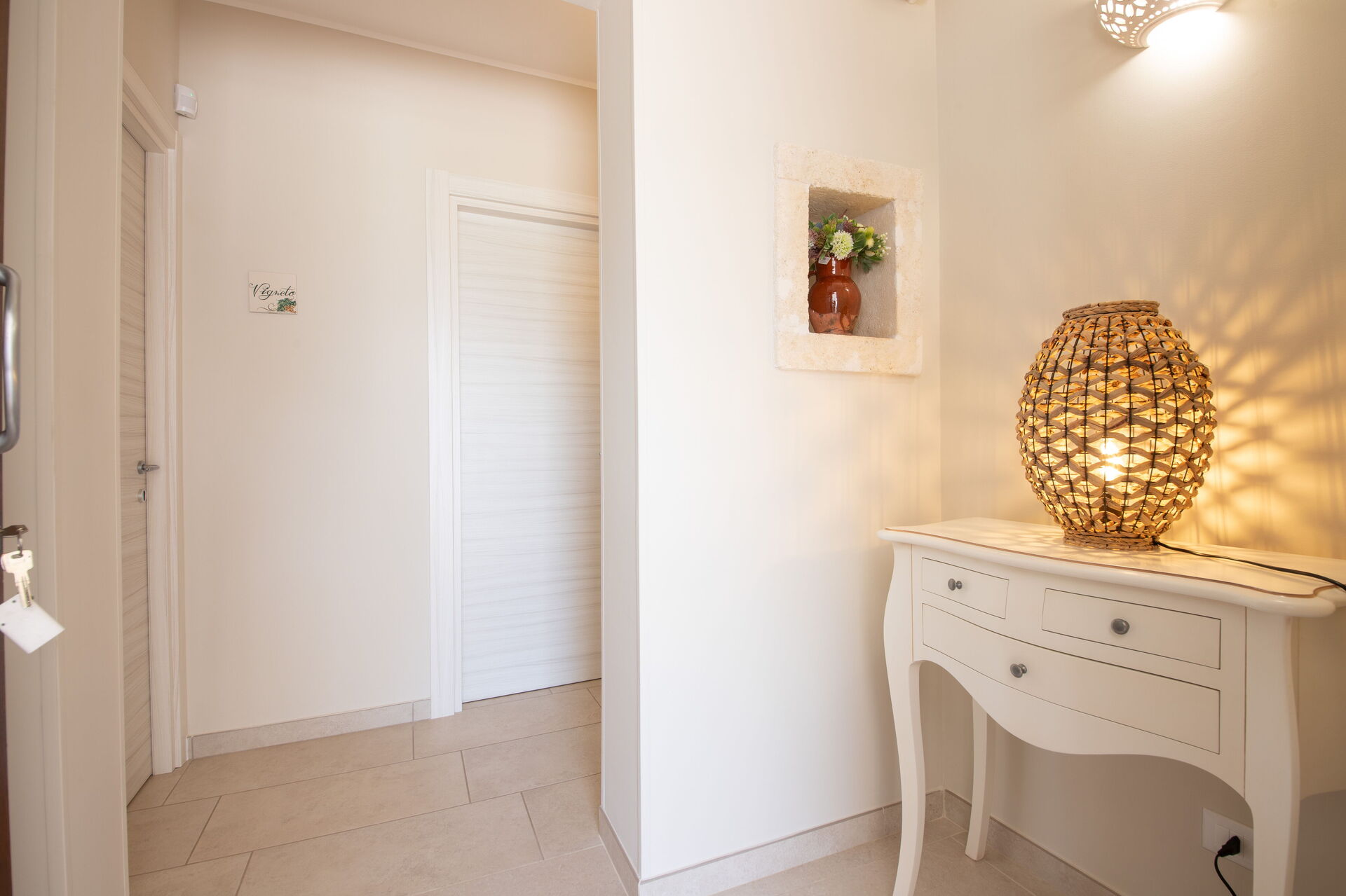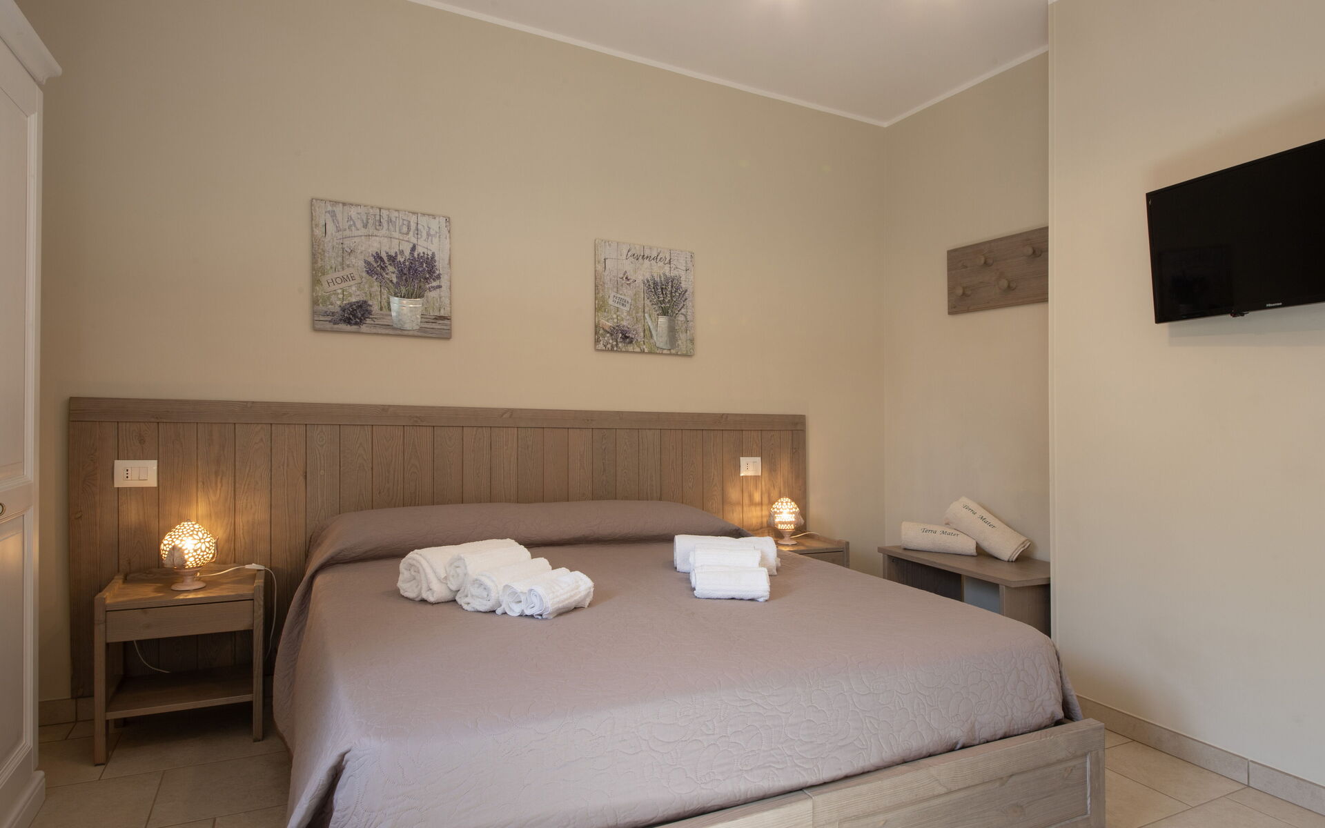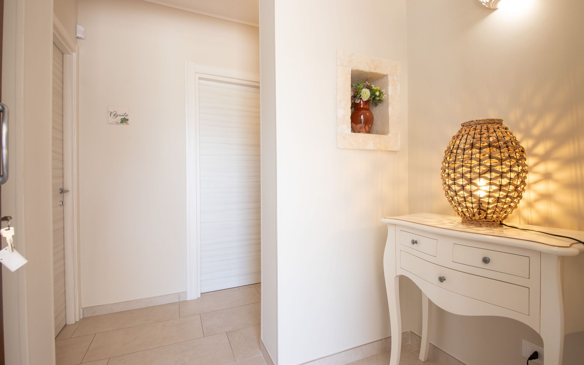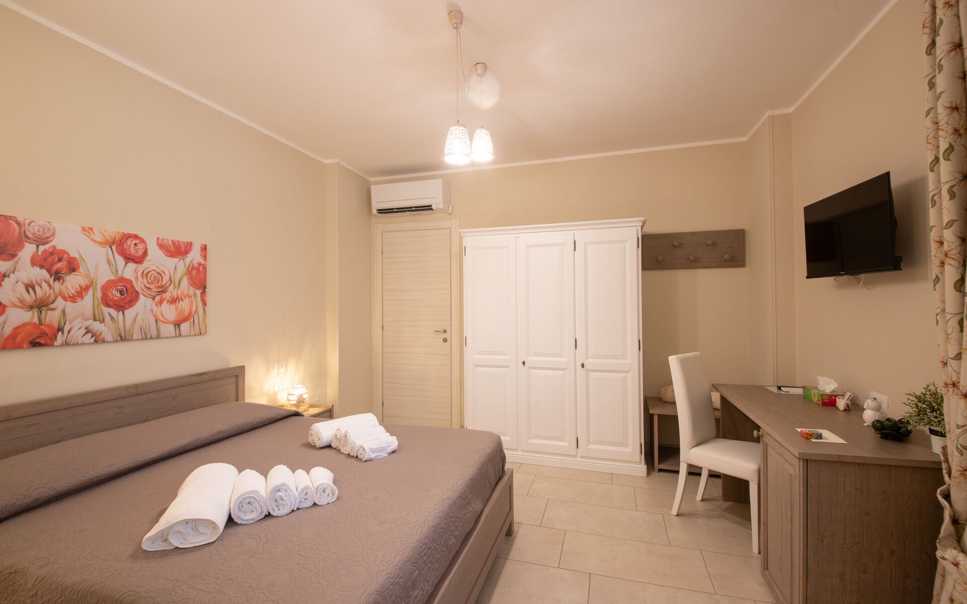 Piano terreno rialzato: soggiorno, 2 camere matrimoniali (aria condizionata, frigobar, tv, zanzariere) con bagno privato con doccia, camera con 2 letti singoli (aria condizionata, frigobar, tv, zanzariere) con bagno privato con doccia.