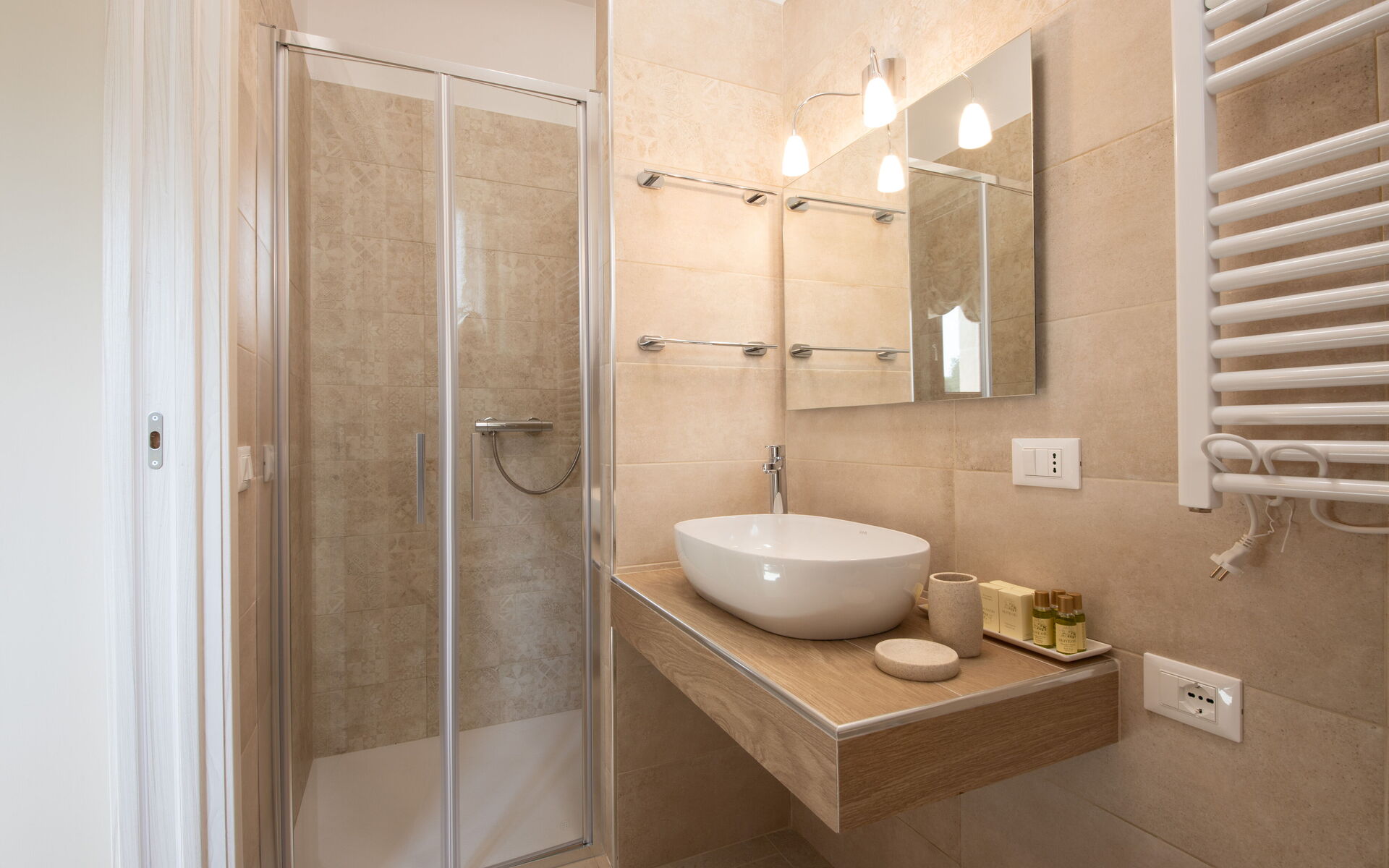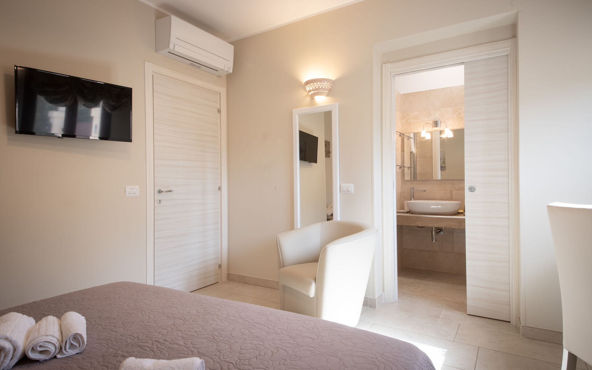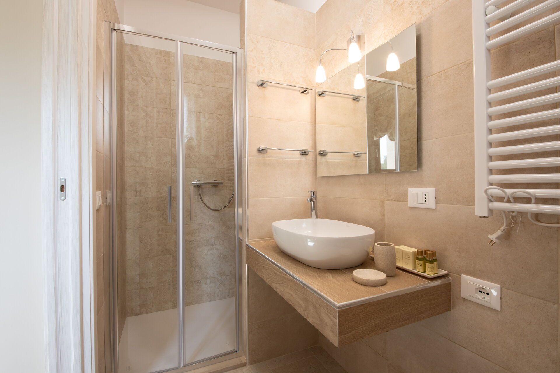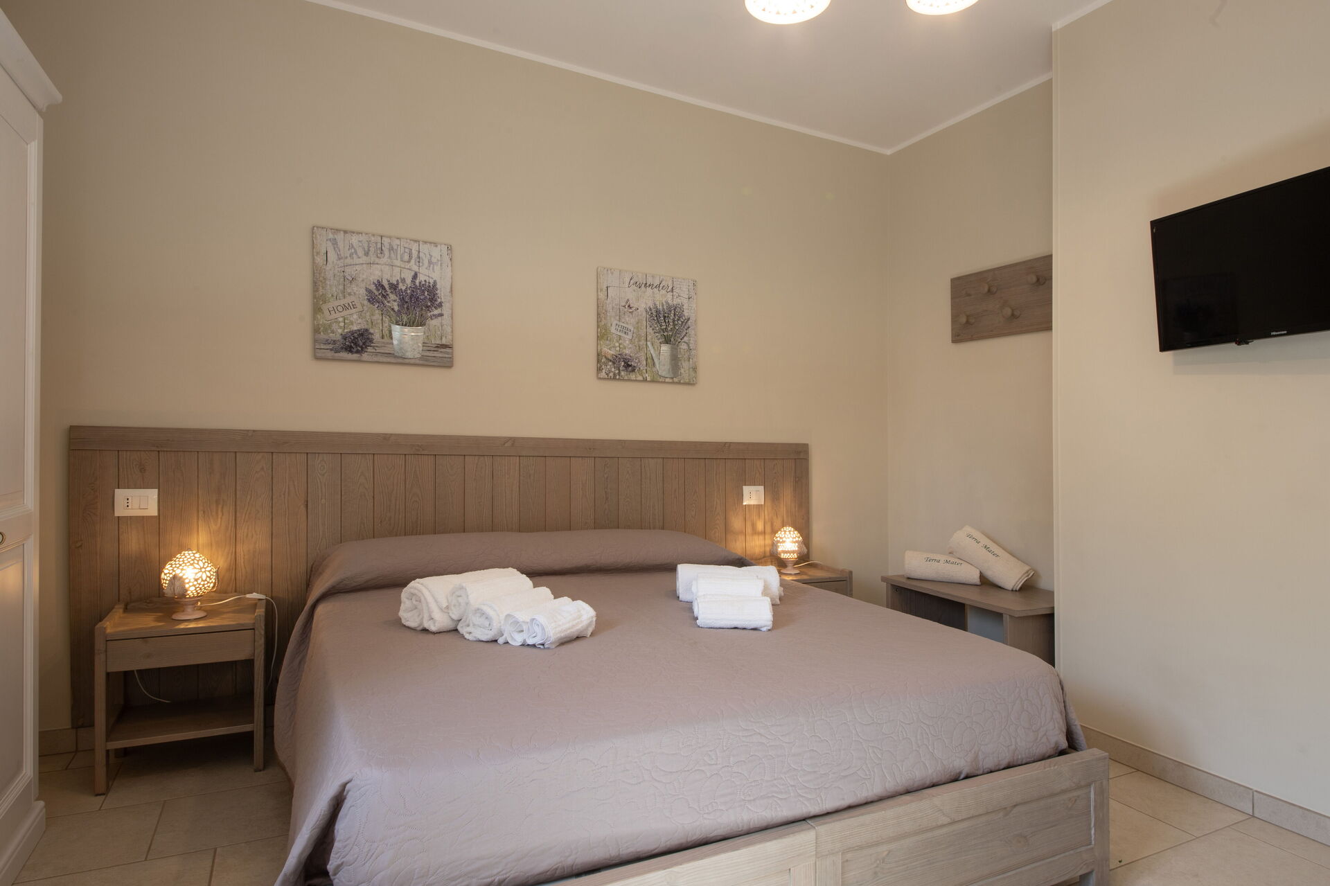 Piano terreno rialzato: soggiorno, 2 camere matrimoniali (aria condizionata, frigobar, tv, zanzariere) con bagno privato con doccia, camera con 2 letti singoli (aria condizionata, frigobar, tv, zanzariere) con bagno privato con doccia.