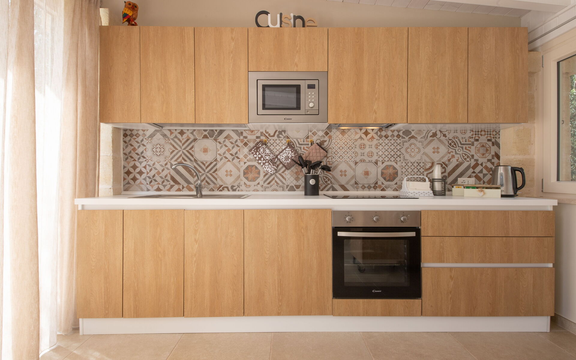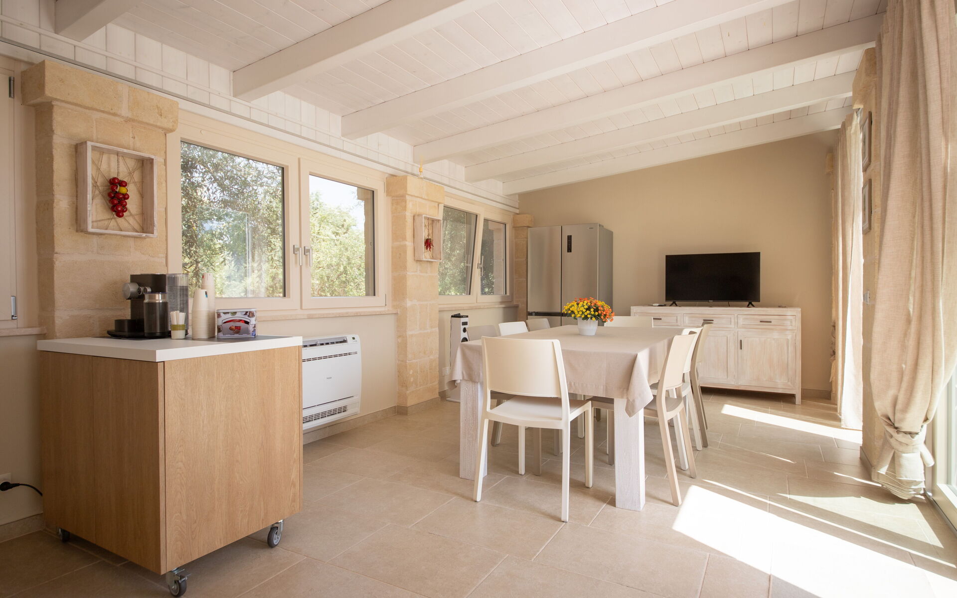 Piano terreno: luminoso soggiorno con zona pranzo (aria condizionata) e angolo cottura (piano a induzione, forno, microonde, tostapane, frigorifero).
