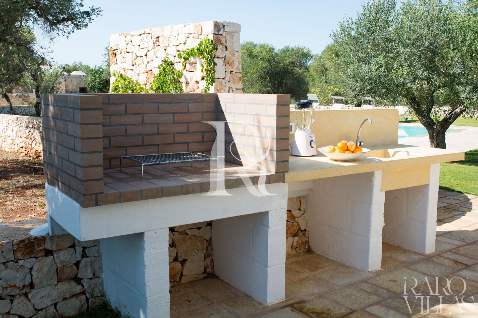 Arrivati in villa vedrete i bellissimi ulivi secolari e giardini ben curati. L'illuminazione esterna è l'ideale per sedersi la sera a mangiare sotto il pergolato, gustando il vostro piatto preferito al barbecue.
