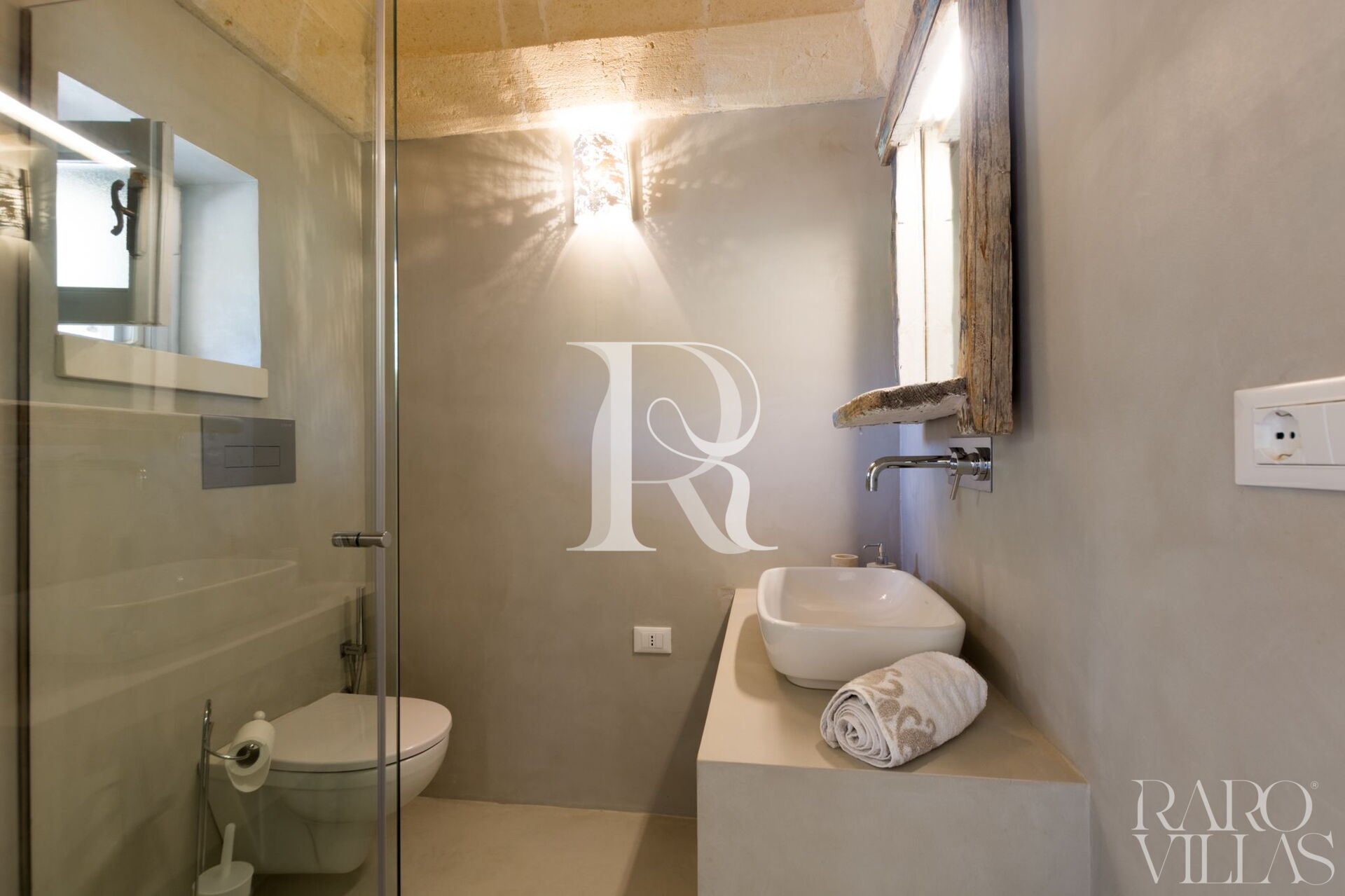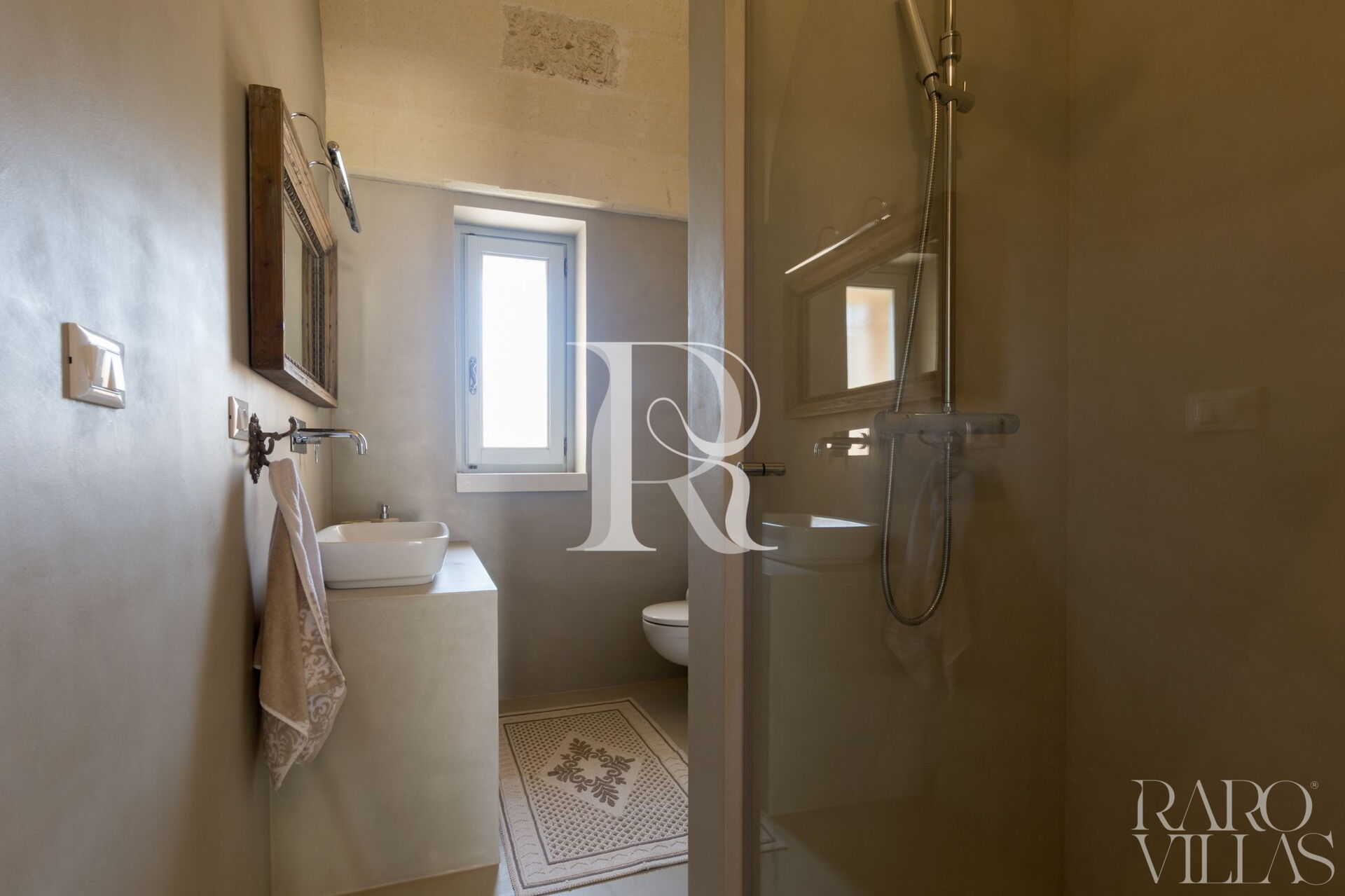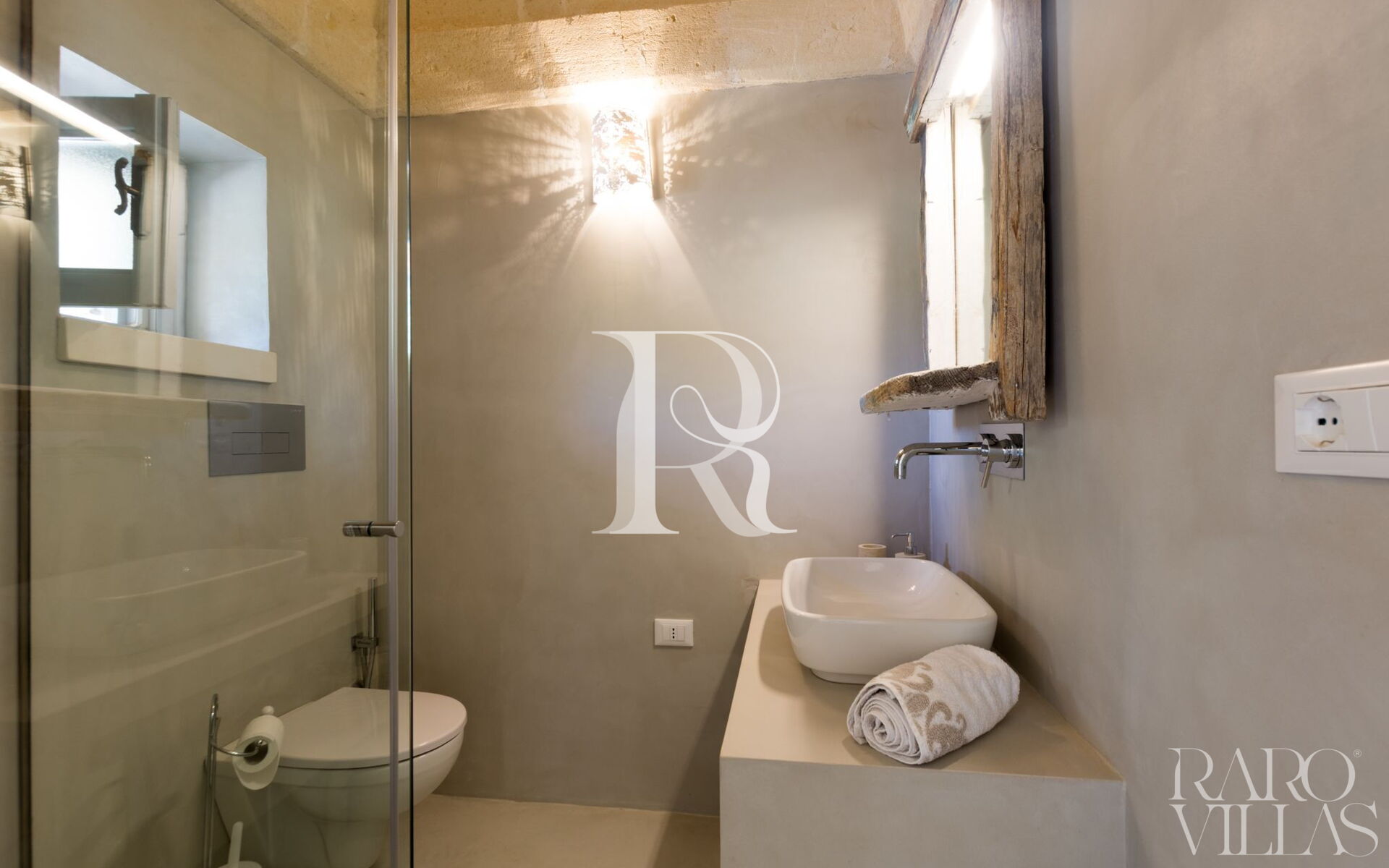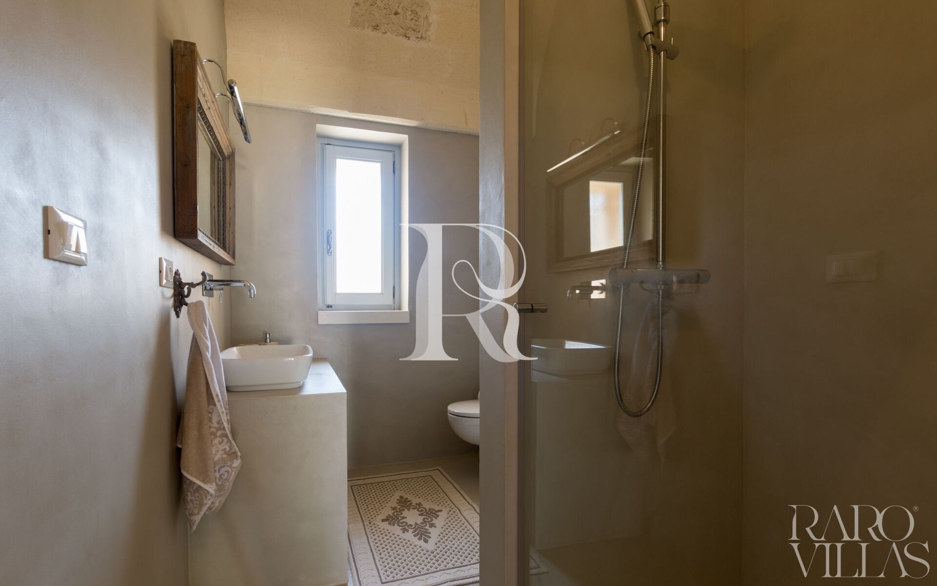 Servizi privati, che seguono lo stile delle altre due proprietà, ma individuali e unici. Con lo specchio in legno di recupero, un mix di vecchio e nuovo e progettato con gusto, doccia e WC.