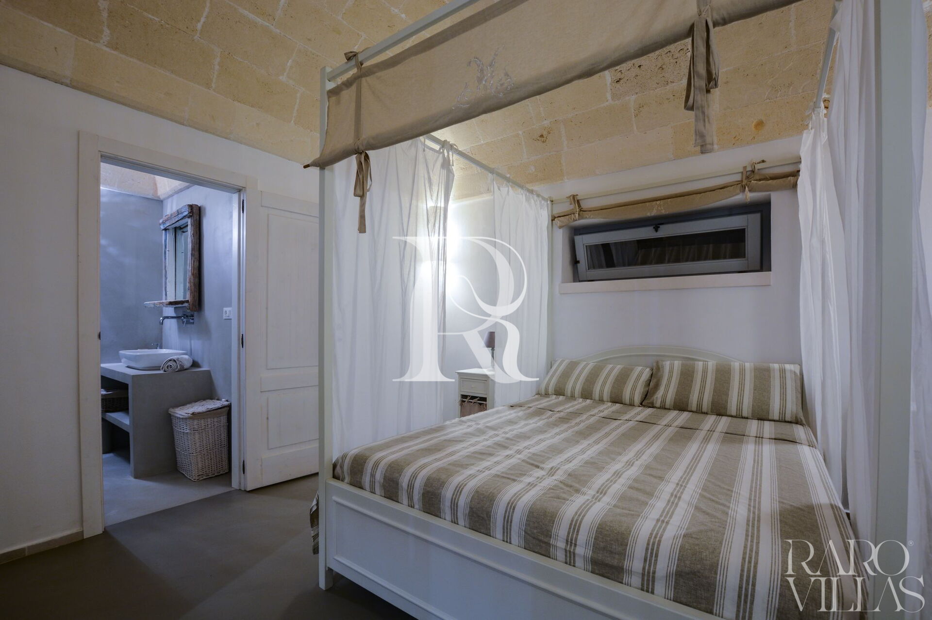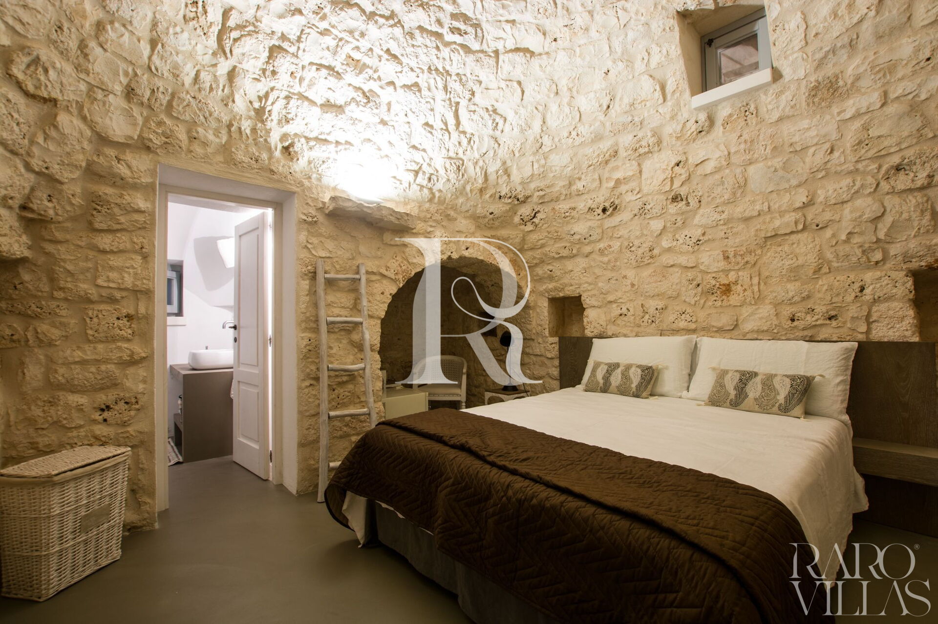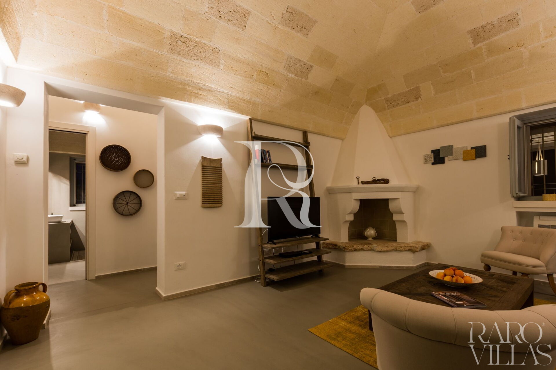 La prima casa è una Lamia appena ristrutturata composta da 2 camere matrimoniali, un bagno, con ampia doccia, bidet e wc. Lavello in ceramica, con rubinetteria cromata dal design ingegnoso, che si incastra a parete. Il lavandino si trova su una superficie in marmo e resina, che è su misura. Il restauro dei Trulli e delle Lamia è stato progettato nel rispetto delle tradizioni locali tramandate da artigiani nel corso di centinaia di anni.