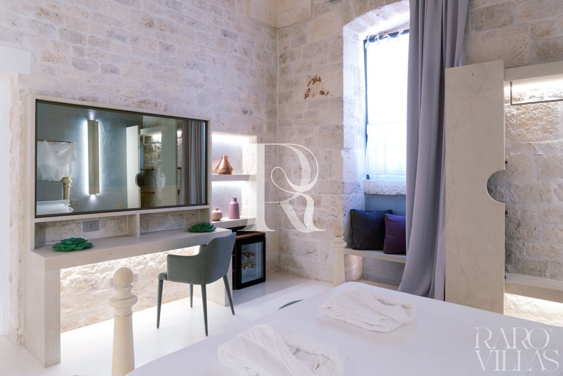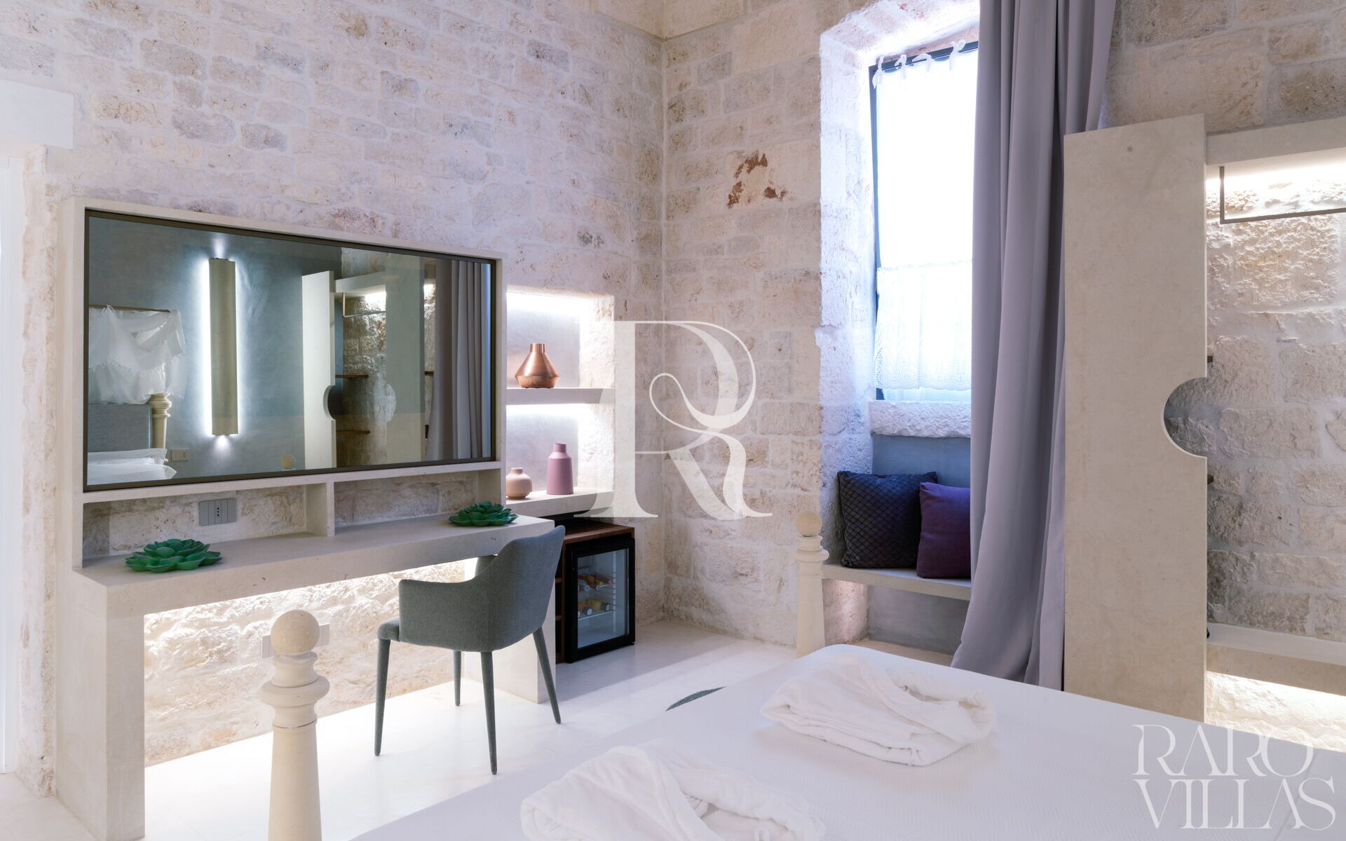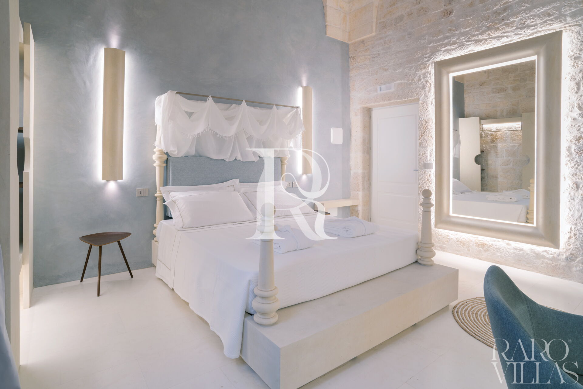 "Deluxe Vico Castello Deluxe" è un elegante camera da letto matrimoniale con bagno ensuite con muratura e volte in pietra all'interno di Palazzo Vico Bianco - Raro Rooms Collection.