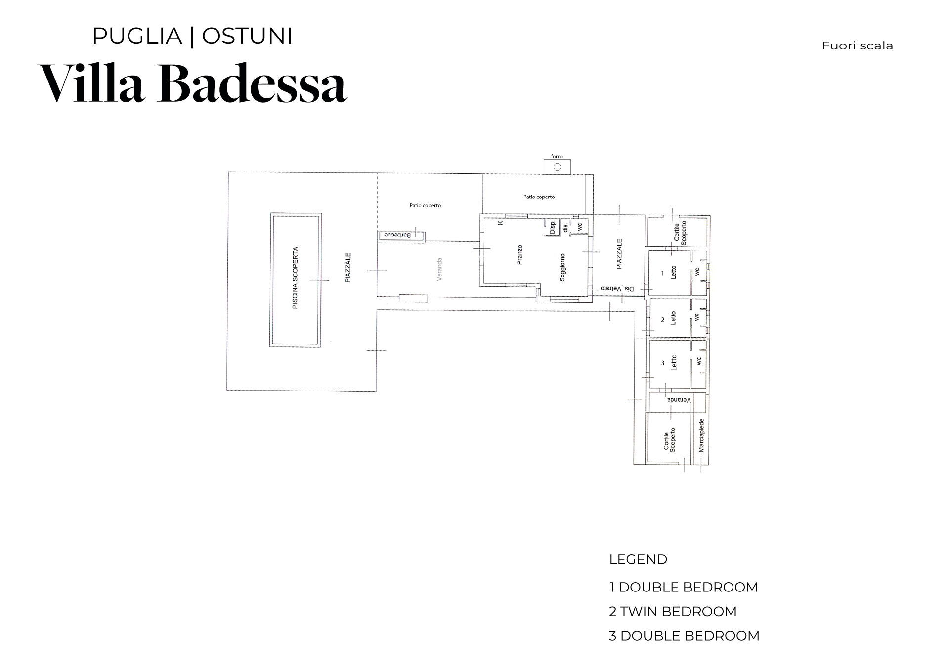 Tutte le camere da letto di Villa Badessa hanno ingressi separati ed indipendenti. La cucina, con sala da pranzo e soggiorno, ha i due accessi laterali e separa la zona giorno dalla zona notte con un pergolato intrecciato a vela (coperto).