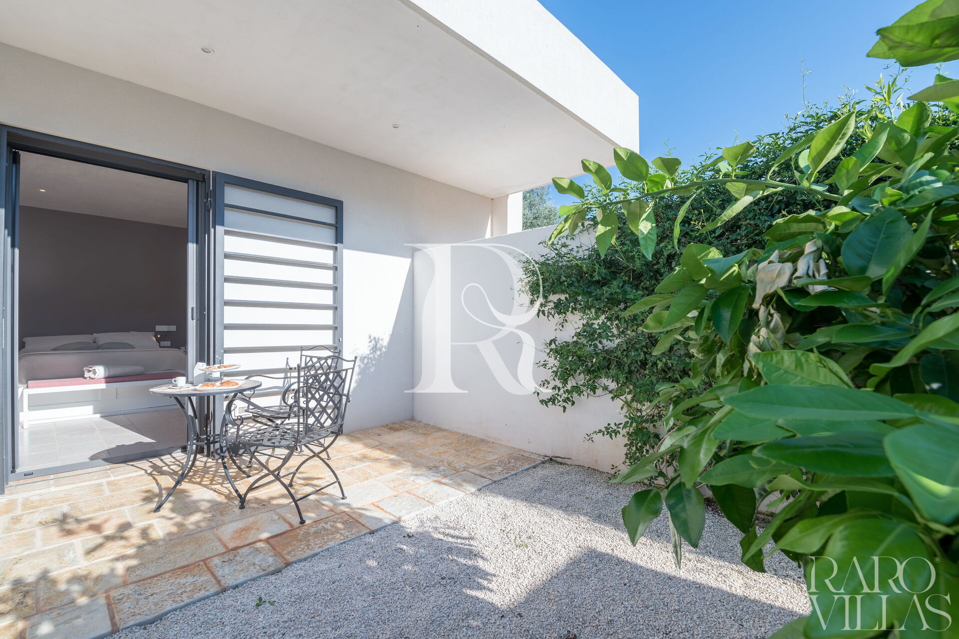 Le camere da letto sono isolate rispetto alla zona giorno. In linea continua con una pergola ombreggiate, si trovano le due camere padronali con cortile riservato e la camera centrale con i due letti singoli.Una delle due camere principali è provvista anche di TV.