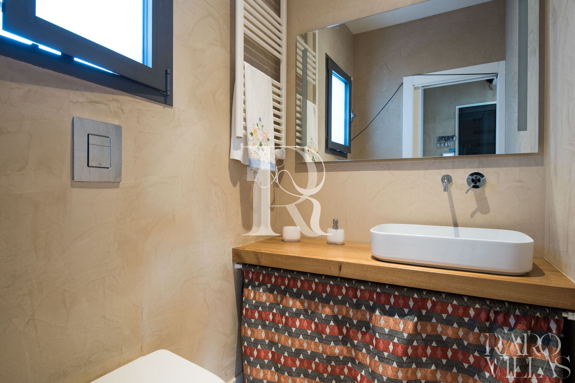Villa Badessa è composta dal moderno corpo centrale con veranda a sbalzo verso la piscina al quale sono collegate le tre camere da letto.