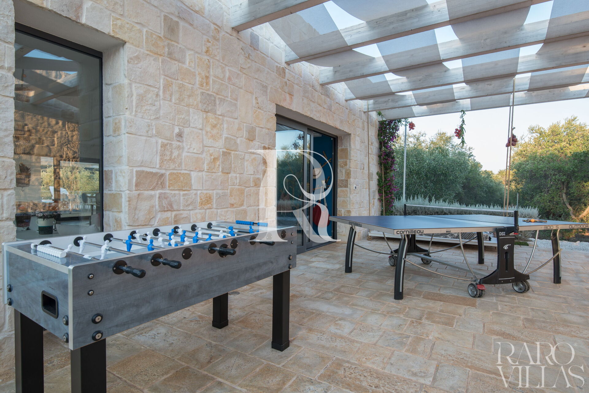 Nel collegamento tra la zona giorno e la zona notte, vi sono divani sospesi ad altalena con a disposizione degli ospiti il calcio balilla e il tavolo da ping-pong.