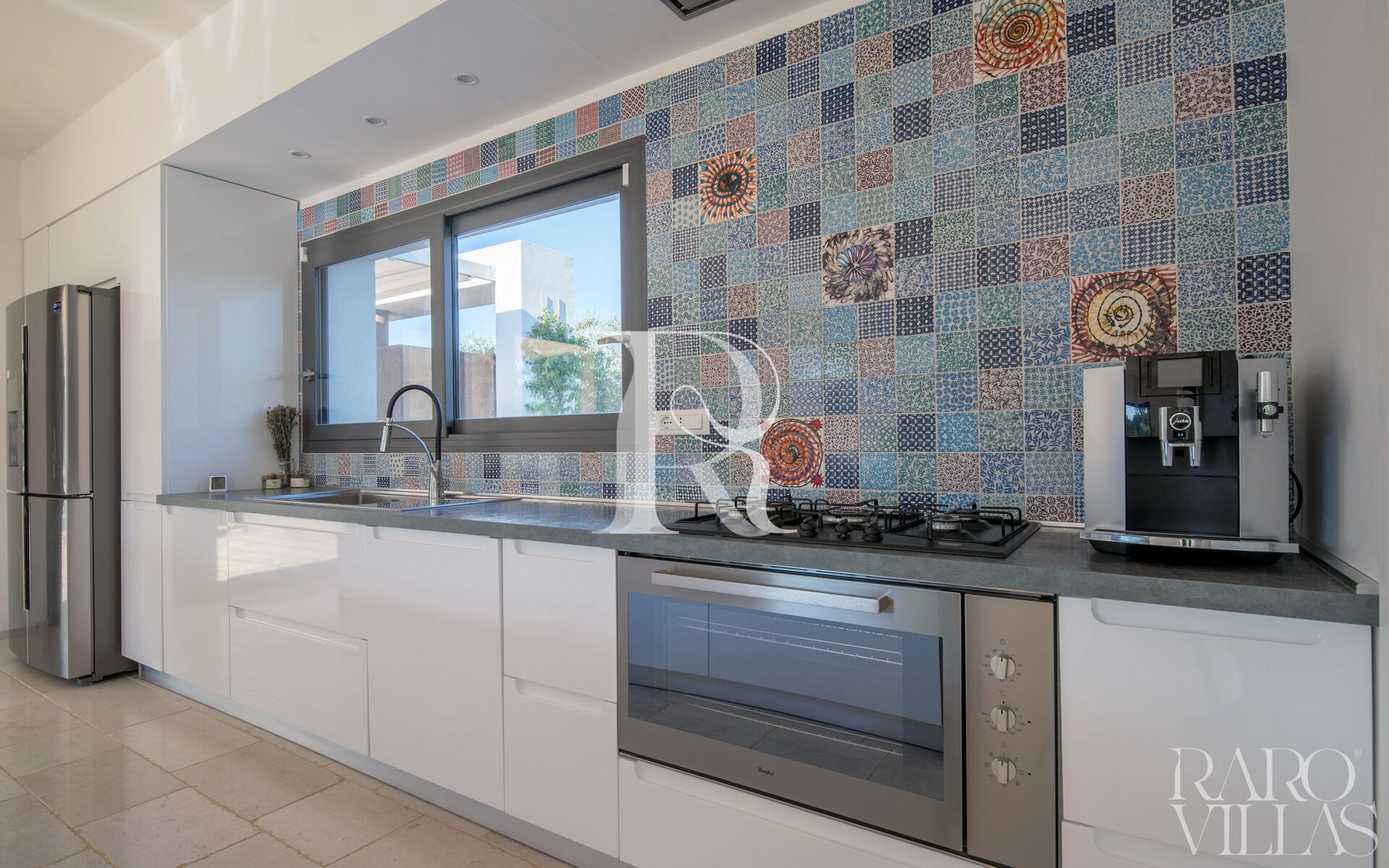 La cucina con ripostiglio e bagno di servizio, posta a lato rispetto alla lunghezza, è accessoriata di fornelli a gas con cappa nel contro-soffitto, forno elettrico, bollitore, macchinetta del caffè espressa, frigo con congelatore, lavabo. Fronte ad esso il bancone ad isola utilizzato come piano di lavoro o/e per colazioni.Sul lato opposto trova spazio il tavolo da pranzo che può ospitare fino a 8 persone. L’accesso verso la zona notte trova i divani con la Smart TV e la finestra con il caminetto a bioetanolo nel basamento (non utilizzabile).