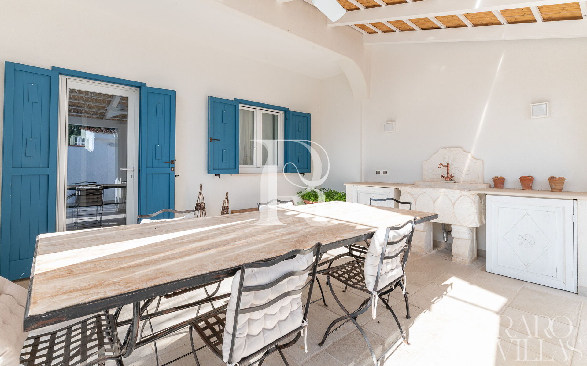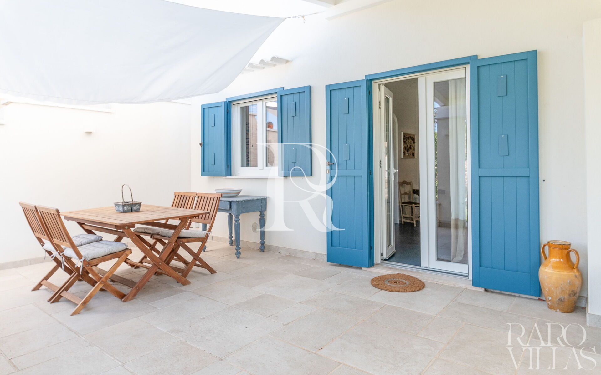 La villa possiede un ampio patio dove è presente un tavolo da pranzo con possibilità di mangiare all'aperto.