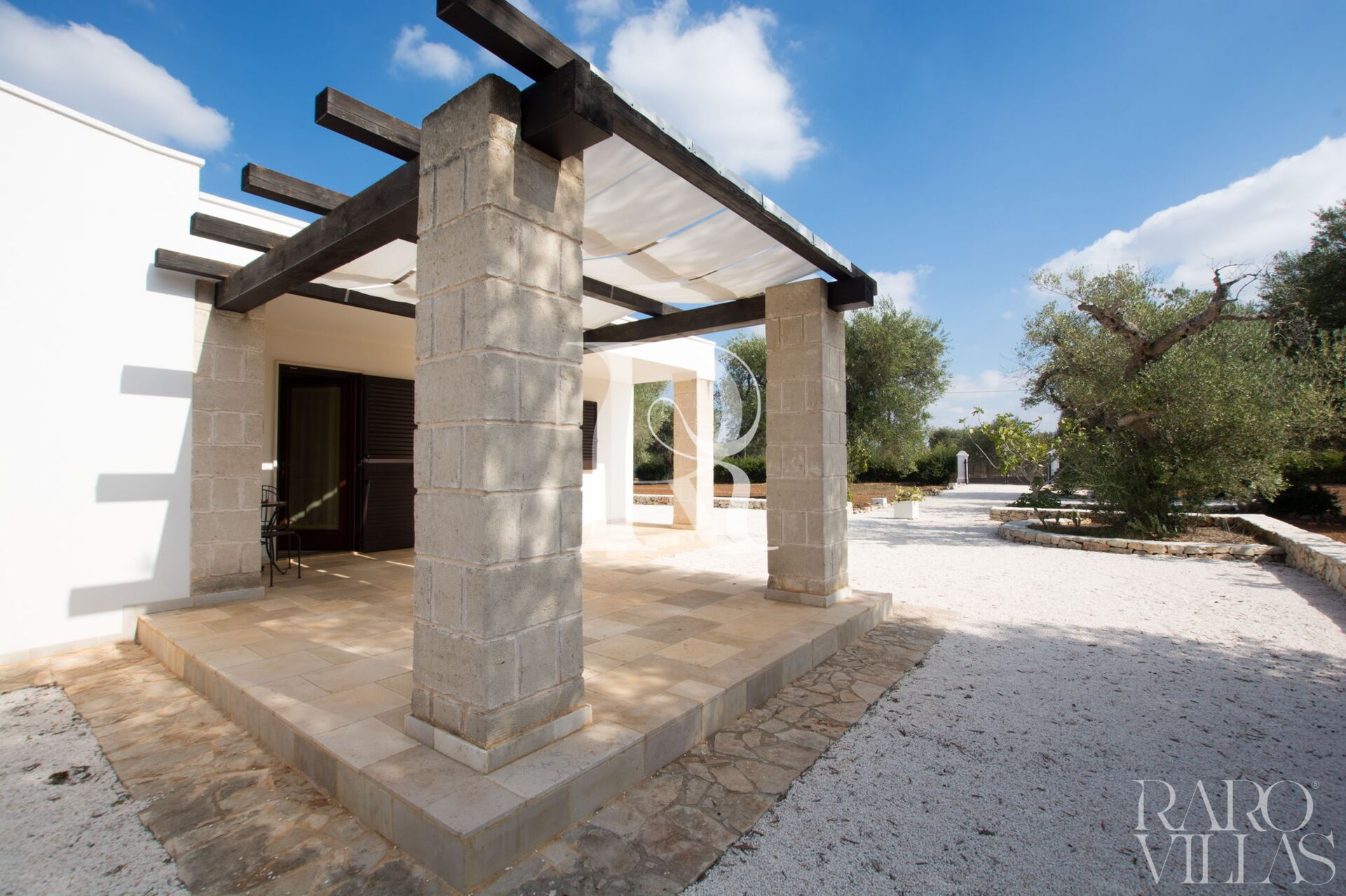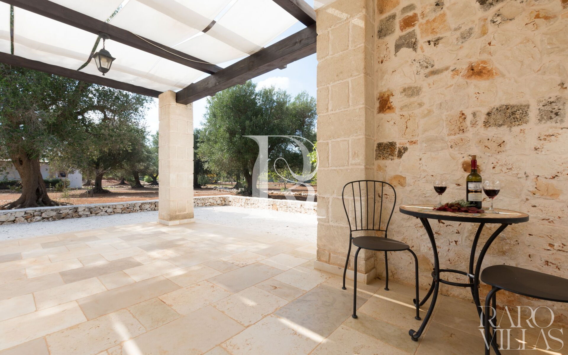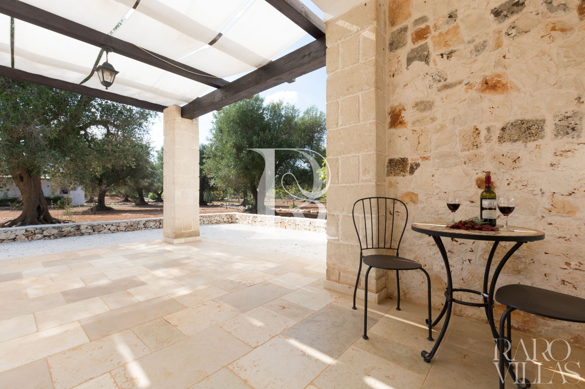 La villa è composta all'esterno da un'ampia veranda coperta da un pergolato dove è possibile rilassarsi all'ombra e dove è posto anche un tavolino per consumare delle deliziose colazioni con la vista della splendida campagna di alberi di ulivo secolari.