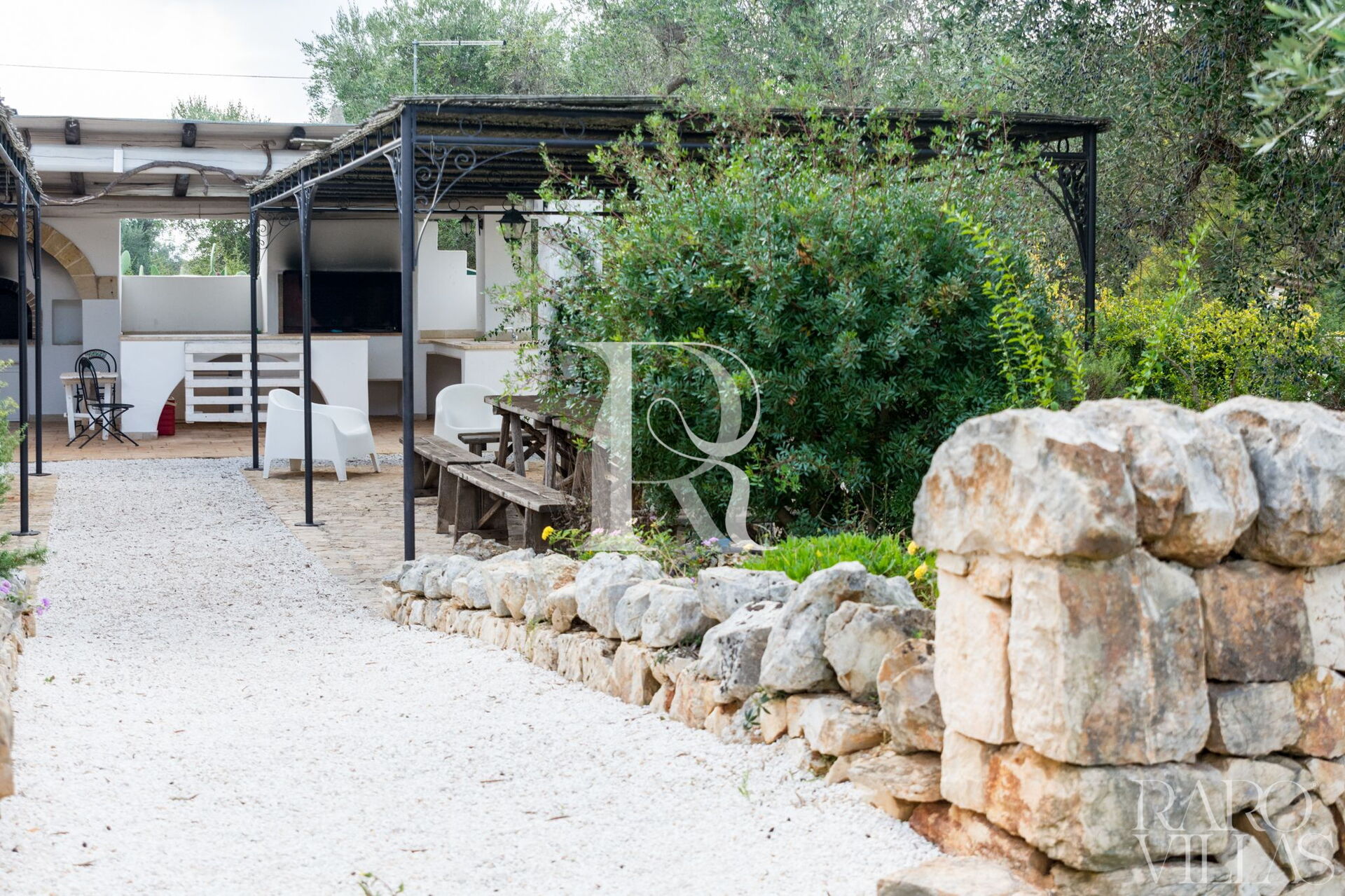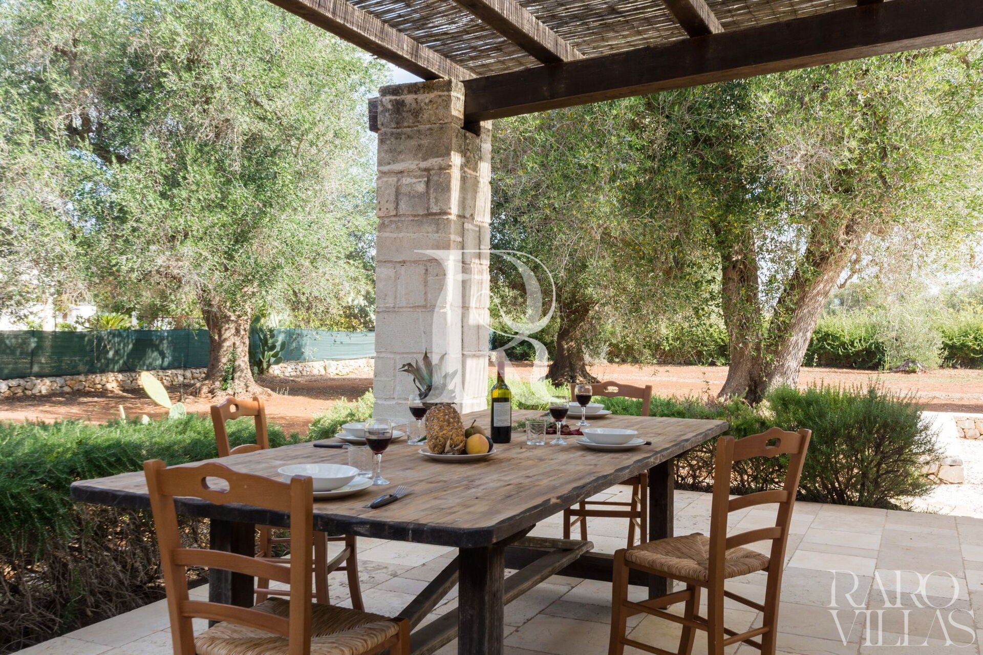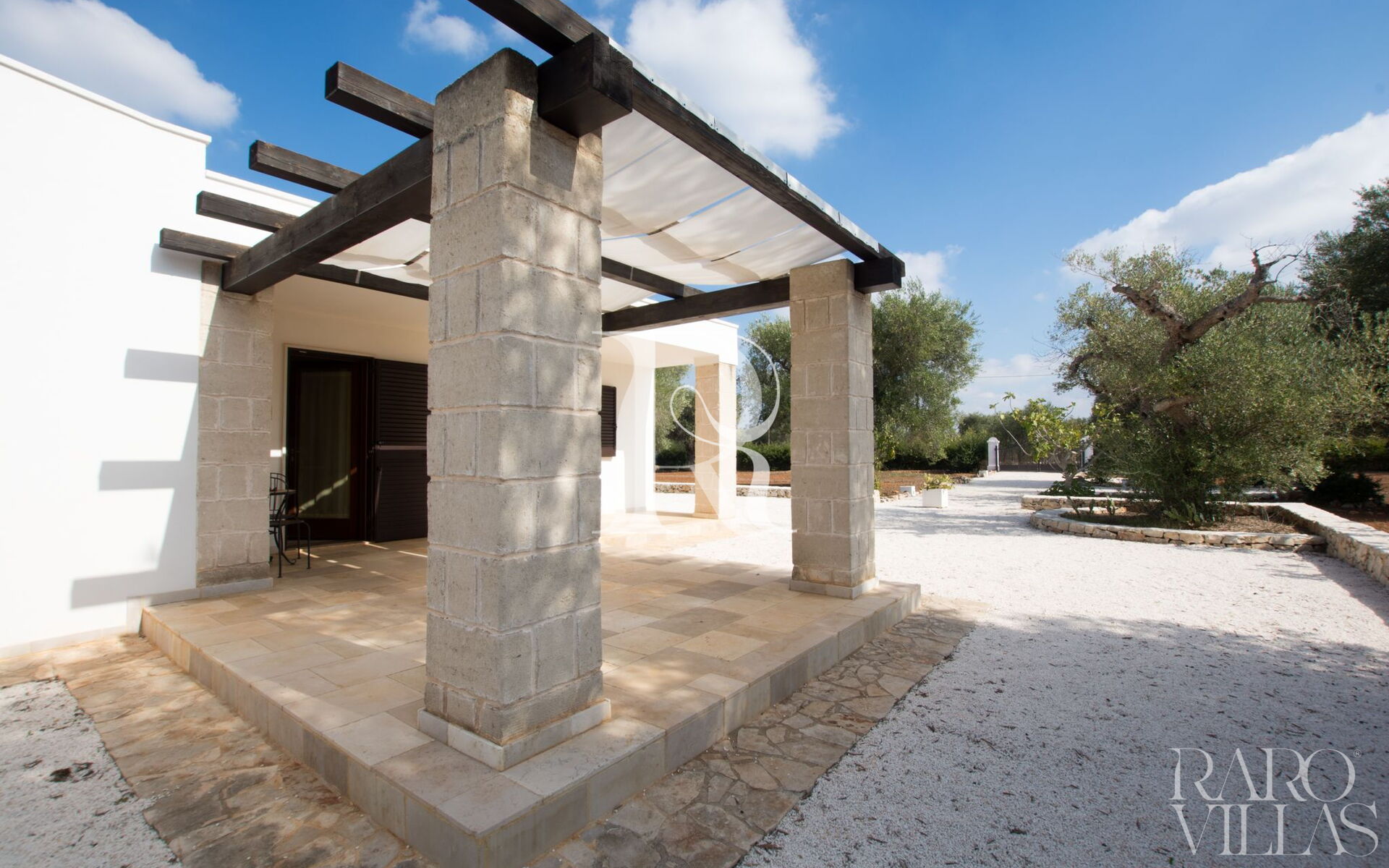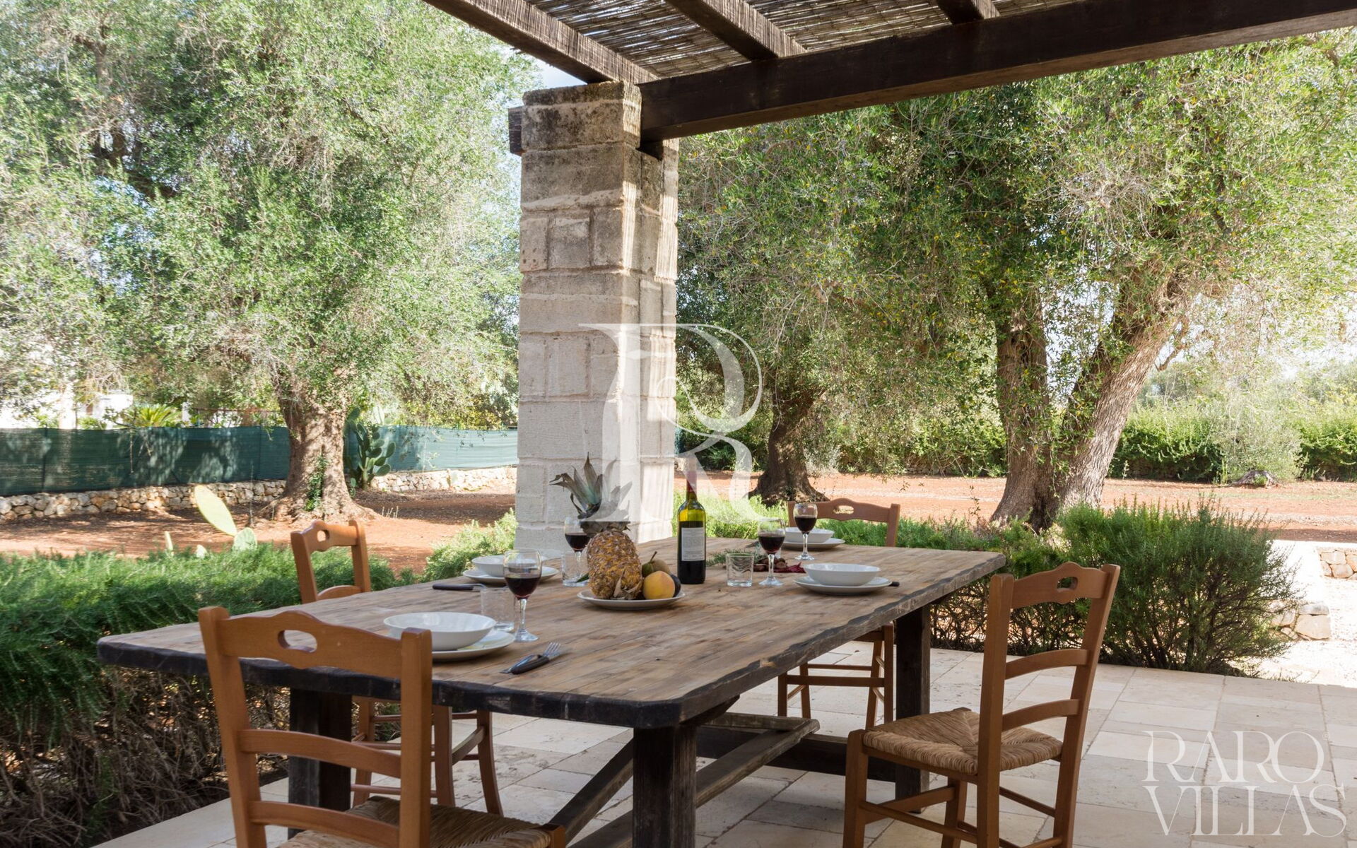 La villa è composta all'esterno da un'ampia veranda coperta da un pergolato dove è possibile rilassarsi all'ombra e dove è posto anche un tavolino per consumare delle deliziose colazioni con la vista della splendida campagna di alberi di ulivo secolari.