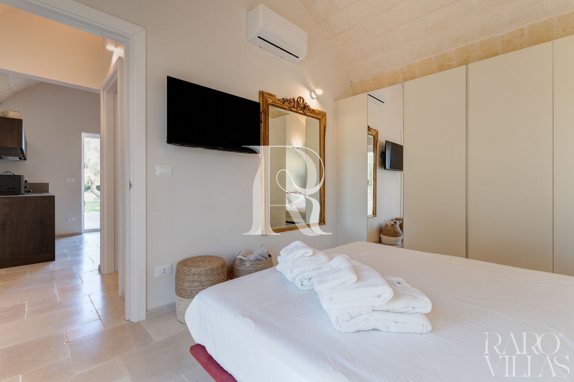 Dependance: Soggiorno (18 m2): aria condizionata, internet WIFI, zanzariere, uscita sul giardino. Camera da letto con bagno (21.5 m2): letto matrimoniale (larghezza: 1.6m, lunghezza: 1.9m), asciugacapelli, wc, bidet, lavandino, doccia, internet WIFI, aria condizionata, uscita sul giardino, zanzariere. Novità 2026 - Suite adiacente area living: aria condizionata, letto matrimoniale, armadio, televisione, bagno esclusivo (doccia, lavandino, wc), uscita sul giardino.