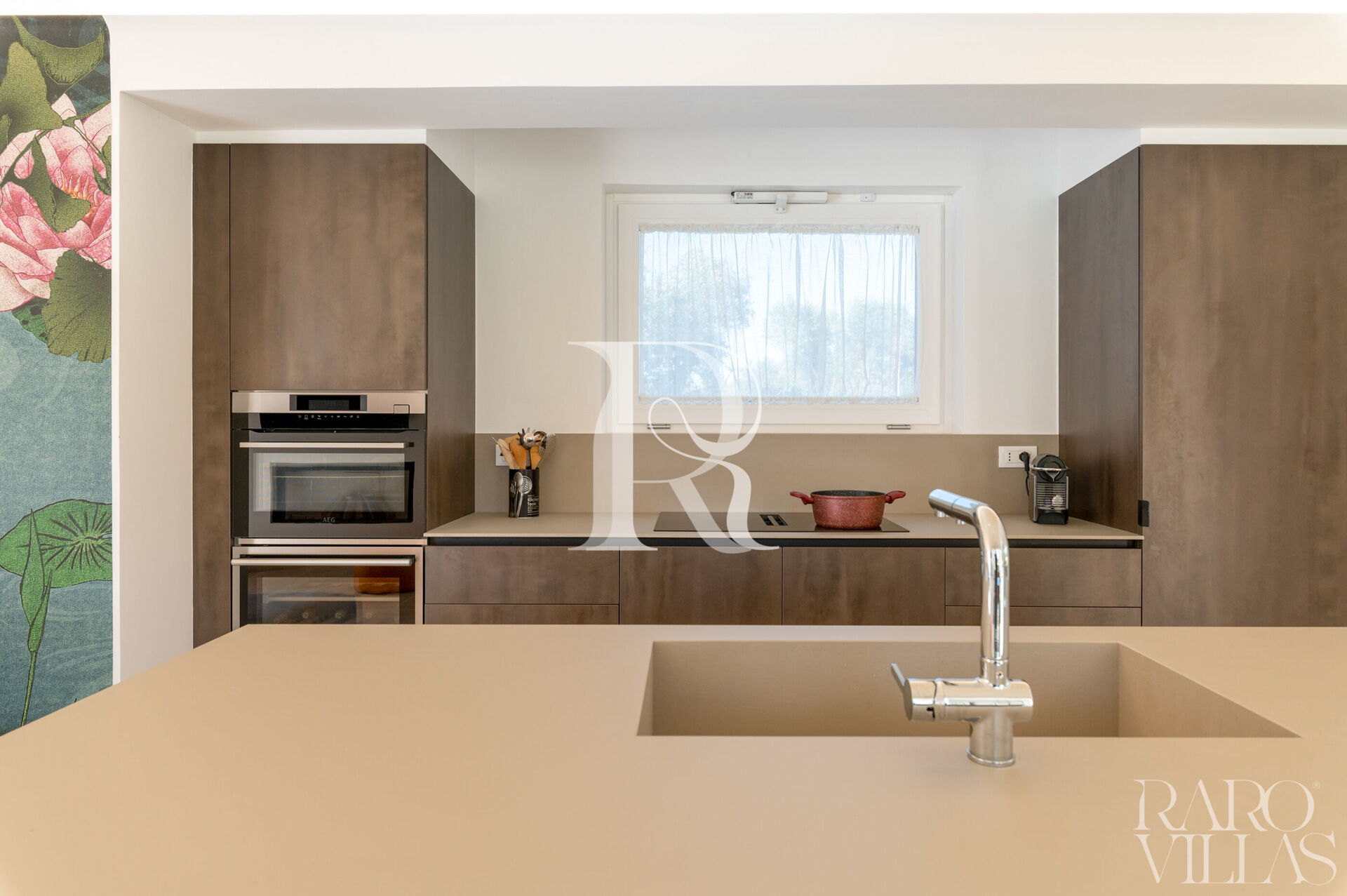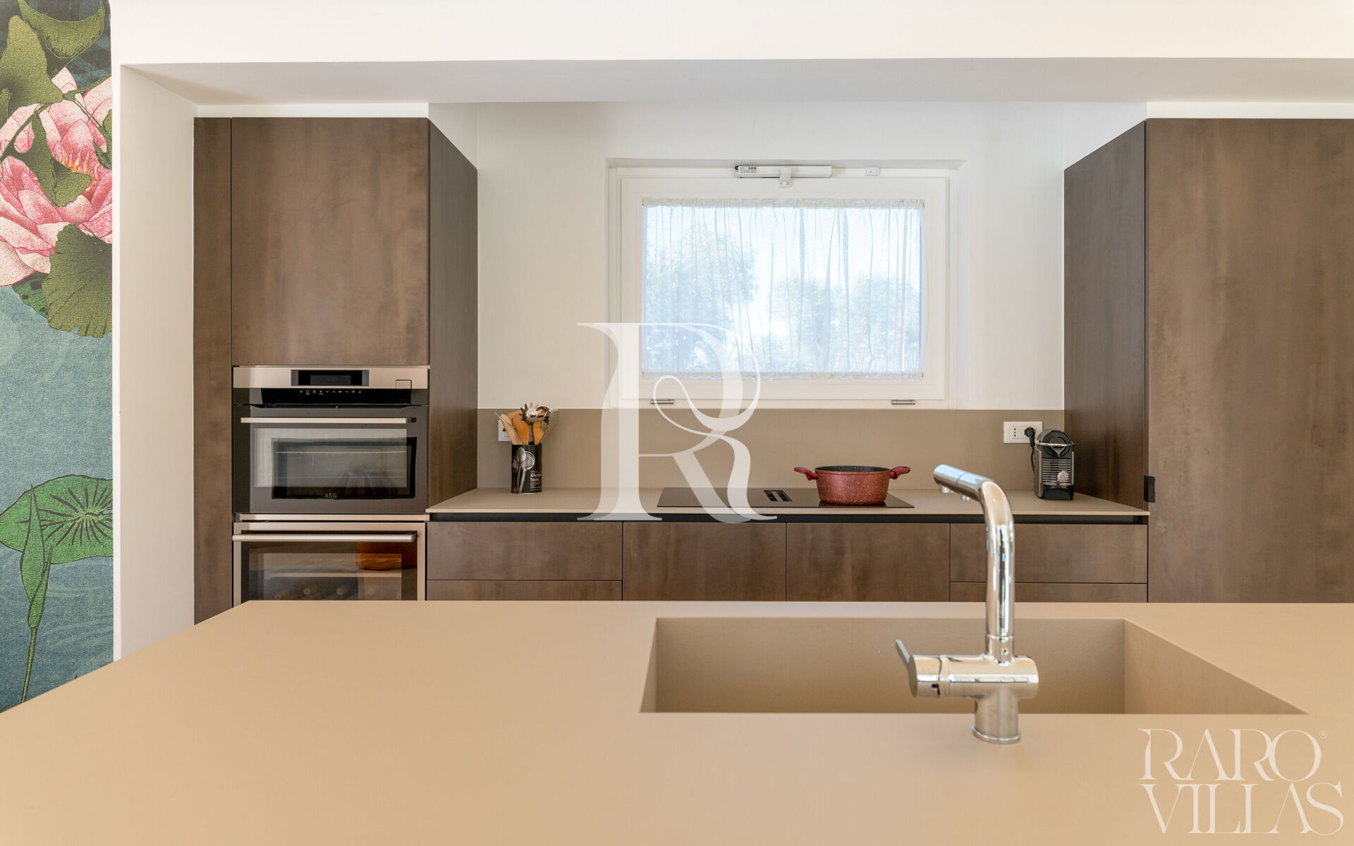 - Cucina a vista con isola centrale, completamente attrezzata (forno, frigorifero, lavastoviglie, stoviglie, cantinetta dei vini).