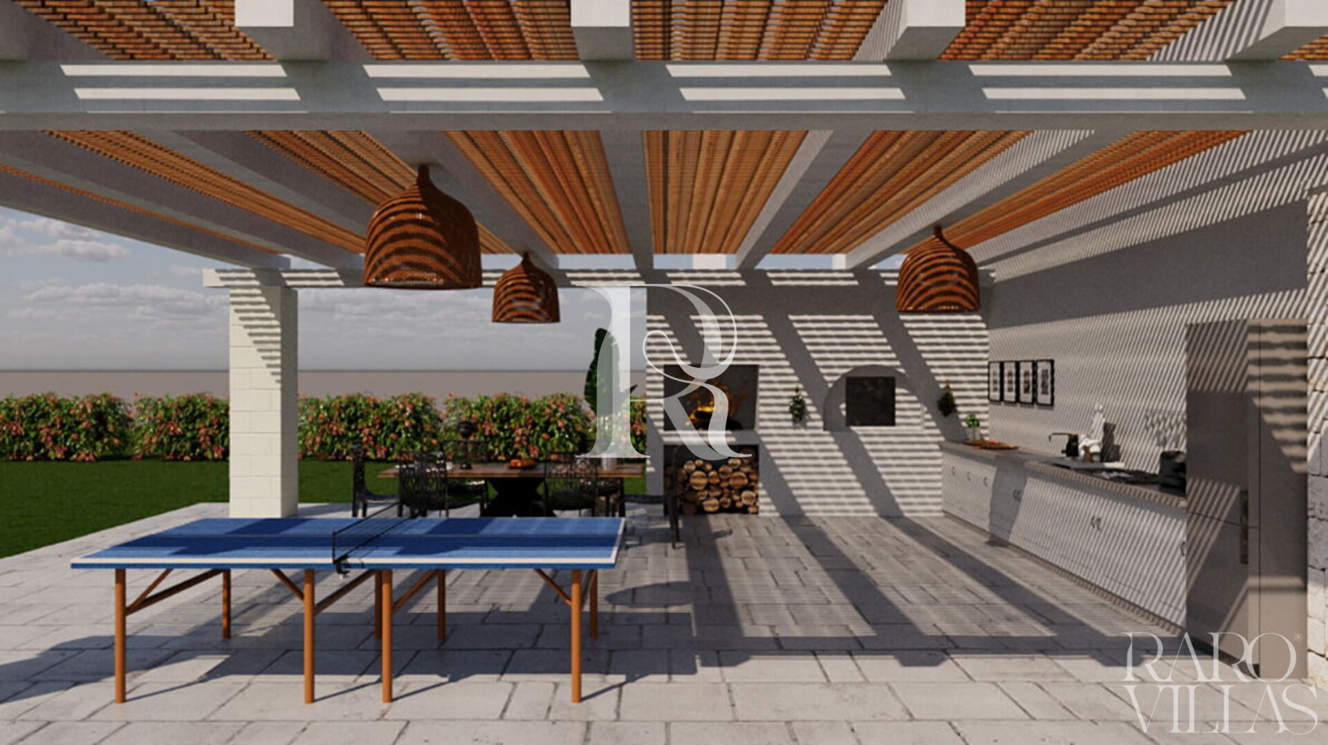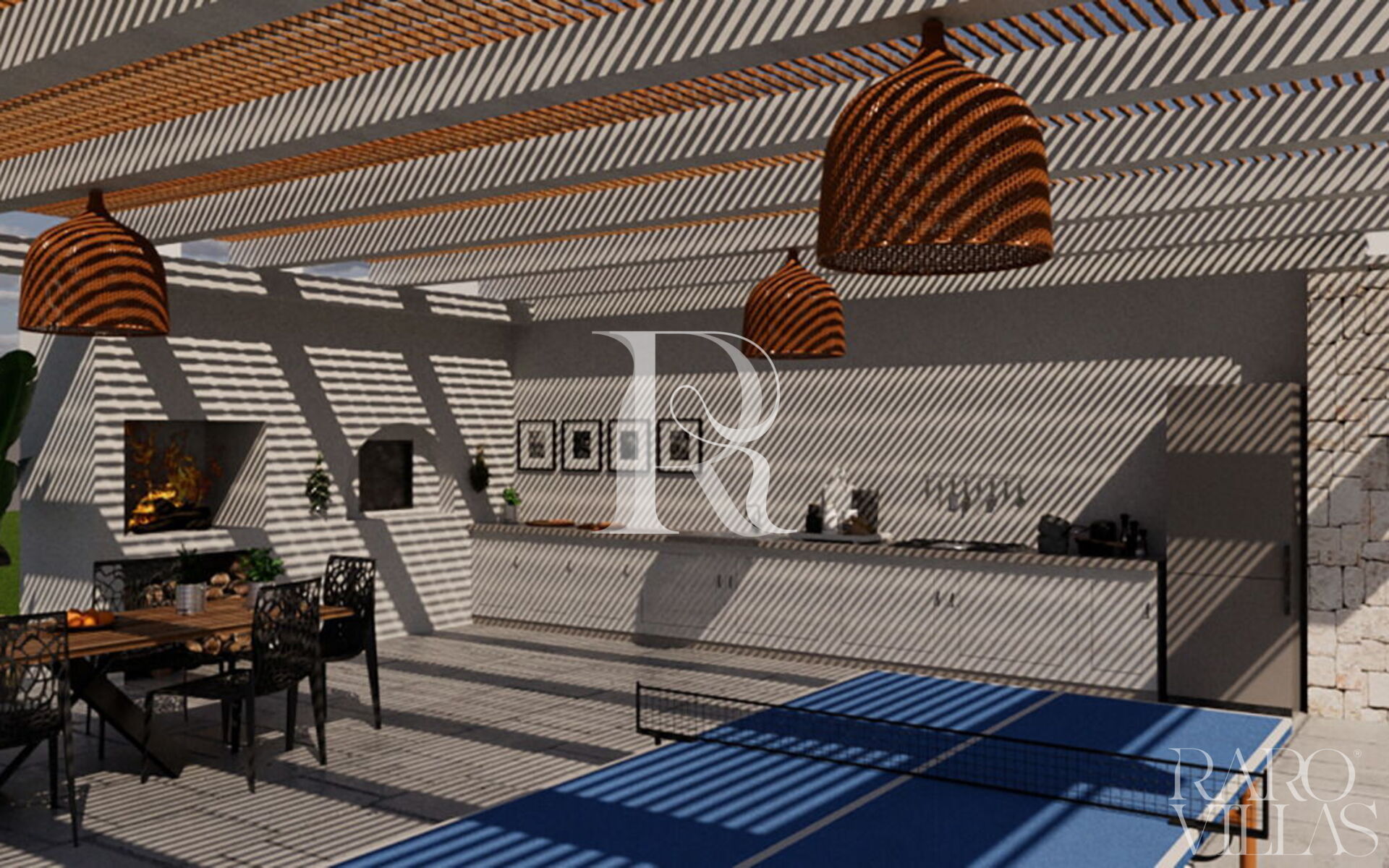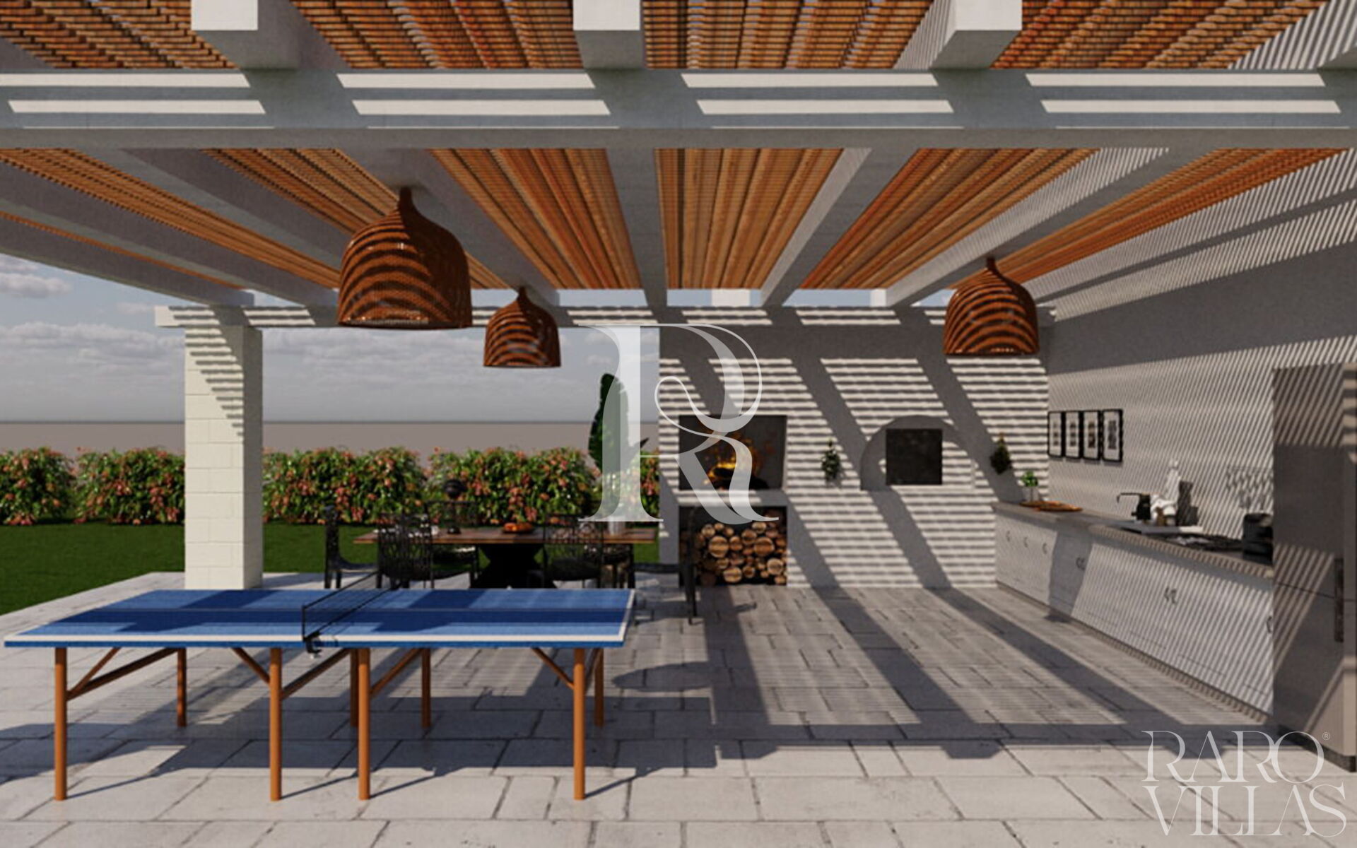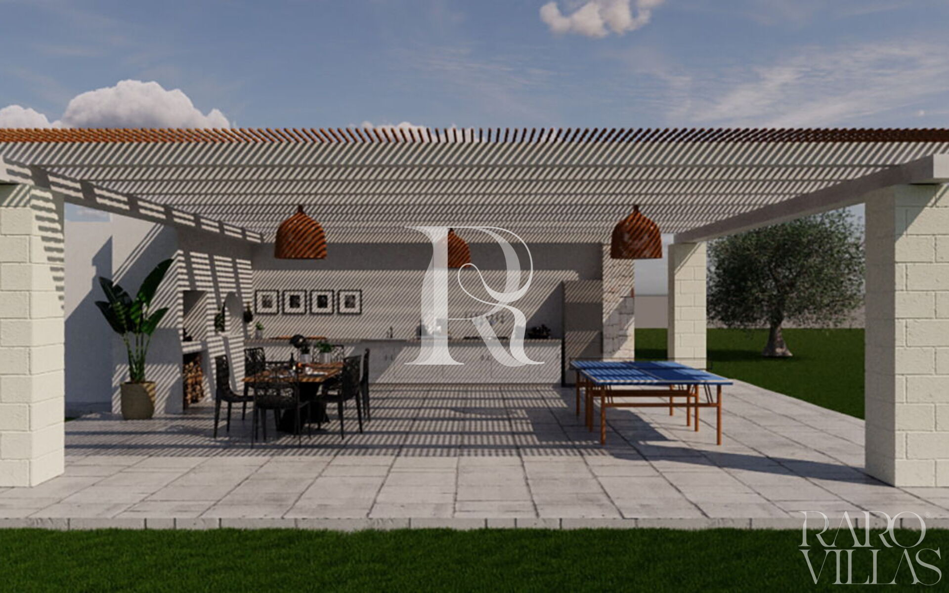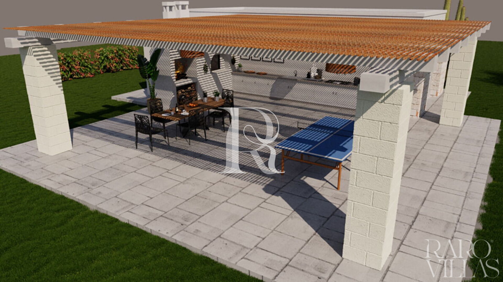- **Nuova zona esterna (80 mq coperta):** un'area living completa di forno a legna per pizza, barbecue, piastre ad induzione, lavandino, lavastoviglie, frigorifero, ampio piano di lavoro e tavolo con 10 sedie. L'area include un bagno di servizio dedicato, ping pong e calcio balilla.