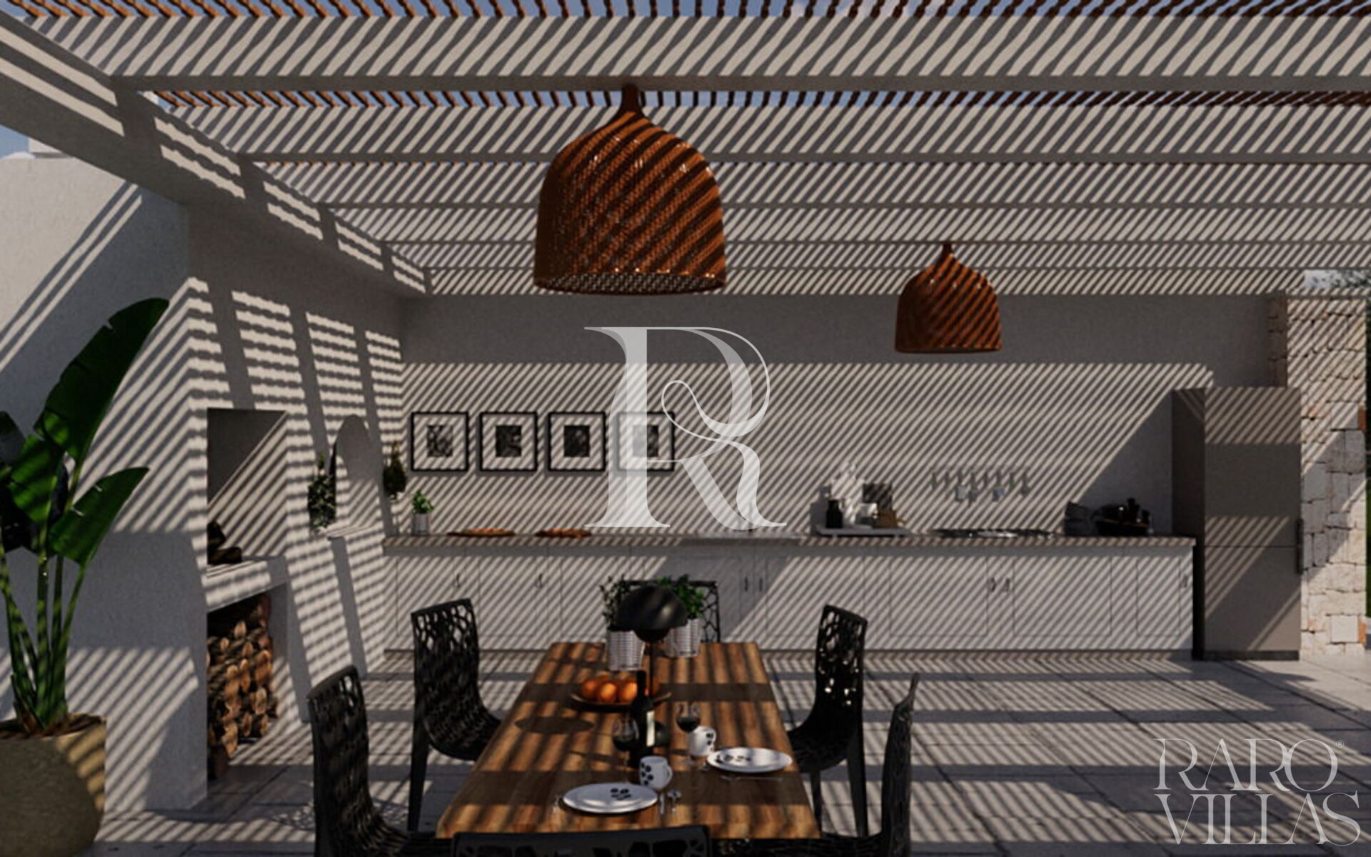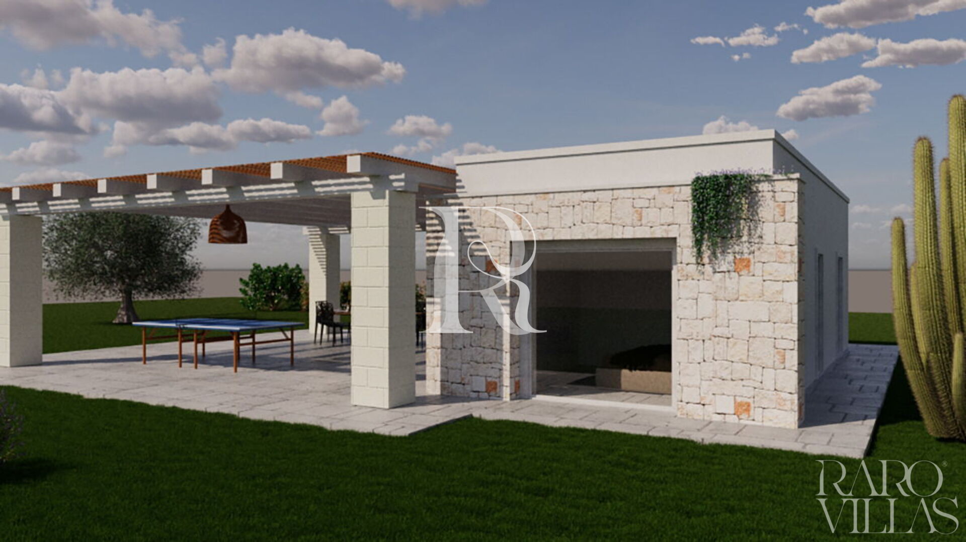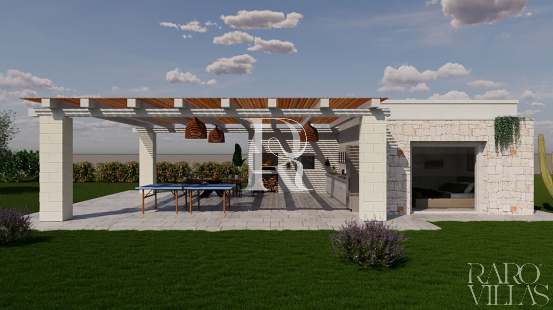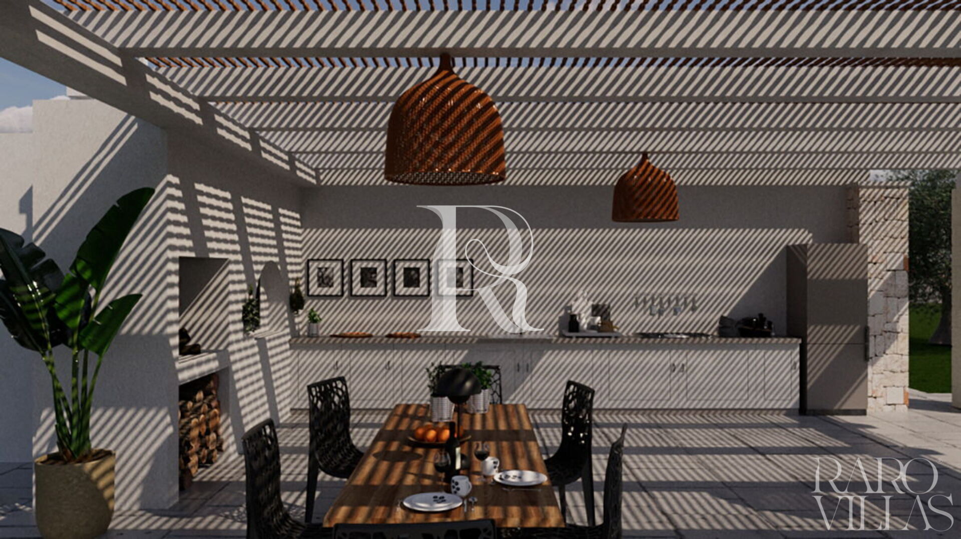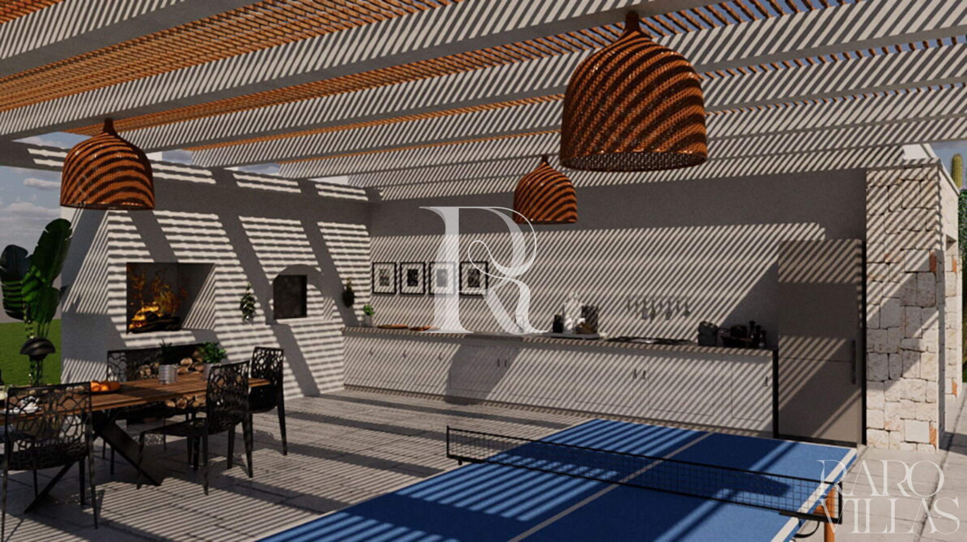 - **Nuova zona esterna (80 mq coperta):** un'area living completa di forno a legna per pizza, barbecue, piastre ad induzione, lavandino, lavastoviglie, frigorifero, ampio piano di lavoro e tavolo con 10 sedie. L'area include un bagno di servizio dedicato, ping pong e calcio balilla.