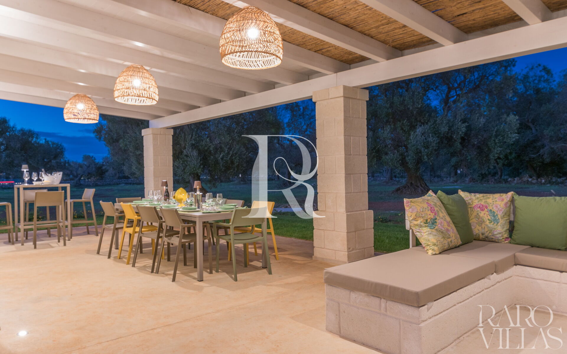 - Un patio coperto: davanti al trullo, arredato con tavoli e sedute confortevoli per pranzi o cene.