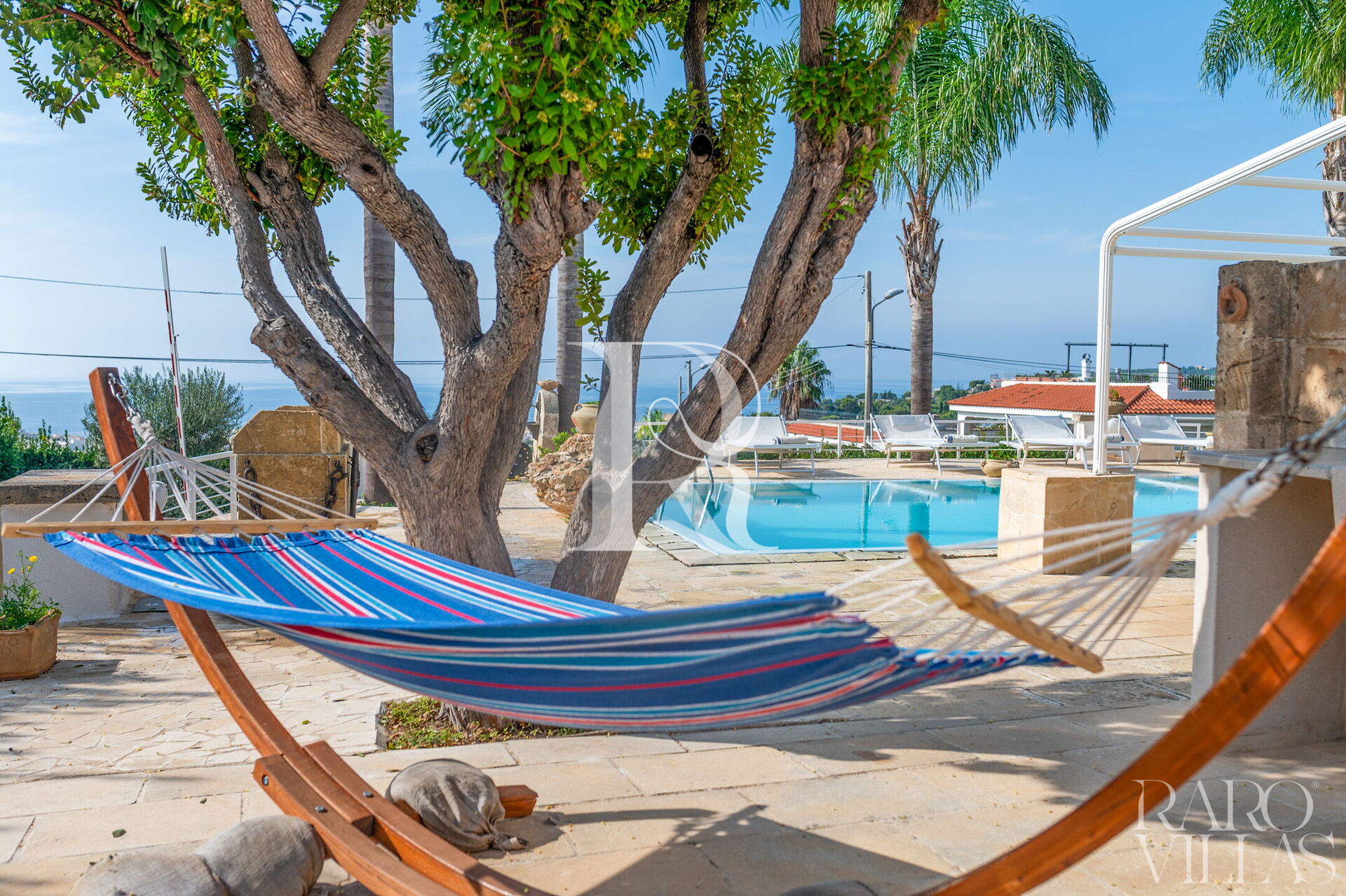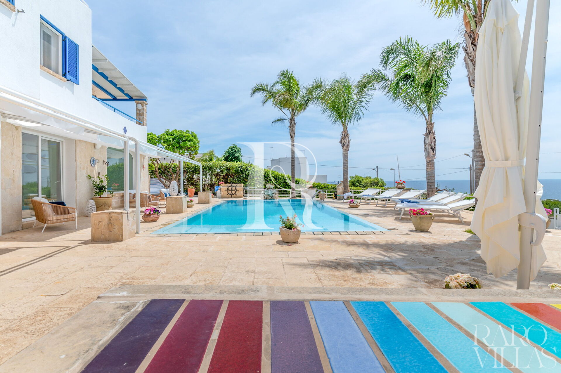 Una splendida piscina privata domina il paesaggio circostante, regalando una vista mozzafiato sul litorale di Santa Maria al Bagno. Circondata da lettini prendisole, ombrelloni e palme, è il luogo perfetto per rilassarti e goderti il sole.