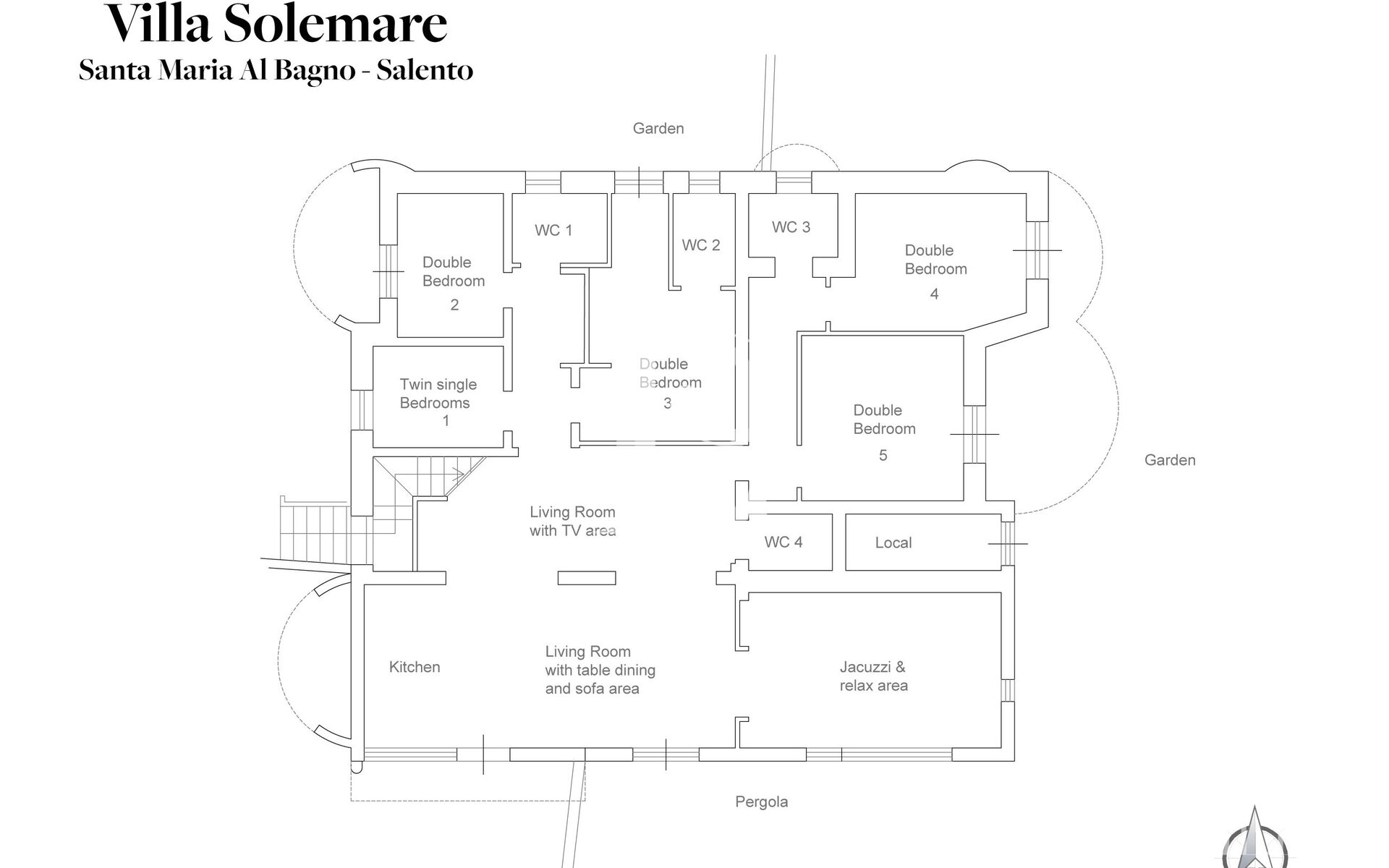 Sarà a vostro esclusivo utilizzo la piscina ed il giardino. L’alloggio è composto da cinque camere da letto (una tre camere matrimoniali, una camera con letto alla francese, una camera con due letti singoli) e quattro bagni e può ospitare fino a dieci persone. Completa la villa in affitto al piano terra il grande soggiorno con sala da pranzo con bagno di servizio, la cucina completa, la jacuzzi interna che guarda al giardino, i patii coperti e la piscina a skimmer di 15x4m.